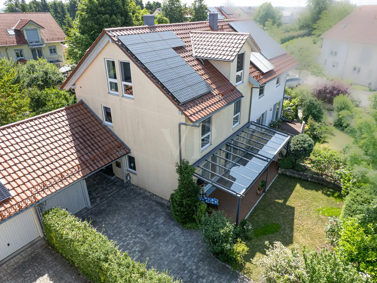 Welcome to your new home. A place full of light, spacious rooms and loving details that combines modern living comfort with sustainable energy efficiency. Everything you need for a harmonious family life awaits you here, a place where you can grow, laugh and make memories together. On the first floor, a stylish, open-plan living and dining area opens up, combining warmth and elegance with fine real wood veneer parquet flooring and a cozy wood-burning stove. People play, laugh, eat and relax in this central heart of the house. Generous sliding glass doors open onto a covered terrace with an elegant glass roof and electrically controlled awnings, ideal for lively barbecue evenings or quiet moments in the open air. Upstairs, you will find a comfortable family bathroom with a walk-in shower, bathtub and two washbasins, ensuring a relaxed start to every day. The spacious master bedroom promises restful nights, while the children's room offers a protected space for imagination and security. Another room serves as a quiet retreat for concentrated work, inspiring reading or creative projects. On this level too, the well thought-out architecture ensures a bright, friendly living atmosphere. There are two further children's rooms on the top floor, which create little oases of well-being with their mixture of light and cozy sloping ceilings. They are perfect for creative hours, concentrated study and quiet breaks. A private bathroom rounds off the comfort here too, making it easy to cope with the morning rush. The basement opens up a spacious hobby room that can be designed entirely according to your wishes. Whether as a games paradise, home cinema, fitness area or studio, everyone will find their own personal favorite spot here. This level is complemented by a practical storage room and a separate utility room that discreetly houses the modern building services. This home is rounded off by a single garage, a carport and an additional outdoor parking space. An efficient heat pump in combination with a powerful photovoltaic system ensures a sustainable energy concept that protects both the environment and your budget and raises living comfort to a new level. This semi-detached house is far more than just four walls. It is a place full of warmth, openness and light, where everyone finds their place and enriches family life in a special way