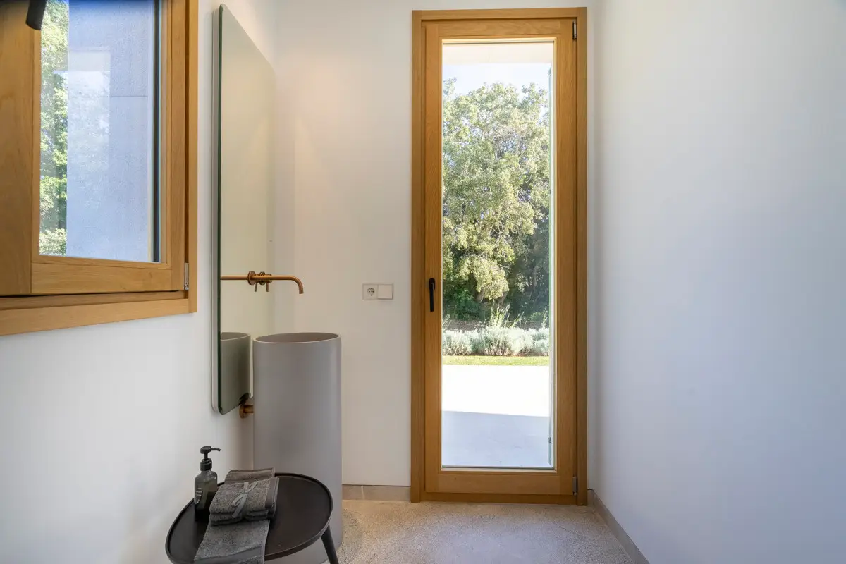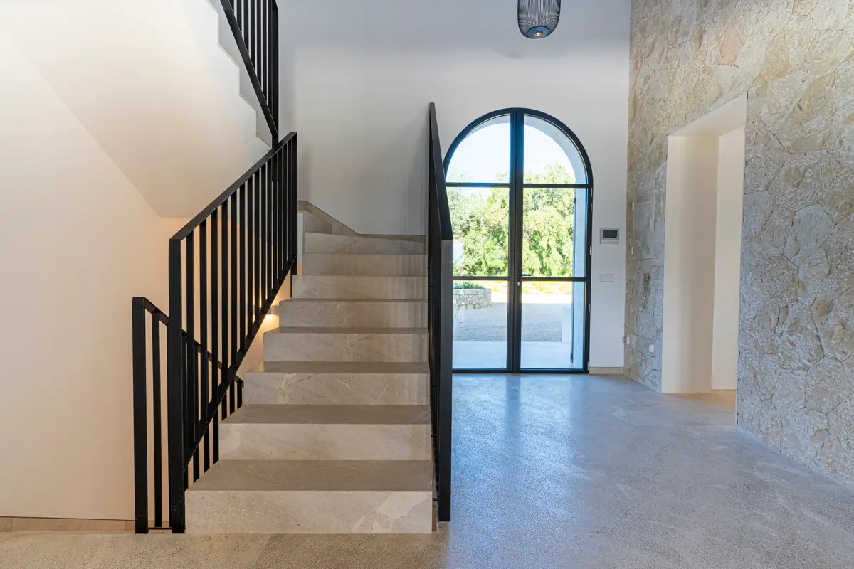 Welcome to "Ca'n Marina" - a luxurious house on a stunning plot near the historic town of Pollensa, in the north of Mallorca. The property extends over a living space of approximately 405 m² and is located on a spacious plot of approximately 14,121 m². With five rooms, four bedrooms and five bathrooms, this property offers enough space for a large family or guests. The construction of the house meets the highest standards in terms of design and technical equipment. The main focus was to perfectly integrate the property into its natural surroundings and offer panoramic views over the surrounding landscape. Inside the house you will find a spacious and well thought out layout. The high entrance hall leads into a bright living room with an adjustable fireplace that separates the dining and living areas. The tailor-made kitchen is an absolute highlight and has high-quality fittings. An en suite bedroom with access to a private terrace, a utility room and a cloakroom complete the ground floor. The first floor houses two further bedrooms with bathrooms as well as a magnificent master suite with dressing area and sauna. From here you have a wonderful view of the surrounding landscape. Two of the bedrooms have direct access to the large balcony which overlooks the garden and pool area. A fully equipped basement with natural stone floors provides additional space for various uses such as a home theater, gym or wine cellar. An outbuilding on the property serves perfectly as a storage or multifunctional room. The impressive property is insulated and has underfloor heating on all three floors, integrated air conditioning and a smart ventilation system. The outdoor area is a true oasis of relaxation. With a swimming pool, several open and covered terraces and a variety of Mediterranean plants, the property invites you to spend time outdoors. The location of the finca is ideal. It is located just half an hour from the city of Palma and the airport, but far enough away to enjoy the peace and privacy of rural life in Mallorca. If you would like further information about this property, please contact us and we will send you our detailed property brochure.
