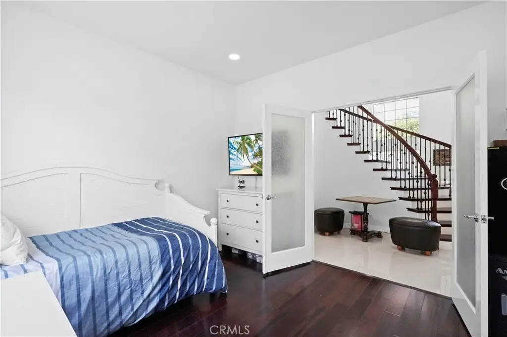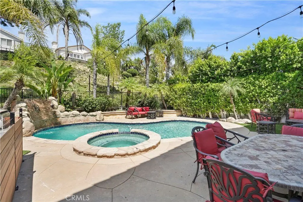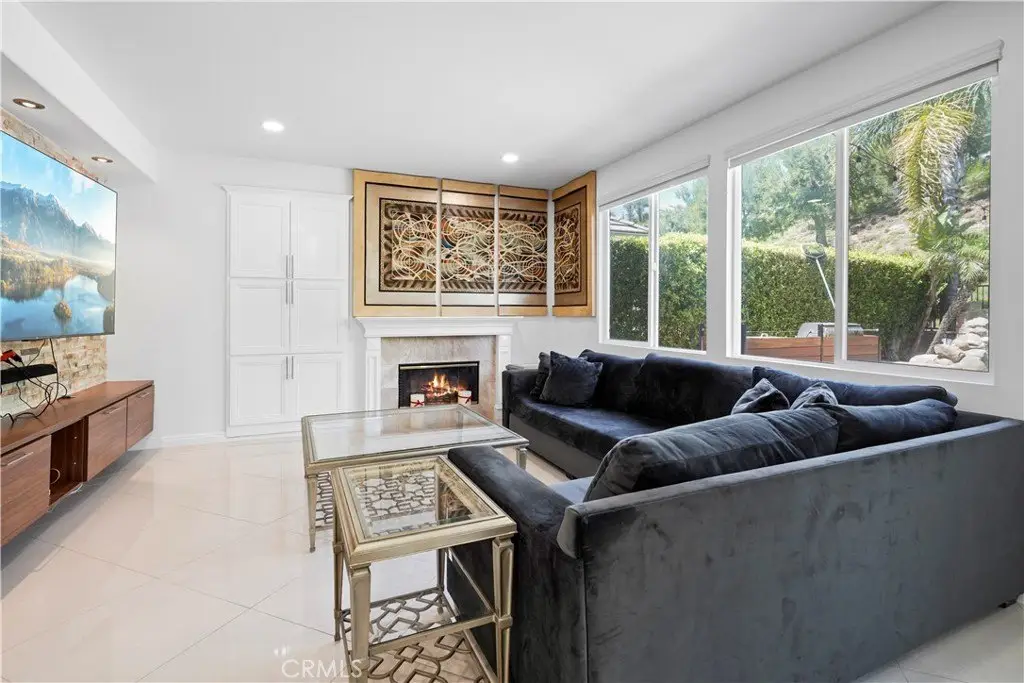 A stunning two story home in a guard-gated Porter Ranch community with an HOA OF $300 a month. Spacious five bedroom, three bath home in the Sorrento Community. The layout includes a dramatic spiral staircase that adds majestic touch to this beautiful home, high ceilings, large custom windows, recessed lighting. One bedroom and bathroom are on the first floor customized as an office with double french doors, while the second floor has four bedrooms and two bathrooms. The kitchen has granite counters, a center island, breakfast nook, a large pantry, double oven, built-in stainless steel appliances. The kitchen opens to the family room with a fireplace, and the view of the backyard. The home has porcelain flooring on the first level and wood on the second. The upstairs primary suite includes his and hers walk-in closets, dual sinks, a spa tub, and a separate shower. Two additional bedrooms share a bathroom. The home is in a desirable 24-hour guard-gated community with a community pool, spa, and a three-car attached garage with direct access. The backyard features a custom-built pool and spa with a waterfall. Built-in BBQ and lots of space for family and friends gatherings. Must see to appreciate all the details.