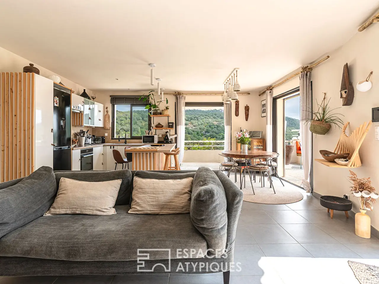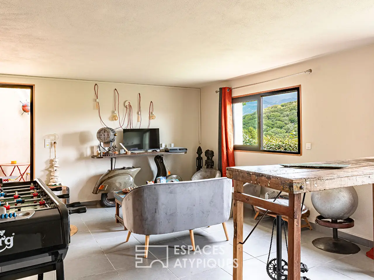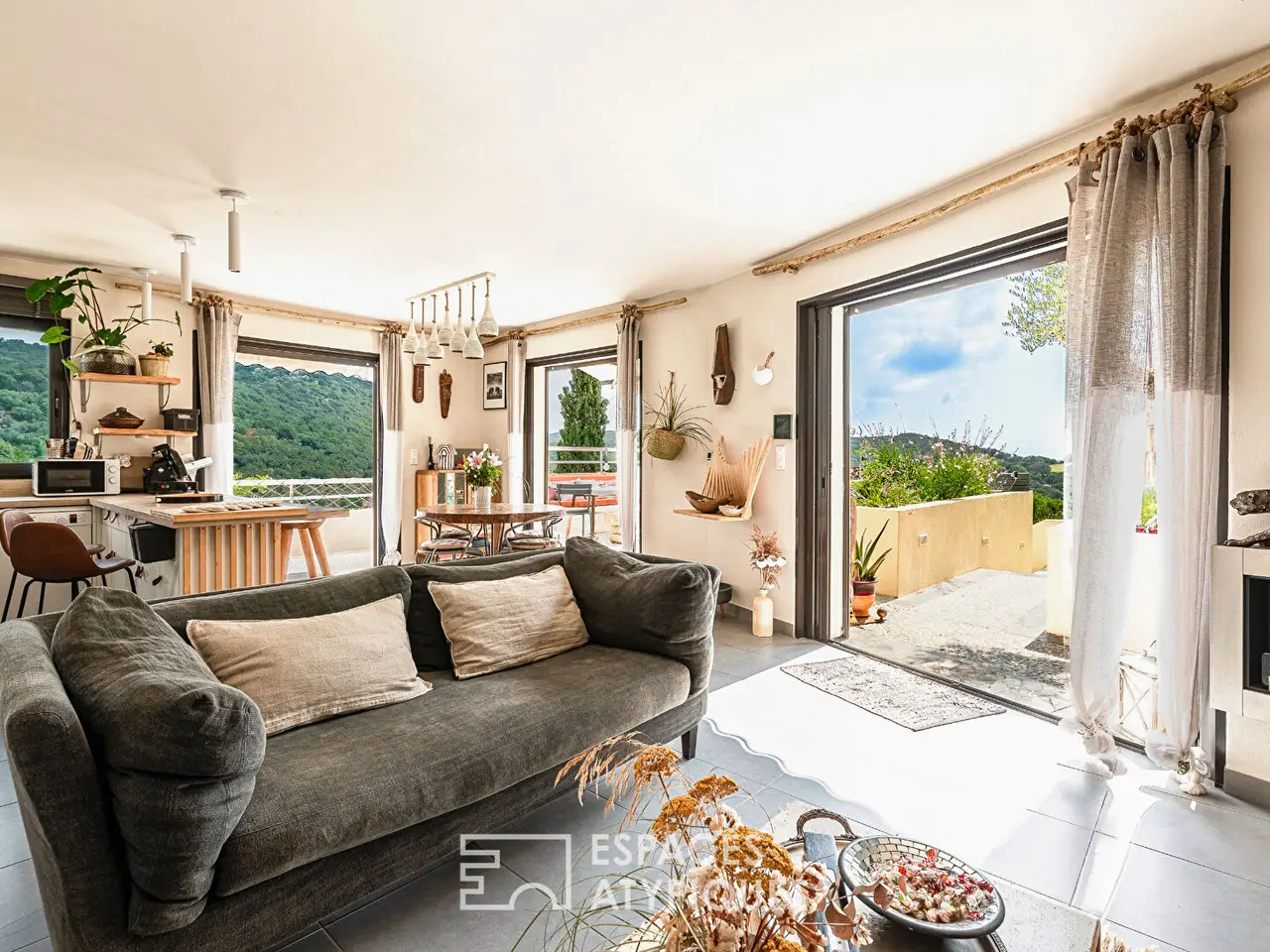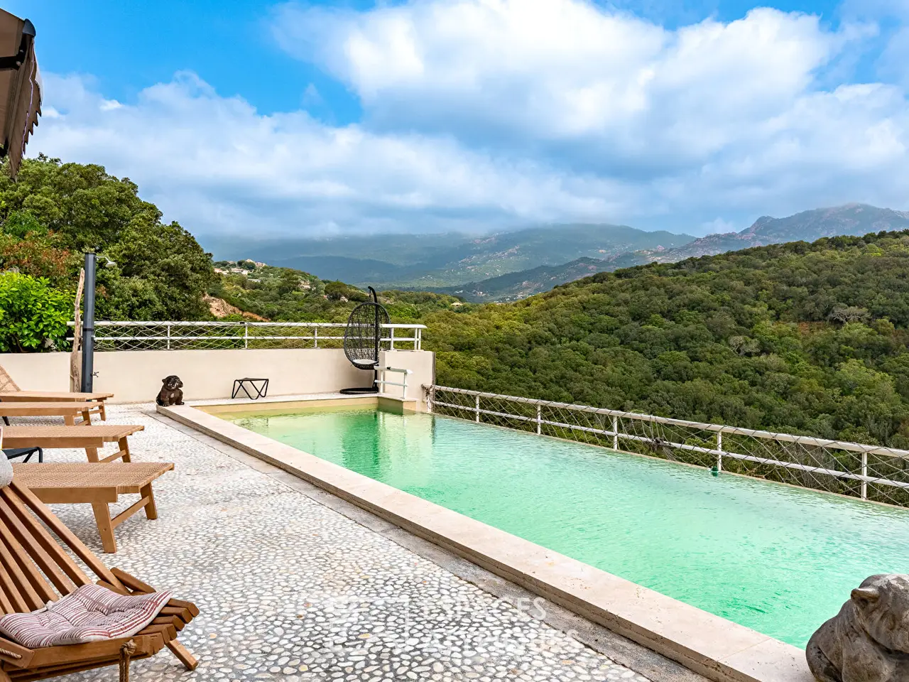 Sea and scrubland view - contemporary house in Porto-Vecchio In the heart of a green setting, on the emblematic Ospedale road, a few minutes from Porto-Vecchio, this contemporary house of 183 sqm (155 sqm living space) is nestled on the hillside, in an intimate and panoramic setting. The architecture is based on raw lines, highlighted by carefully selected materials. The aesthetic approach combines contemporary purity and bohemian chic spirit, in a setting open to the landscape. The whole blends into the vegetation of the maquis, without artifice, with controlled elegance. On the main level, a vast living room opens to the exterior through large windows. Natural light structures the volumes with fluidity. A fitted kitchen extends the living space, two master suites, an office and a separate studio complete this level. The upper floor accommodates three bedrooms, accompanied by a bathroom and separate toilets. Below, a two-room, self-contained apartment echoes Corsican hospitality. Ideal for hosting guests or creating a secluded, personal space, it adds flexibility and modularity to the ensemble. The infinity pool nestles at the edge of the terrace, offering a spectacular view of the Gulf of Porto-Vecchio. The view plunges over the ridges, escapes towards the sea, and disappears into the horizon, in a silence disturbed only by the surrounding nature. The property is part of a small, no-charge condominium complex, in a preserved environment where one can access the most popular beaches without the summer bustle. The perfectly maintained grounds include a parking area for five vehicles and a space dedicated to wintering a boat. This turnkey house combines comfort, discretion, and disconnection. It is aimed at aesthetes looking for an atypical property in one of the most sought-after areas of the Mediterranean. ENERGY CLASS: D CLIMATE CLASS: A Estimated average amount of annual energy expenditure for standard use, established based on energy prices for the year 2023: between 2540 and 3480 euros. REF. 11345 Additional information * 7 rooms * 5 bedrooms * Outdoor space : 927 SQM * 5 co-ownership lots * Property tax : 2 077 € Energy Performance Certificate Primary energy consumption d : 217 kWh/m2.year High performance housing