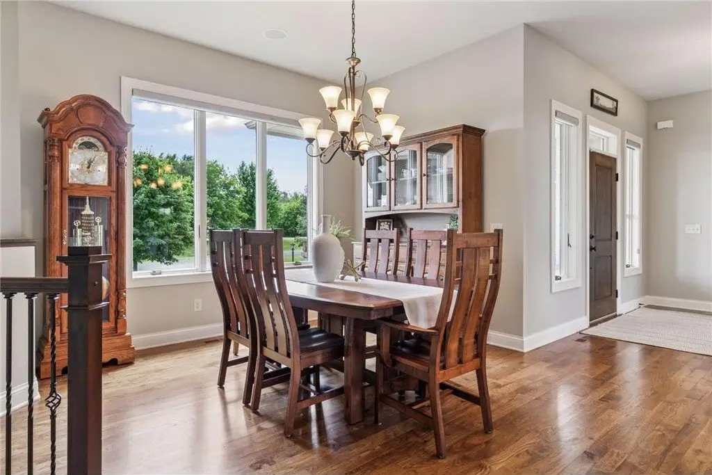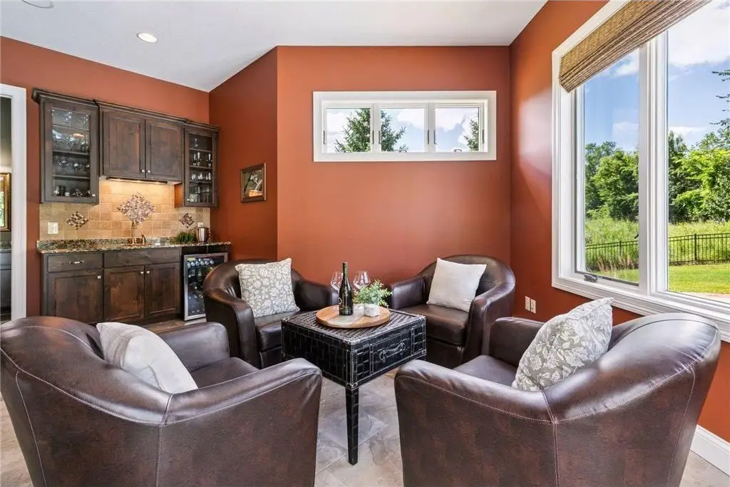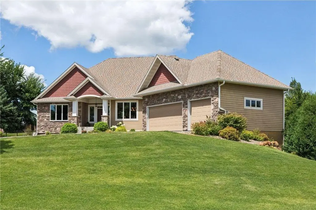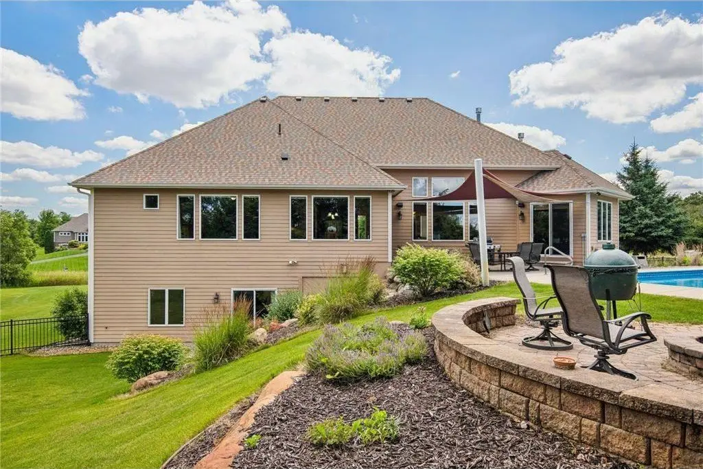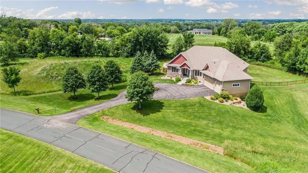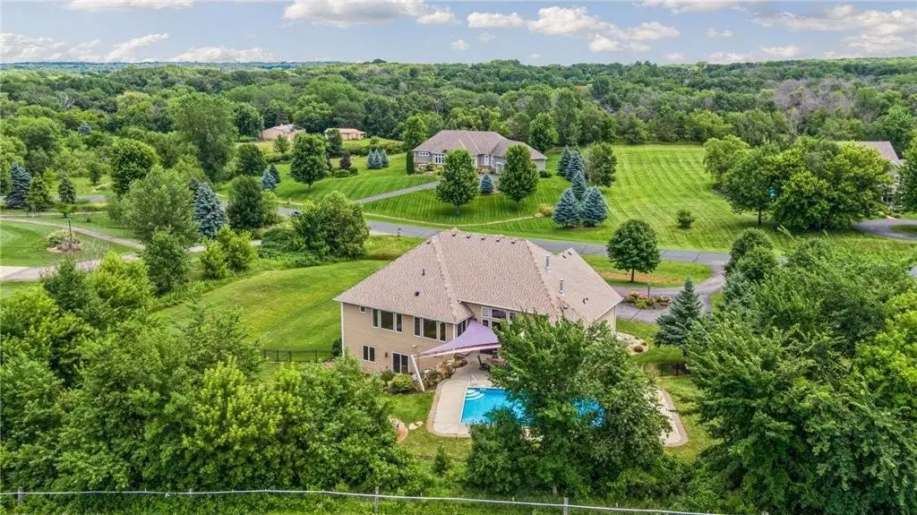 Experience refined luxury in this custom walkout rambler designed and built by JB Woodfitter in 2012, set on 2.51 acres of manicured grounds and prairie beauty. This 4BR/5BA masterpiece offers soaring ceilings, dramatic windows, and high-quality finishes throughout. Enjoy a gourmet kitchen with abundant Knotty Alder cabinetry, oversized island with bar seating, solid surface counter tops, tile backsplash, stainless steel appliances, double wall ovens, and a walk-in pantry. A grand two-story great room with a floor-to-ceiling fireplace with accent down lighting presents an impressive focal point. Gorgeous and inviting hearth room with a heated tile floor, cosmopolitan fireplace, and wet bar designed to offer a seamless indoor-outdoor entertaining space. A convenient 3/4 bath located near the hearth room was designed for a quick rinse after a dip in the pool. Walkout from the hearth room to a heated in-ground pool, sprawling patio, and firepit to unwind and entertain in style. A spacious main level office with French doors and full wall of built-ins welcomes a private work from home space. This lovely home welcomes both formal and in-formal dining spaces, perfect for large gatherings. The main-level primary suite connects to a spa-like bath, complete with a steam shower, that adjoins the laundry for your added convenience. Enter from the garage into a fabulous mud room with a tile floor, built-in lockers and closet for everyday storage. A wide staircase leads you to this homes equally impressive lower level that boasts a spacious family room with a dramatic corner fireplace, billiard area, stunning wet bar, craft/flex room, three bedrooms (one Jack-n-Jill style that share a 3/4 bath) and a separate third bedroom that walks through to a sparkling full bath, plus a lower 2+ garage for all your toys. The upper level three car garage is angled, with an epoxy floor and floor drains, built-in storage cabinetry, (2) 220-volt electric charging stations and a convenient side service door. Surrounded by estate homes and tranquil views, this home blends country serenity with city convenience. Nearby Legends Golf Course offers a challenging game, and a fabulous dining and social experience. This highly sought after neighborhood attends highly sought after Lakeville schools and is not part of the Scottview Estates homeowner's association. Go ahead and fall in love with this spectacular home - its easy to do here.