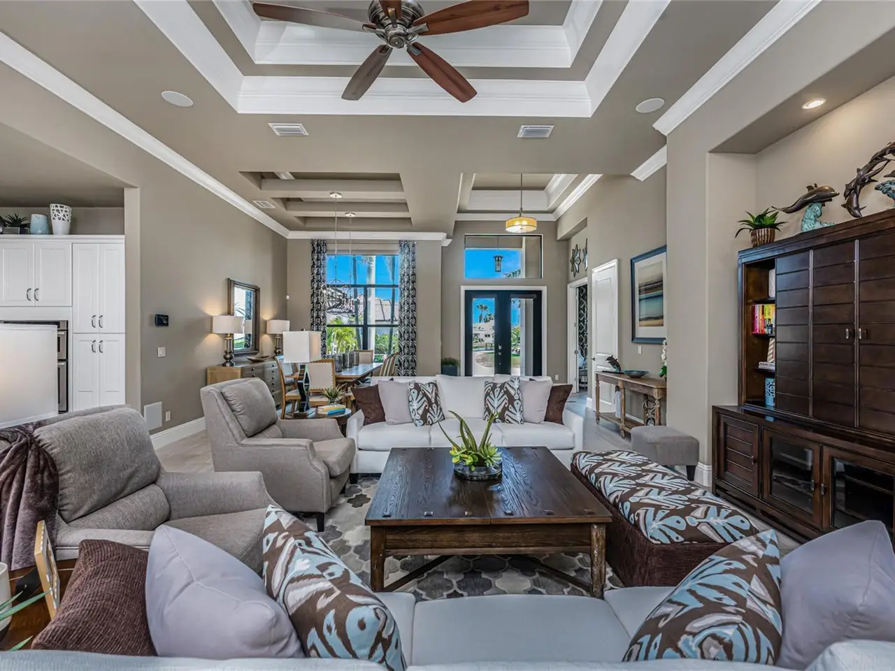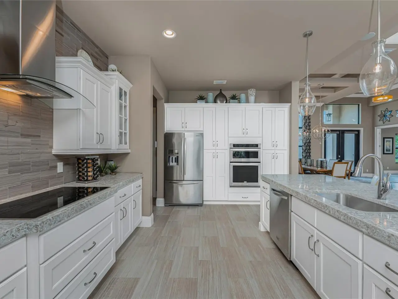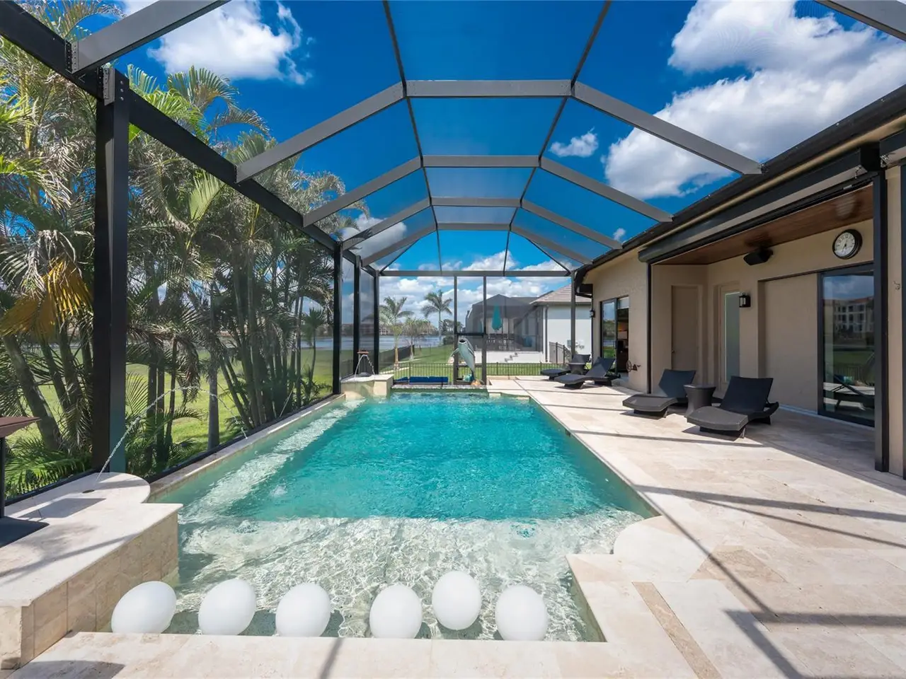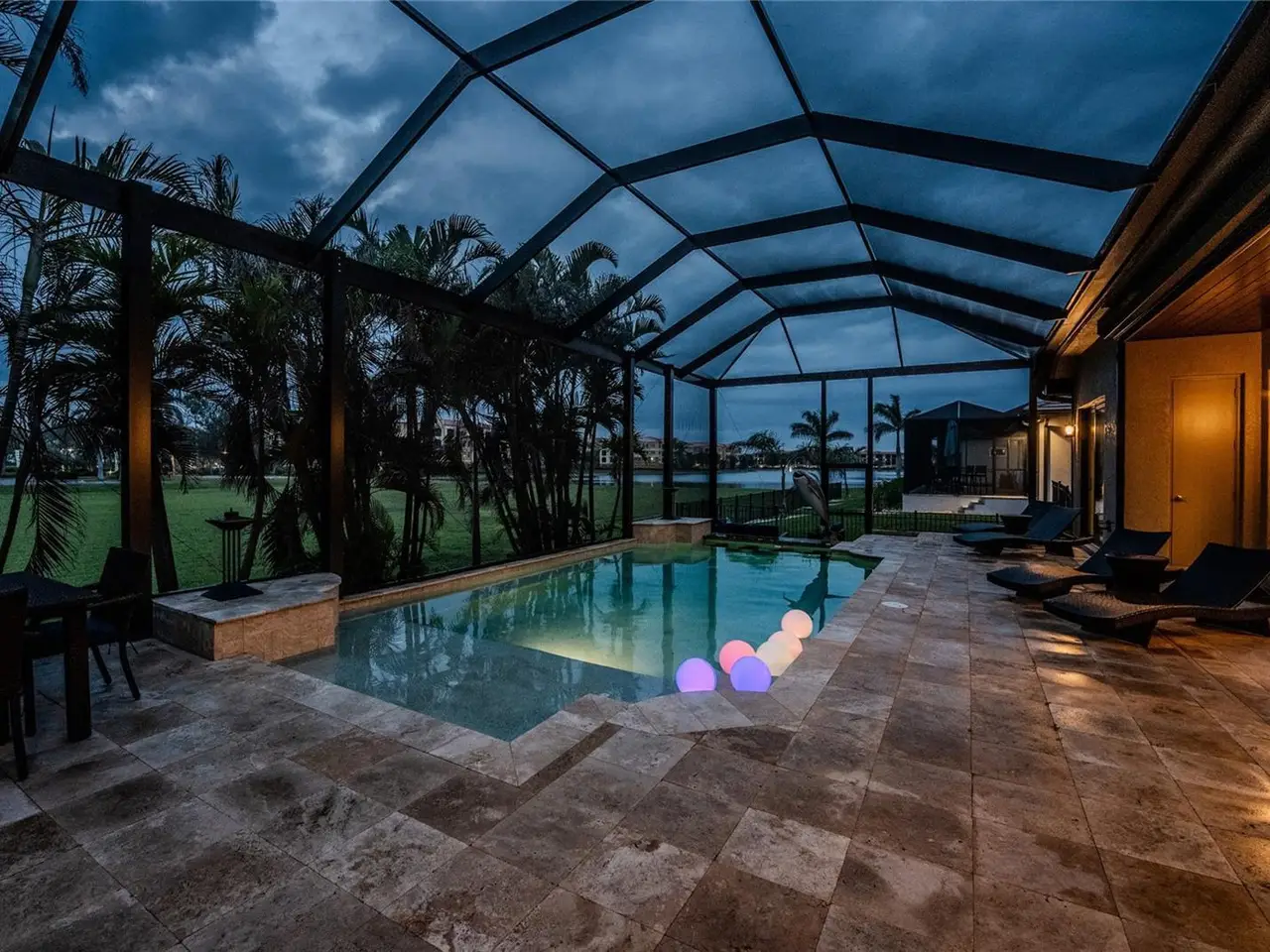 Welcome to your dream home! This former builder's model, crafted by award-winning PGI Homes in 2014, blends comfort, style, and luxury. Offered turnkey furnished (with some exclusions), this 3-bedroom, 2-bath home with an office spans 2,680 sq. ft. features an oversized lanai and pool area. A circular paver driveway with lush landscaping leads to an elegant double-door entry. Inside, soaring ceilings with crown molding, an open-concept design and abundant natural light highlight the beautifully furnished space. The great room features a coffered ceiling, while the dining room showcases a unique architectural ceiling. The gourmet kitchen boasts a large 4" Silestone quartz countertop with the center island seating for four, a striking tile backsplash, KitchenAid stainless steel appliances, an induction cooktop with a sleek hood, and ample storage in classic white cabinetry. The luxurious primary suite includes a sitting area, French doors to the pool, a tray ceiling, and elegant lighting. Two walk-in closets lead to a spa-like bath with a crystal chandelier, soaking tub, Roman shower with dual heads, and dual vanities with Silestone counters. The guest wing offers two spacious bedrooms and a pool-access bath with custom tile and a glass-walled shower. A standout 3-car garage features wood flooring, crown molding, recessed lighting, and independent climate control ideal for vehicles or a home gym. Smart home features include a Z-Wave system, security cameras, & a Nuvo sound system with built-in speakers. Disappearing sliders open to a wood-ceilinged lanai, summer kitchen, and wall-mounted TV. The expansive travertine pool deck boasts a heated pool with fountains, a sun platform, a submerged granite bar, and multiple lounging area all overlooking a gorgeous lake view. Close to Ponce de Leon Park and minutes to Fishermen's Village - THIS IS YOUR DREAM HOME!