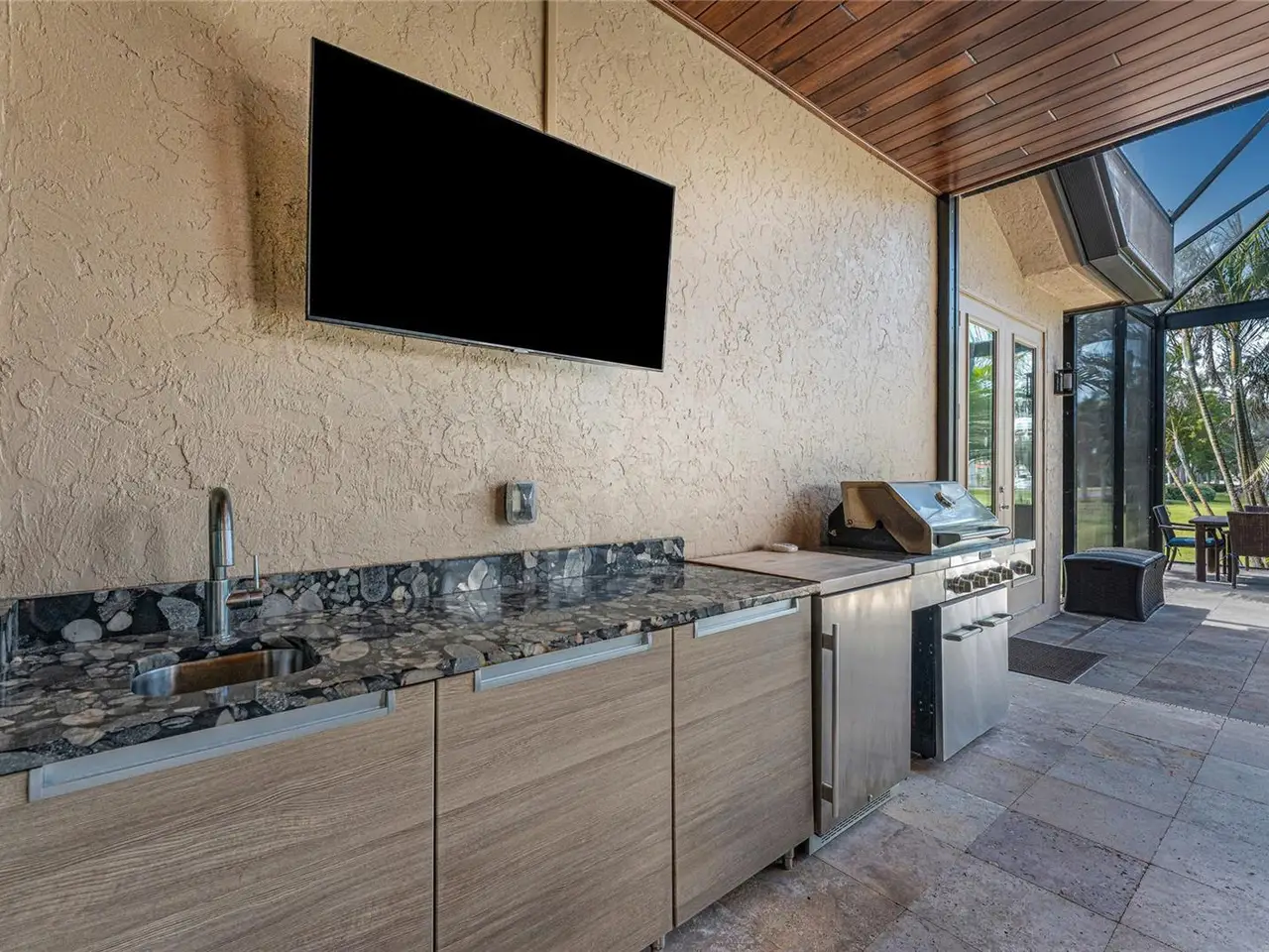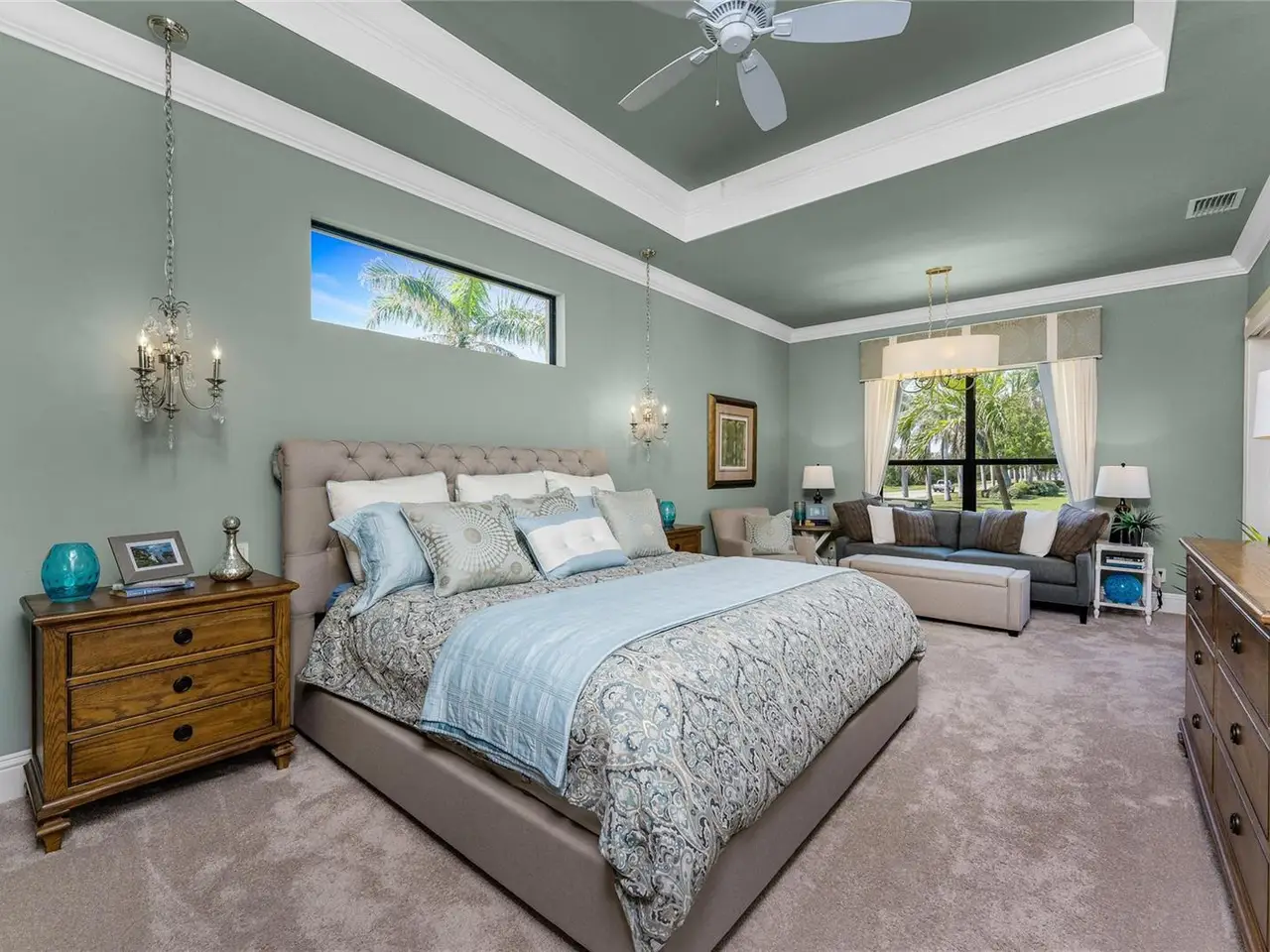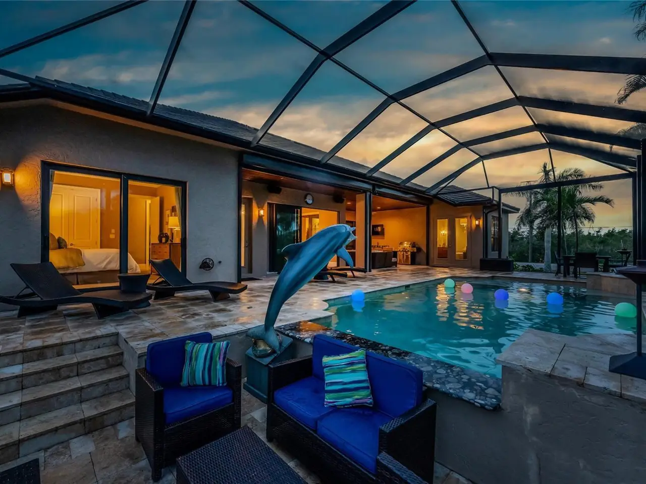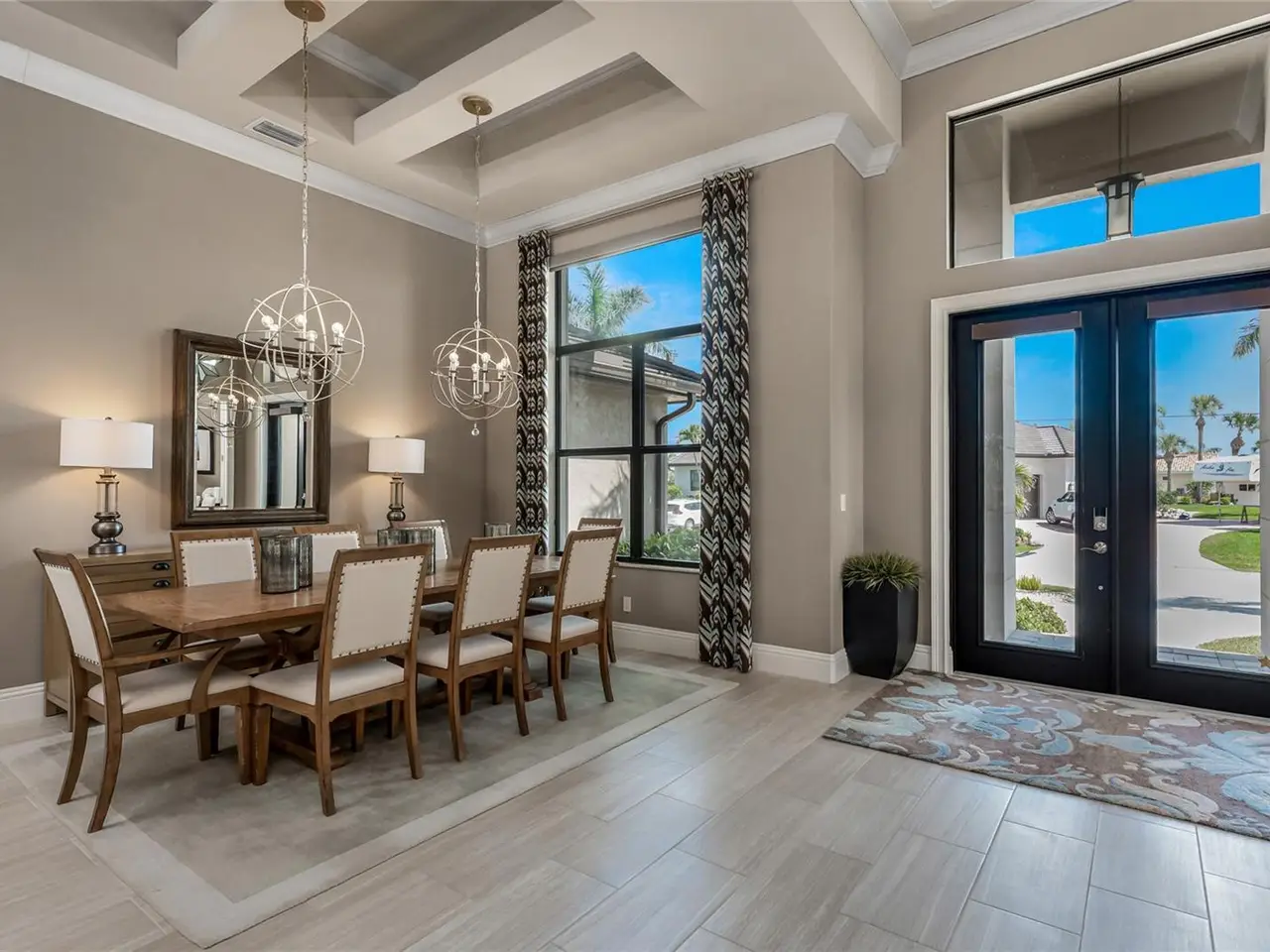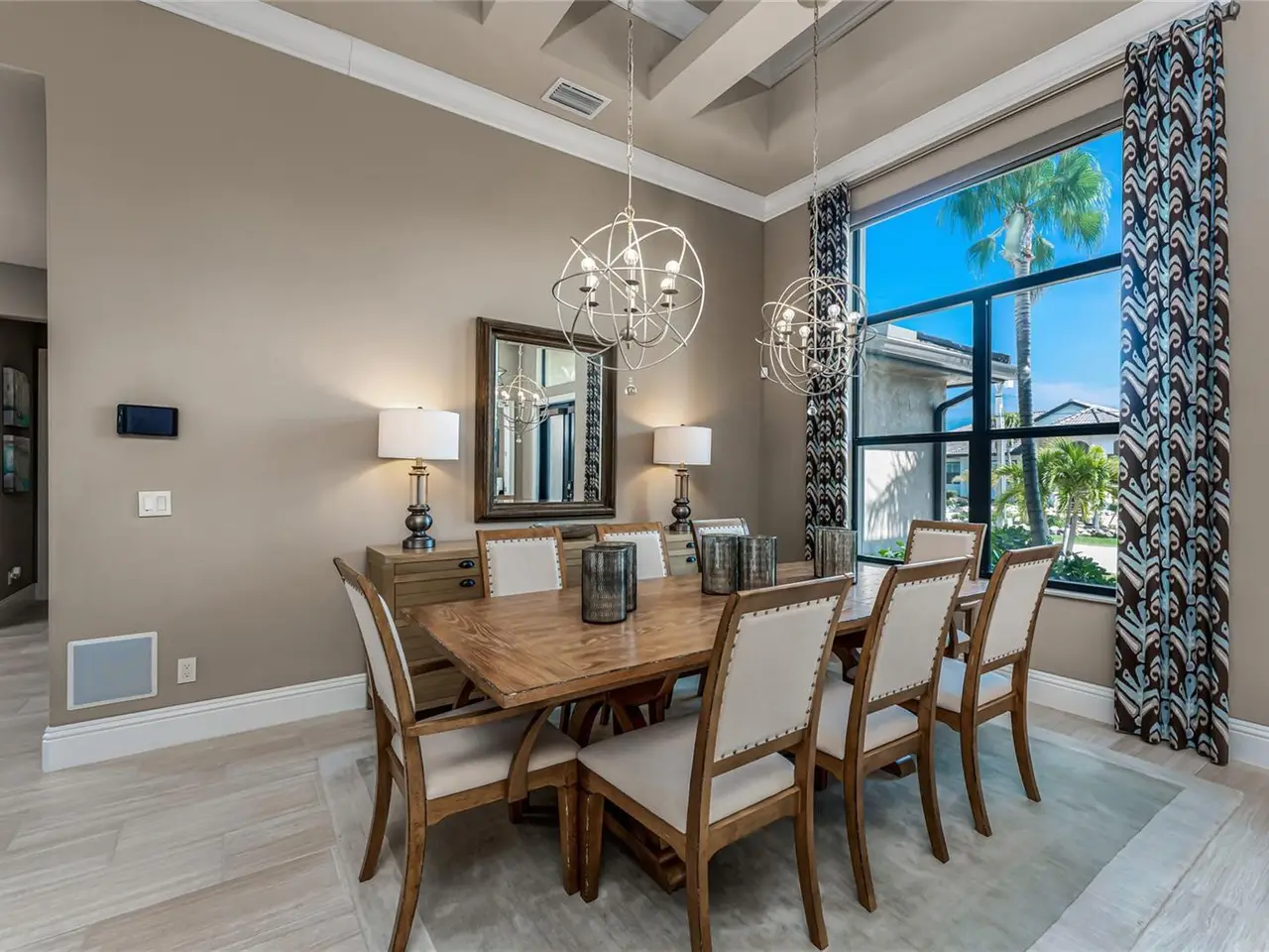 Welcome to your dream home! This former builder's model, crafted by award-winning PGI Homes in 2014, blends comfort, style, and luxury. Offered turnkey furnished (with some exclusions), this 3-bedroom, 2-bath home with an office spans 2,680 sq. ft. features an oversized lanai and pool area. A circular paver driveway with lush landscaping leads to an elegant double-door entry. Inside, soaring ceilings with crown molding, an open-concept design and abundant natural light highlight the beautifully furnished space. The great room features a coffered ceiling, while the dining room showcases a unique architectural ceiling. The gourmet kitchen boasts a large 4" Silestone quartz countertop with the center island seating for four, a striking tile backsplash, KitchenAid stainless steel appliances, an induction cooktop with a sleek hood, and ample storage in classic white cabinetry. The luxurious primary suite includes a sitting area, French doors to the pool, a tray ceiling, and elegant lighting. Two walk-in closets lead to a spa-like bath with a crystal chandelier, soaking tub, Roman shower with dual heads, and dual vanities with Silestone counters. The guest wing offers two spacious bedrooms and a pool-access bath with custom tile and a glass-walled shower. A standout 3-car garage features wood flooring, crown molding, recessed lighting, and independent climate control ideal for vehicles or a home gym. Smart home features include a Z-Wave system, security cameras, & a Nuvo sound system with built-in speakers. Disappearing sliders open to a wood-ceilinged lanai, summer kitchen, and wall-mounted TV. The expansive travertine pool deck boasts a heated pool with fountains, a sun platform, a submerged granite bar, and multiple lounging area all overlooking a gorgeous lake view. Close to Ponce de Leon Park and minutes to Fishermen's Village - THIS IS YOUR DREAM HOME!