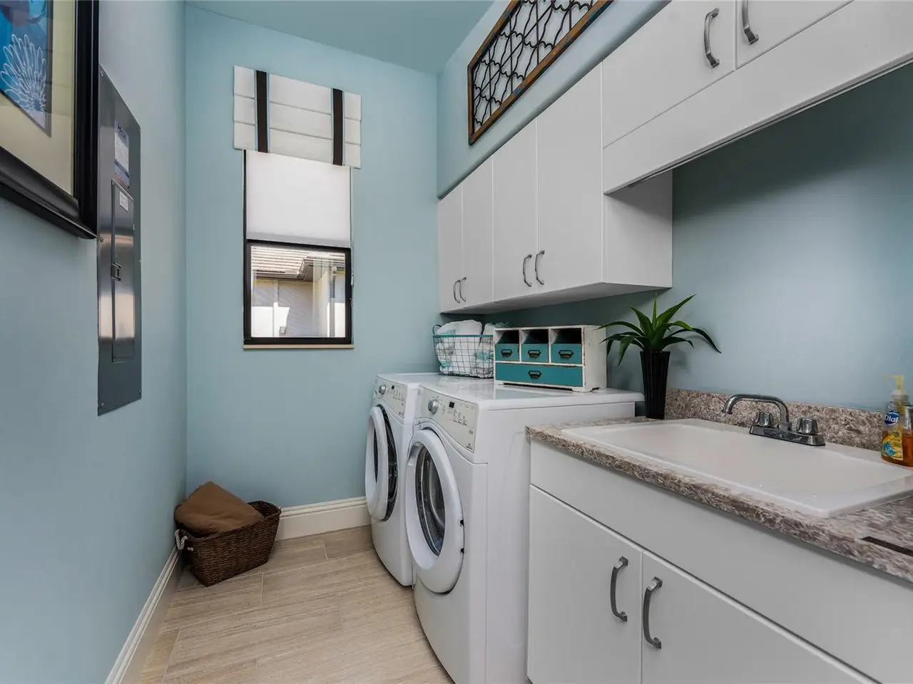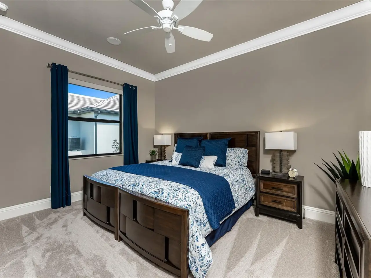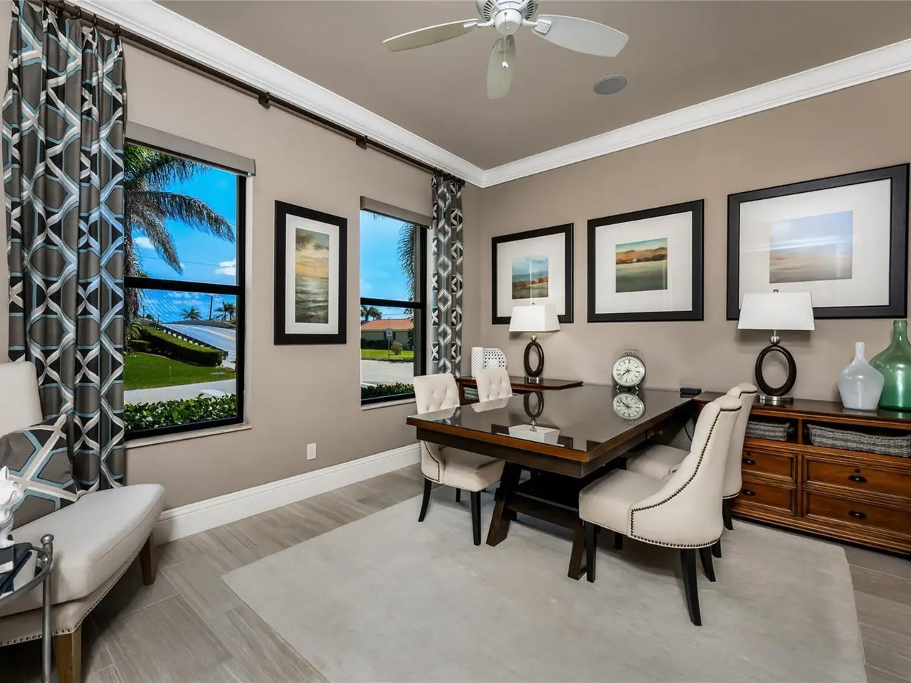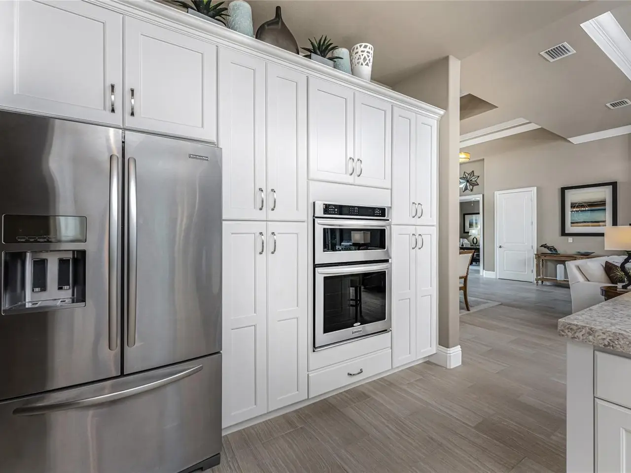 Welcome to your dream home! This former builder's model, crafted by award-winning PGI Homes in 2014, blends comfort, style, and luxury. Offered turnkey furnished (with some exclusions), this 3-bedroom, 2-bath home with an office spans 2,680 sq. ft. features an oversized lanai and pool area. A circular paver driveway with lush landscaping leads to an elegant double-door entry. Inside, soaring ceilings with crown molding, an open-concept design and abundant natural light highlight the beautifully furnished space. The great room features a coffered ceiling, while the dining room showcases a unique architectural ceiling. The gourmet kitchen boasts a large 4" Silestone quartz countertop with the center island seating for four, a striking tile backsplash, KitchenAid stainless steel appliances, an induction cooktop with a sleek hood, and ample storage in classic white cabinetry. The luxurious primary suite includes a sitting area, French doors to the pool, a tray ceiling, and elegant lighting. Two walk-in closets lead to a spa-like bath with a crystal chandelier, soaking tub, Roman shower with dual heads, and dual vanities with Silestone counters. The guest wing offers two spacious bedrooms and a pool-access bath with custom tile and a glass-walled shower. A standout 3-car garage features wood flooring, crown molding, recessed lighting, and independent climate control ideal for vehicles or a home gym. Smart home features include a Z-Wave system, security cameras, & a Nuvo sound system with built-in speakers. Disappearing sliders open to a wood-ceilinged lanai, summer kitchen, and wall-mounted TV. The expansive travertine pool deck boasts a heated pool with fountains, a sun platform, a submerged granite bar, and multiple lounging area all overlooking a gorgeous lake view. Close to Ponce de Leon Park and minutes to Fishermen's Village - THIS IS YOUR DREAM HOME!