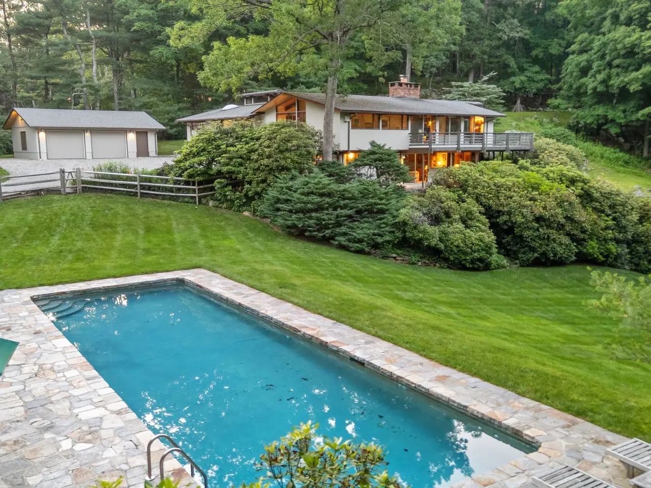 Never before on the market! A true once-in-a lifetime opportunity to own an architectural gem! This custom mid-century deck house, built and lovingly maintained by its original owners, has been thoughtfully expanded and updated over the years to meet the evolving needs of modern living-all while preserving its timeless design. Flooded withnatural light and offering unmatched privacy, this home is perfectly sited on a stunning 2.48 -acre parcel. Mature trees, lush rhododendrons and sweeping views of surrounding open space create an idyllic retreat just 6 minutes from Georgetown Center, Carluccio's market and the Redding Metro North train station. Key Features include: **A 15x50 Gunite heated lap pool with bluestone patio and outdoor lighting, **A separate 160SF pool cabana with bath and its own dedicated septic system, **A 600SF Heated and Cooled Artist/Yoga studio- Featuring Vaulted ceilings, skylights, beams, and designer lighting. **A 720SF Detached Two-Car Garage with additional storage and attached workshop/potting room, ** two large wooden framed detached sheds for wood and tool storage, **Multiple outdoor entertaining areas including a partially covered, expansive and elevated wrap-around-deck overlooking the stunning grounds and pool area. With nature views from every room and abutting acres of preserved open space, this property offers peace, inspiration and the rare chance to own a truly iconic and magical piece of West Redding history! This is your needle in a haystack The one you've been waiting for. Do not miss!!