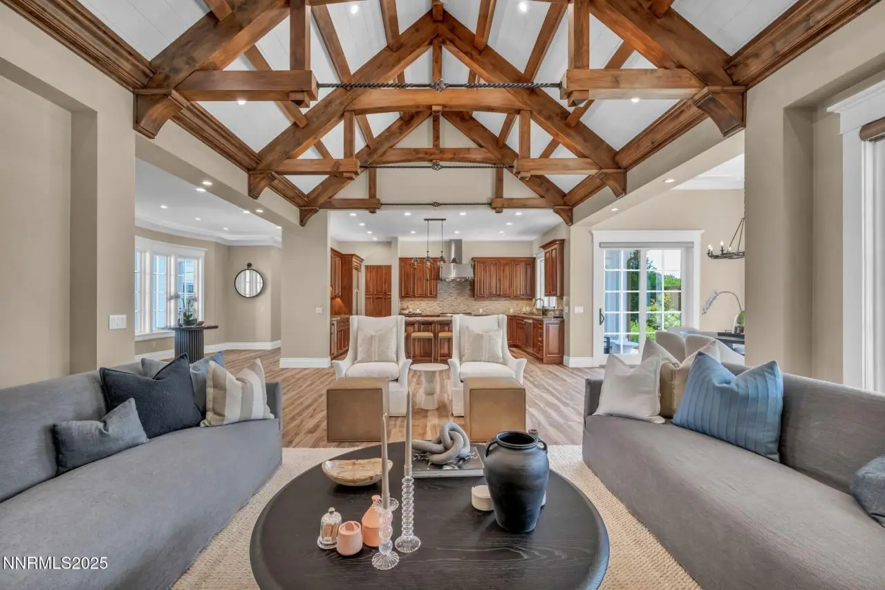 Welcome to this custom-built masterpiece in the prestigious, gated community of Rancharrah - Reno's only truly walkable neighborhood. Just a short stroll to the exclusive clubhouse, you'll enjoy access to a resort-style pool, year-round hot tub, full-service spa, fitness center, bocce and pickleball courts, and a full calendar of workout classes. Residents also enjoy the iconic Harrah Mansion and the nearby Village at Rancharrah, home to locally-owned shops, cafes, and boutiques. Thoughtfully designed with both elegance and comfort in mind, this home offers soaring ceilings, exposed beams, and rich wood accents that create a warm yet expansive atmosphere. The versatile layout includes 3 bedrooms-with the primary suite conveniently located on the main level-a dedicated office, guest quarters, and a spacious recreation room perfect for a home theater, gym, or game room. Additional highlights include an elevator, a rare RV garage, separate golf cart garage, and an oversized 2-car garage for all your storage and lifestyle needs. Perfectly located in Southwest Reno, just minutes from Reno-Tahoe International Airport, Midtown, Downtown, and some of the region's best outdoor recreation-from skiing and boating to hiking and mountain biking-this home offers the best of luxury living with access to everything that makes Northern Nevada exceptional.