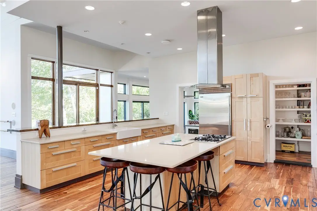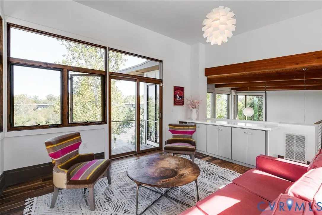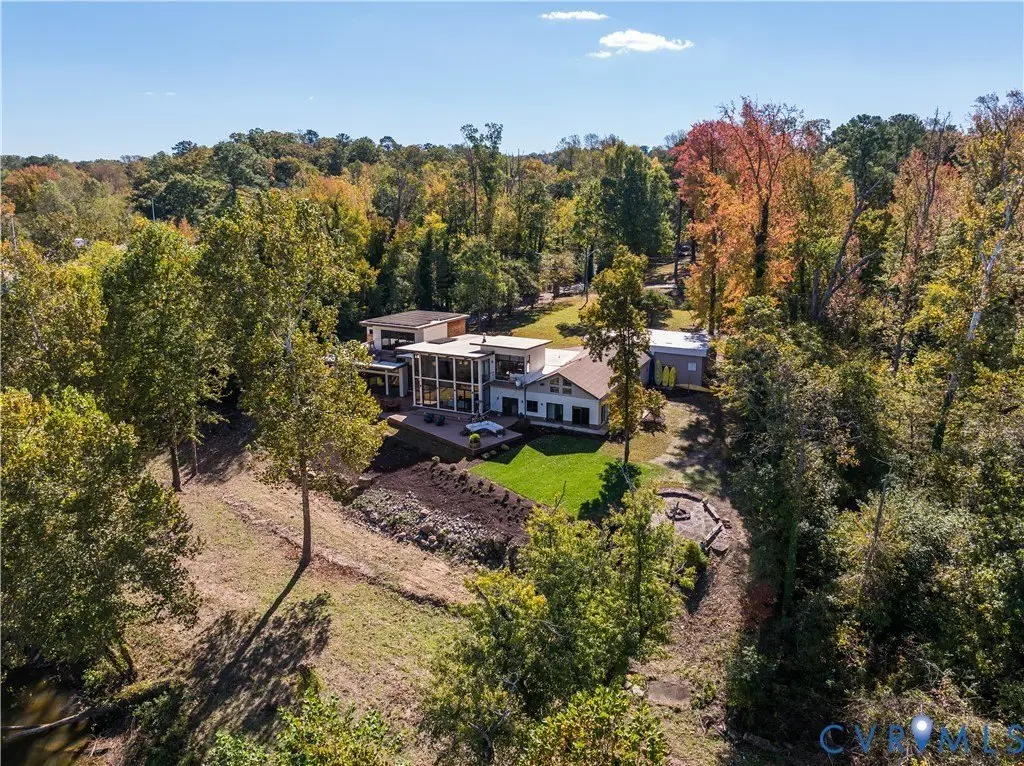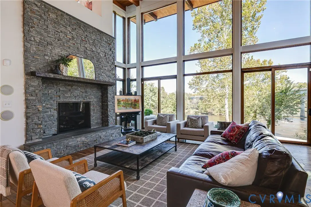 ""Extraordinary riverfront contemporary home with rare private access to the James River! This architectural gem blends dramatic design with comfortable living and stunning natural views. This home known as ""The Igloo House"""" was originally created by artist Demetrios Mavroudis and was masterfully reimagined with thoughtful additions and modern luxury while preserving its artful history. Walls of glass, vaulted ceilings with exposed beams, marble floors from the Federal Trade building, architectural details from the University of Richmond and open living spaces capture the light and the river from nearly every room. The chef's kitchen features SubZero and Wolf, quartz counters and an oversized island - perfect for entertaining. The spacious primary suite offers panoramic river views, spa bath with heated floors and exceptional custom cabinetry in the large walk-in closet. There is an additional en-suite bedroom/bath combo, 2 additional bedrooms with a hall bath to share, a 5th possible bedroom with a full bath and a large main floor laundry room. There are 2 additional versatile offices and studio spaces, which provide flexibility for modern living. The oversized former garage houses amazing storage, a huge workshop, an office and an incredible climbing wall gym with """"sprung"""" floor. This space could easily be repurposed to a parking garage again. Outdoor spaces include expansive decks and balconies, a koi pond, stone fire pit and direct access to the flatwater for kayaking and canoeing. Set on over 2 acres with landscaped gardens and spectacular sunsets over Bosher's Dam, this home is a one-of-a-kind Richmond landmark featured in RHome, Modern Home, and HGTV. Every stone, beam and piece of metal tells a story in this home. What began as a park ranger's home, then became an artist's studio and now stands as a deeply loved riverfront retreat for a family. It is now your turn to start your new lifestyle and write your next chapter in this exceptional and special place.""