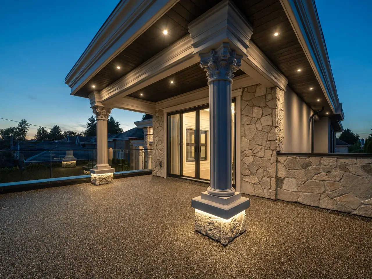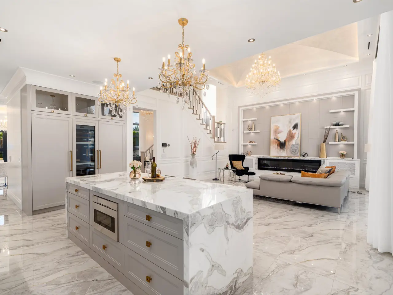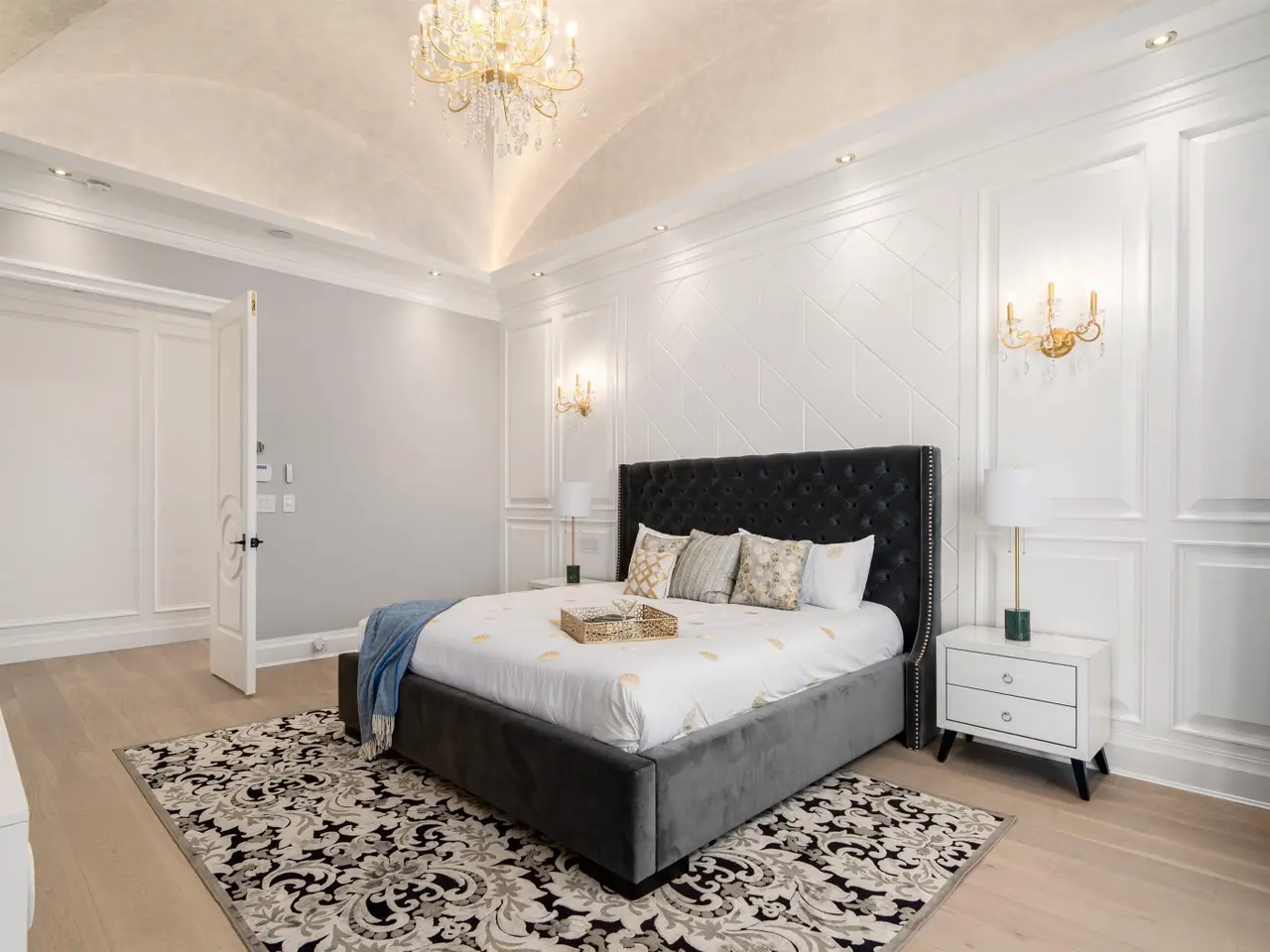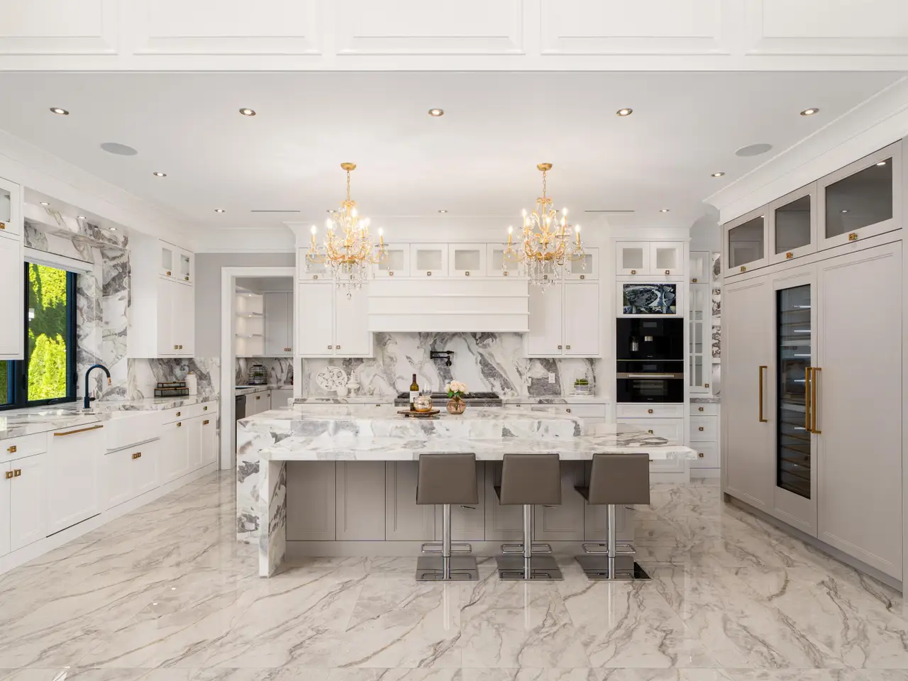 Elegant and luxurious custom home in the prestigious Granville area! North–South facing with a grand foyer featuring a stunning circular ceiling design and artistic wall accents. Italian marble flooring throughout, adorned with dazzling chandeliers. Spacious family room boasts a soaring vaulted ceiling, custom marble wall panel, and a warm fireplace. Gourmet kitchen with European marble countertops, top–tier Miele appliances, and premium cabinetry. Two master bedrooms, one with an expansive sundeck; all four upstairs bedrooms include walk-in closets. Legal suite below. Smart home system with motorized curtains, A/C, HRV, Hikvision intercom. Enjoy a fully equipped media room with wet bar, plus a private sauna. A true masterpiece for the discerning buyer!