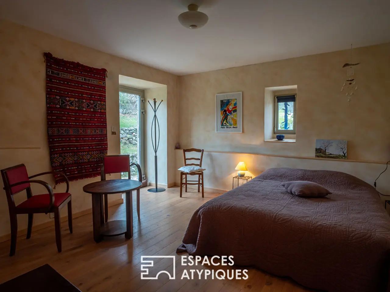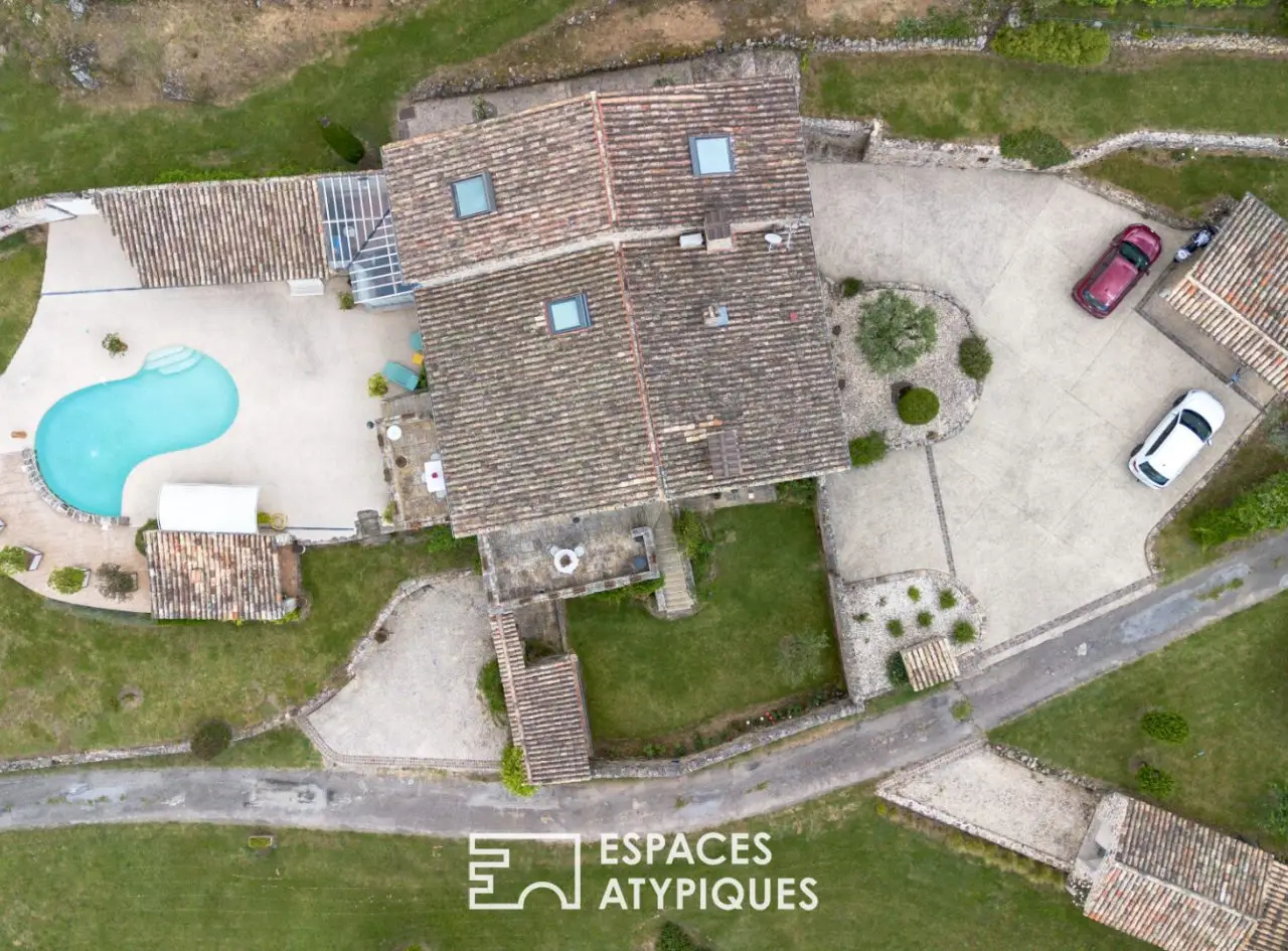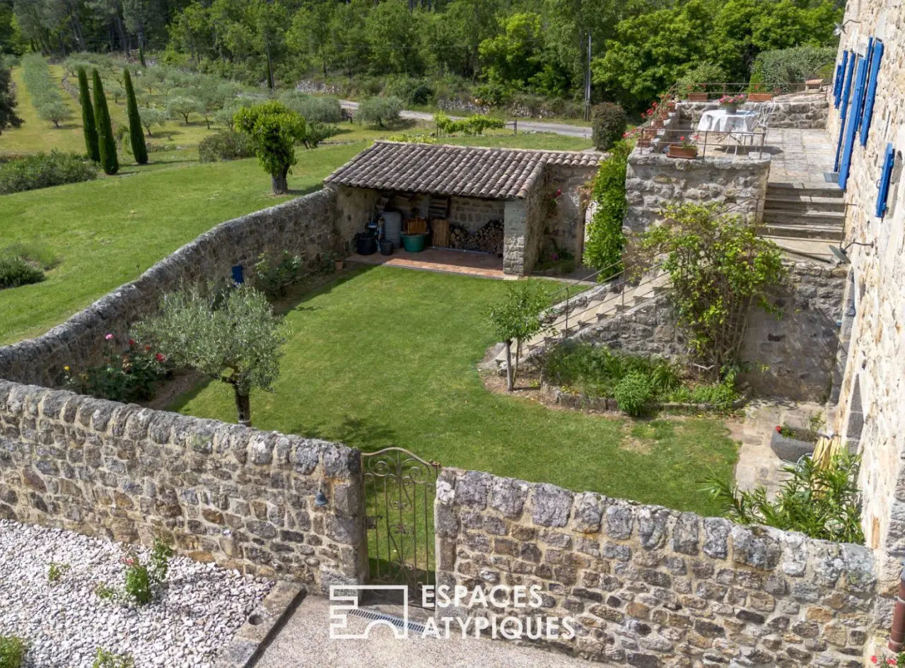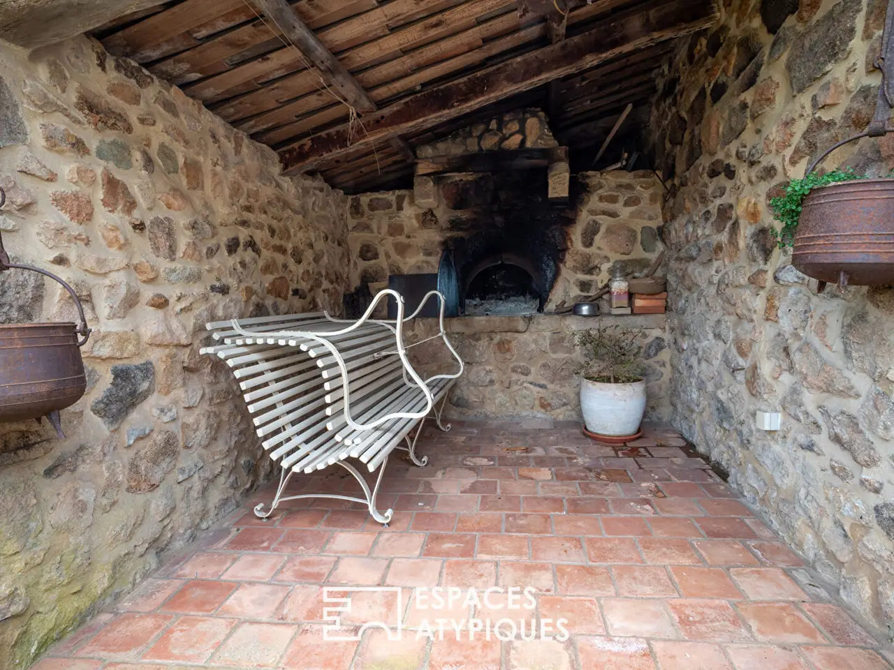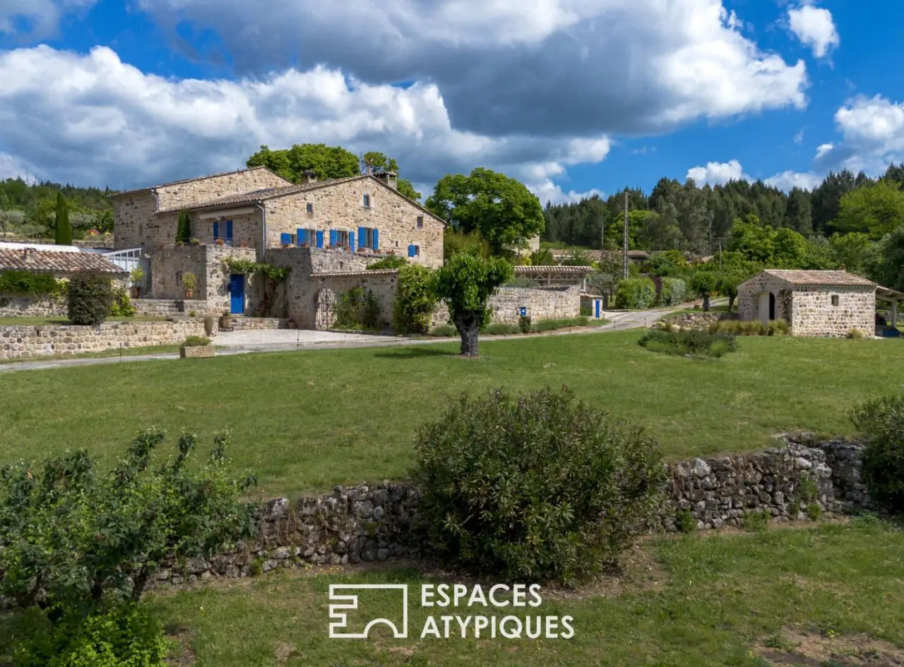 This 230 sqm character property, carefully renovated and built on cellars, is located in the heart of a peaceful, preserved environment, 23 km from Aubenas and close to major renowned natural sites. It benefits from a 1.6 ha plot of land organized into perfectly maintained terraces where olive trees in production with integrated irrigation, chestnut trees, white oaks, holm oaks, and truffle trees flourish fully alongside other fruit trees. A permanent borehole supplies the house and gardens. The city's water network is also well established. A large 200 sqm deactivated concrete parking lot welcomes you, with a welcome carport within. Past the charming entrance porch, an intimate grassy interior courtyard invites you to discover the building's vaulted cellars on the garden level, where a possible artist's studio or bedroom, a beautiful space housing a workshop and a small wine cellar, and a boiler room with a shower and toilet, follow one another. A fourth vault has been converted into a spacious garage offering three spaces for your 'racers.' A local stone staircase leads to a vast terrace offering a magnificent unobstructed view of the green countryside. You then enter the second level into the attractive and warm 50 m2 air-conditioned cathedral-style living room opening onto the exterior, where an imposing 'Focus Creation' fireplace with its open hearth stands. This space also has underfloor heating. You will appreciate, among other things, the beautiful maple wood wall cladding. A fitted kitchen in solid chestnut discreetly connects with the adjoining dining room. The sleeping area reveals a beautifully crafted master suite with its charming bathroom covered with teak parquet flooring and elegant marble tiles. A separate toilet skillfully flanks this space. A corridor adorned with a dressing room and a toilet leads to two other nicely appointed bedrooms with a shared bathroom. The latter benefit from independent exterior access, convenient for small rental use, for example. The connection to the upper floor is via a beautiful staircase crafted by a local ironworker. You then enter the mezzanine area elegantly converted into an office adorned with a beautiful custom-made solid oak bookcase and a useful storage area. Two attic bedrooms with chestnut parquet flooring, a shared bathroom with toilet and a dressing room punctuate the discovery of this last level. The well-kept exteriors also reveal a splendid recreational area arranged around a high-end swimming pool and an ideally renovated beach. A well-equipped summer kitchen, heated greenhouse, old village bread oven, technical room with sink, shower and toilet mark the premises in the immediate vicinity of the farmhouse. Finally, note the presence of a useful independent garage in lime-pointed stones with a lean-to essential for storing maintenance work equipment. Thus, this farmhouse, as you will have understood, offers a privileged environment one hour from the transport routes of the Rhone Valley for a large family looking for an oasis of tranquility in the heart of southern Ardeche, a stone's throw from the magnificent swimming spots of La Baume.REF. 495DAAdditional information* 10 rooms* 5 bedrooms* 1 bathroom* 2 shower rooms* 2 floors in the building* Outdoor space : 16000 SQM* Property tax : 1 155 €Energy Performance CertificatePrimary energy consumptionc : 161 kWh/m2.yearHigh performance housing*A*B*161kWh/m2.year12*kg CO2/m2.yearC*D*E*F*GExtremely poor housing performance* Of which greenhouse gas emissionsc : 12 kg CO2/m2.yearLow CO2 emissions*A*B*12kg CO2/m2.yearC*D*E*F