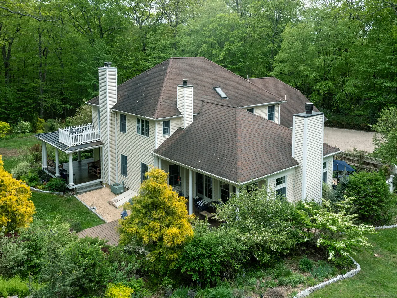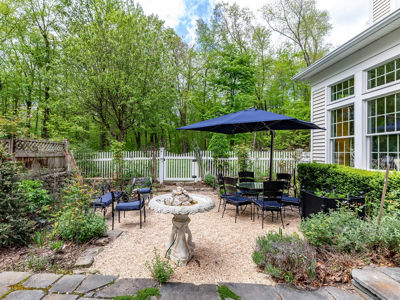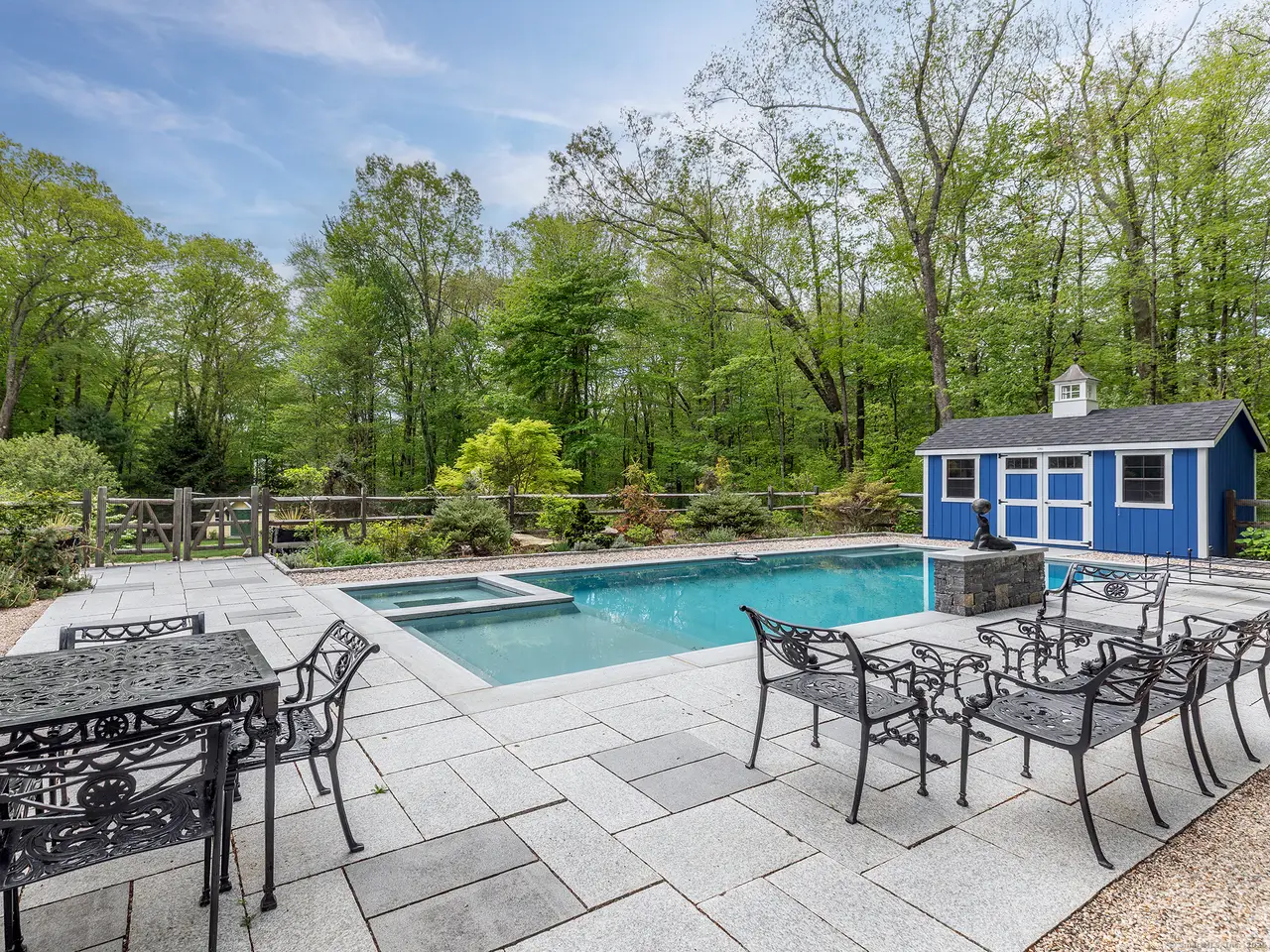 Fantastic Colonial in Roxbury down long private drive featuring low maintenance salt water spa pool. The house is surrounded by nature, with multiple entertaining spaces and gardens. Amazing bird life is a natural symphony while relaxing outdoors. The home has a lovely gracious layout all with detailed millwork and a vaulted great room with almost floor to ceiling windows on three sides creating a conservatory feel. A scented rose garden courtyard is off the great room. It flows directly off the kitchen which has a lovely breakfast area. The adjoining room is currently being used as a billiard room but could be a den, playroom or used in many different ways. Formal dining room and sitting room/library with gas fireplace are off the front hall. Second floor has 3 bedrooms including a primary suite with oversized marble bathroom, balcony deck (great for star gazing) and dressing room. There is a hall bath, laundry and bonus room currently being used as a gym. This room could be a 4th bedroom with the possibility of an en-suite bathroom. The attached 2 and half car garage leads to a newly renovated mudroom area. The lower level is partially finished and has additional potential. Pool with spa and cabana is surrounded by granite patio and coping, evergreens, shrubs, perennials and roses that provide summer long color and fragrance. Recent upgrades include automatic generator. Don't miss this opportunity!
