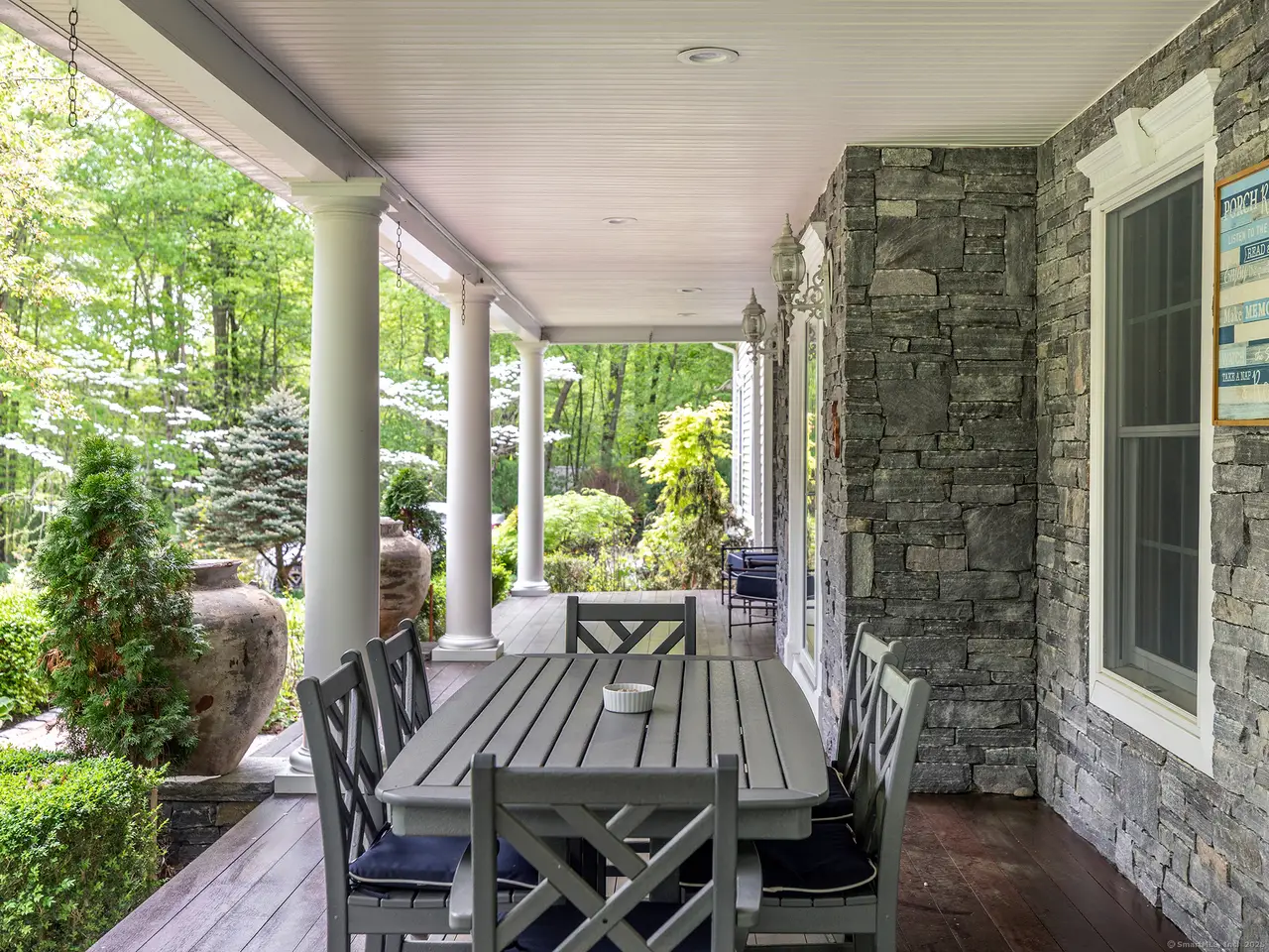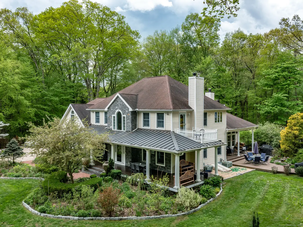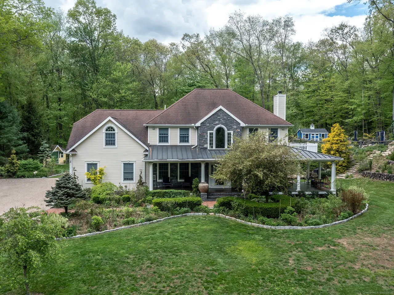 Fantastic Colonial in Roxbury down long private drive featuring low maintenance salt water spa pool. The house is surrounded by nature, with multiple entertaining spaces and gardens. Amazing bird life is a natural symphony while relaxing outdoors. The home has a lovely gracious layout all with detailed millwork and a vaulted great room with almost floor to ceiling windows on three sides creating a conservatory feel. A scented rose garden courtyard is off the great room. It flows directly off the kitchen which has a lovely breakfast area. The adjoining room is currently being used as a billiard room but could be a den, playroom or used in many different ways. Formal dining room and sitting room/library with gas fireplace are off the front hall. Second floor has 3 bedrooms including a primary suite with oversized marble bathroom, balcony deck (great for star gazing) and dressing room. There is a hall bath, laundry and bonus room currently being used as a gym. This room could be a 4th bedroom with the possibility of an en-suite bathroom. The attached 2 and half car garage leads to a newly renovated mudroom area. The lower level is partially finished and has additional potential. Pool with spa and cabana is surrounded by granite patio and coping, evergreens, shrubs, perennials and roses that provide summer long color and fragrance. Recent upgrades include automatic generator. Don't miss this opportunity!