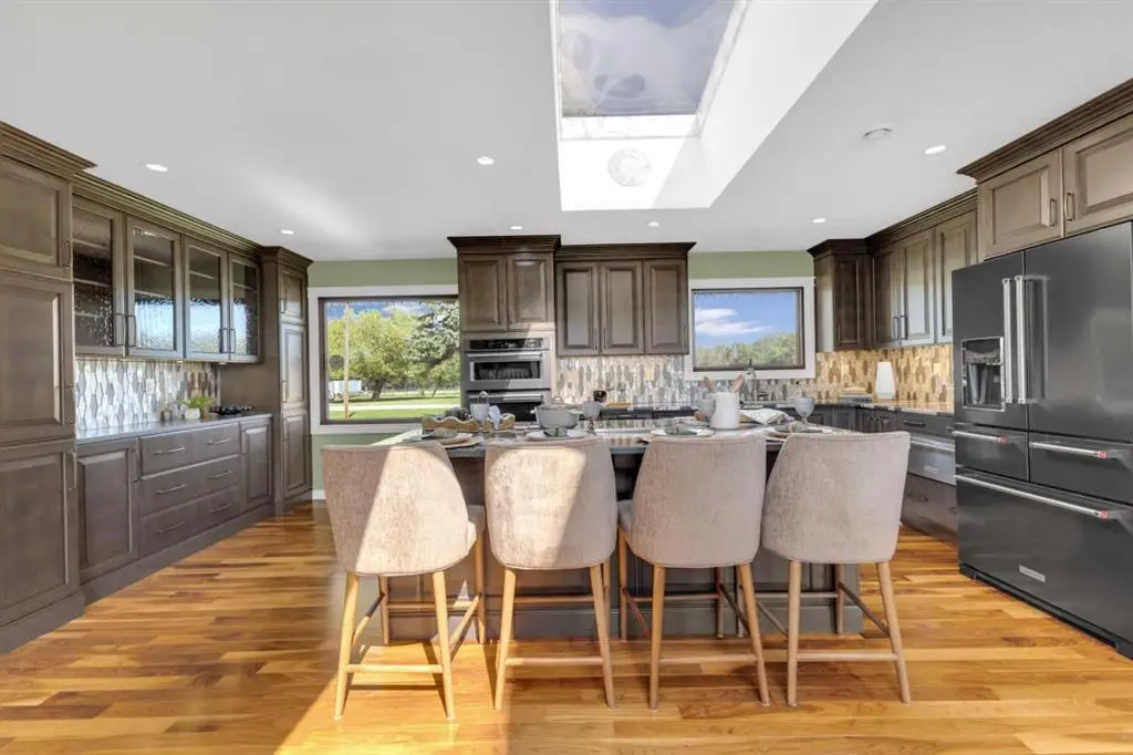 This exceptional property offers 17.92 acres with two residences, a fully finished shop, and multiple outbuildings, located just 1 mile off Hwy 11A on a quiet dead-end road for added privacy, while still providing quick access to both Red Deer and Sylvan Lake. The main home is a spacious bungalow, fully renovated in 2016 with a new roof in 2010. Highlights include hardwood and tile flooring, granite countertops throughout, and an open concept kitchen with a large granite island, black stainless steel appliances, induction cooktop, convection wall oven, warming oven, built in microwave, beautiful cabinetry, and a stunning tile backsplash that flows through the kitchen and dining area. The living room features a wood-burning fireplace, while the sitting room offers a gas fireplace. The primary suite includes a walk-in closet and a luxury ensuite with full bathroom and a deep soaker jet tub in its own private area. Two additional main floor bedrooms, a full bathroom, a half bathroom and the laundry area complete the main level. The basement is nearly finished with a large recreation room, cold room, and utility room with two furnaces, water softener, and A/C. The attached oversized double garage is heated with radiant heat. A second residence, a 2014 manufactured home, offers 3 bedrooms, 2 full bathrooms, air conditioning, washer/dryer, a walk-in pantry, a primary suite with walk-in closet, and a deep corner jetted tub. Outbuildings include a 60’ x 100’ heated shop with radiant heat, three oversized doors (16’ and 14’), bathroom with urinal, washer/dryer hookup, concrete floors in excellent condition, and 220V power in shop (3), quonset (2) and garage (1). Additional buildings include a 70’ x 40’ Quonset with concrete floor, power, and roughed-in underfloor heating, plus five sheds. Both the shop and Quonset feature durable metal roofing. Approximately 16 acres are currently seeded to barley under a gentleman’s agreement until mid-September. This rare offering combines two residences, extensive outbuildings, privacy on a dead-end road, and a prime location close to town — the opportunities here are truly endless.
