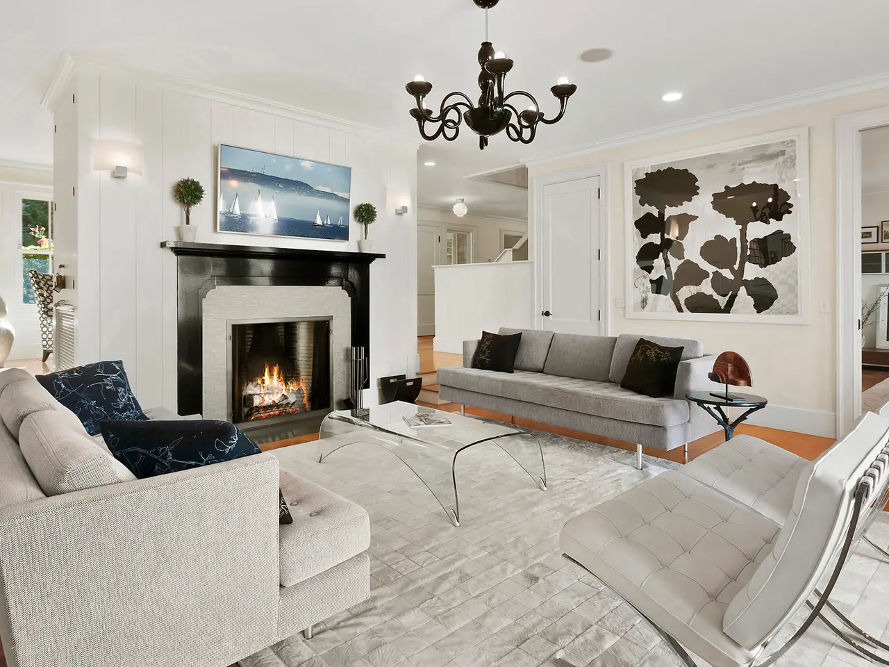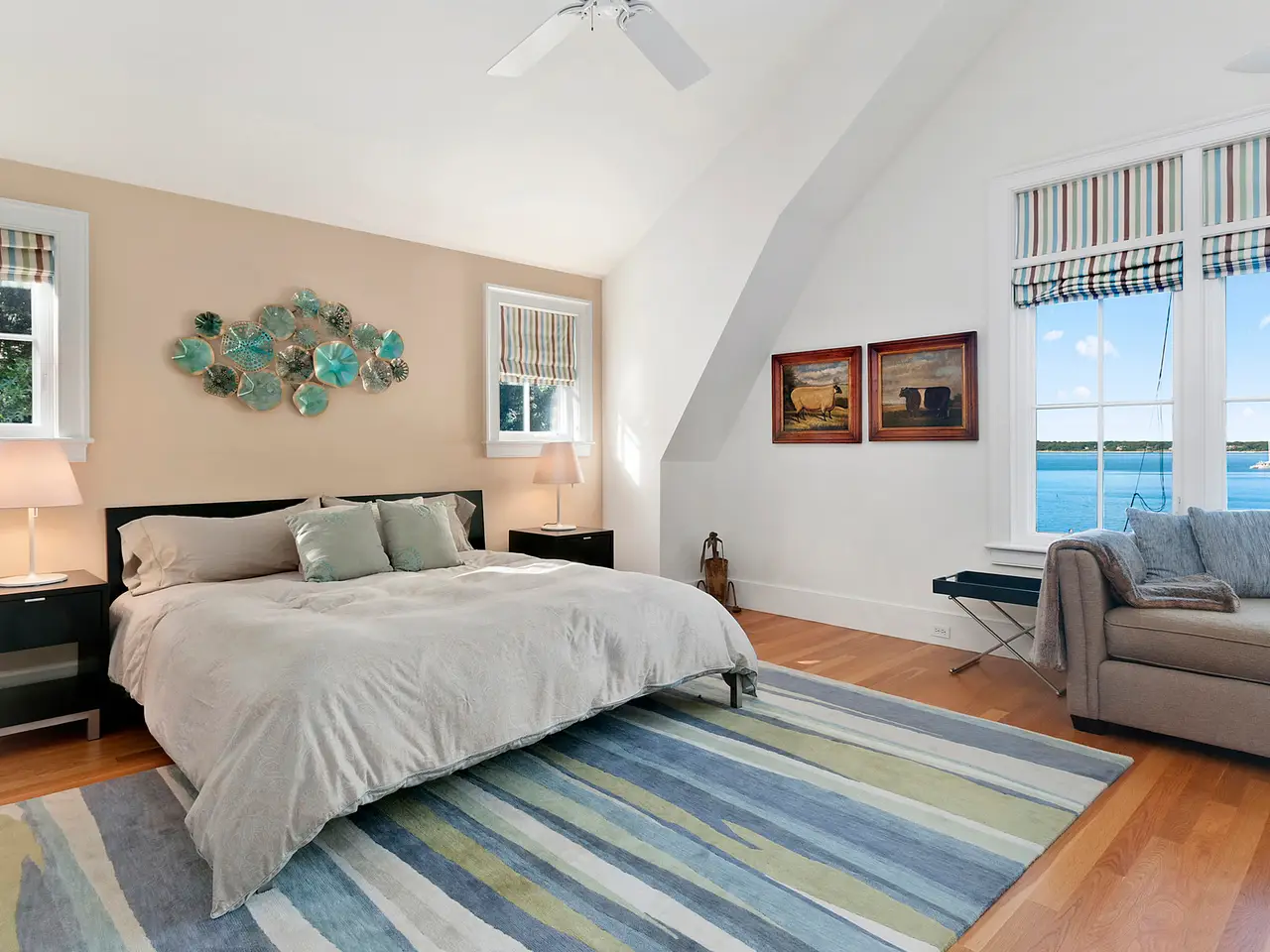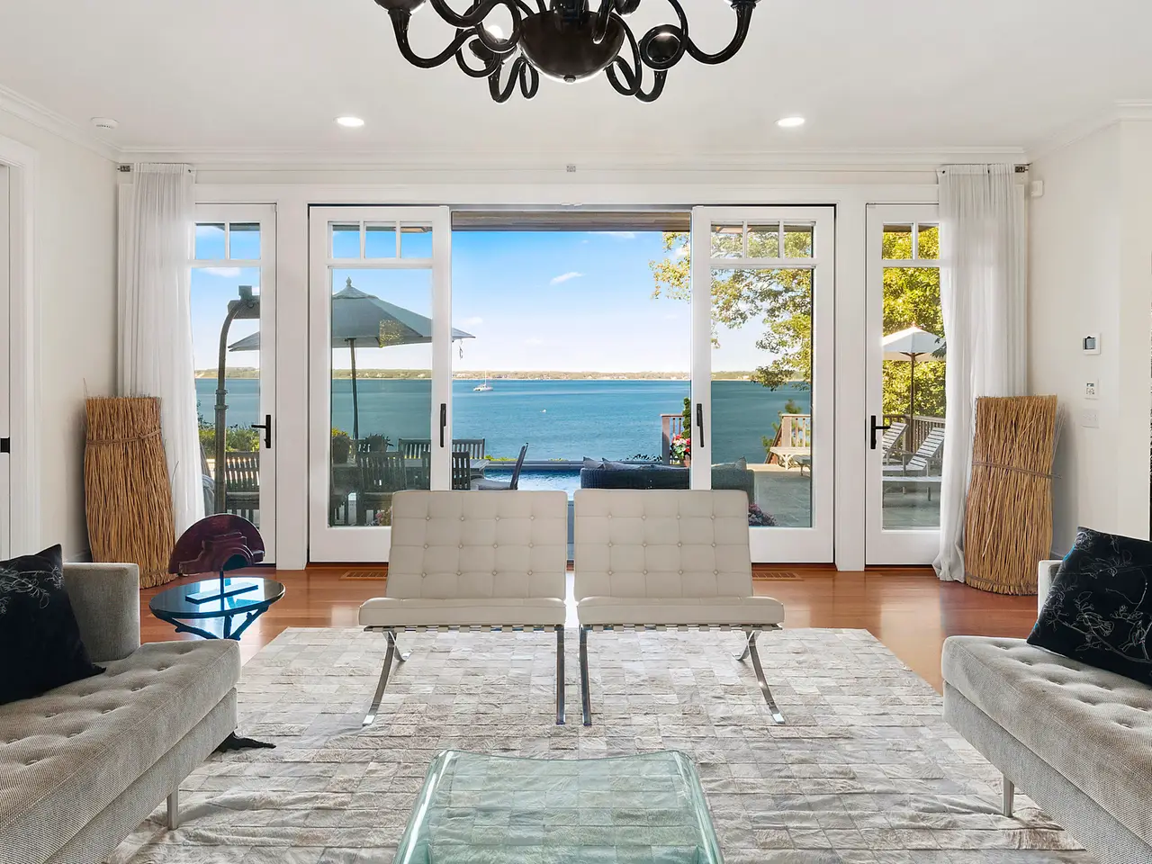 Tastefully decorated in a comfortable modern style by a team of international designers, this gorgeous 9,000 sq.ft. 6-bedroom, 7.5 bath home, sits on 1 secluded acre with 153' of water frontage and includes direct access to a semi-private beach on Noyac Bay. With breathtaking views of the bay from almost every room, this home has it all. Views of the water are visible from the kitchen, dining area, living room, family room, den and second floor sitting area, as well as both primary bedrooms. The open, state-of-the-art kitchen has 2 dishwashers, 2 sinks and everything a chef might need. Other highlights include four fireplaces, hardwood floors throughout, high-speed internet via a robust mesh network, Sonos music system throughout, CAC, and a gym/office accessible from both the house and a private entrance. The second floor holds 4 ensuite bedrooms, two King with water views and two Queen which share a small terrace. One of the queen beds can be replaced with two twins upon request. All four second bedrooms surround a large sitting area which has a terrace overlooking the water. The lower level has two bedrooms and a large, shared bathroom, as well as a media area with a large flat screen TV and a 200+ bottle wine refrigerator. Also located on the lower level is a game room with a convertible pool/ping pong/air hockey table. The lower level also has direct access to the pool and backyard. The outdoor area has a large patio for entertaining, a plumbed gas grill and a heated pool and spa. A wide stairway leads down to the water. To top it off, both Cromer's and Long Beach are just a short distance from the home.