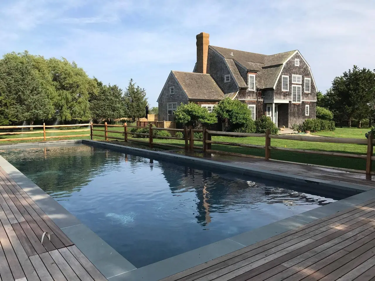 Down a flag drive is a magical spot bordering a farm. The property offers sweeping views and sounds of the ocean waves. You are greeted by a stand of hydrangea and flowering trees. This three bedroom 3.5 bathroom home was designed by a Southampton architect. The open floor plan offers lots of light and French Doors to let the outside inside. The first floor has a living room with an especially tall fireplace and dining area. The state-of-the-art kitchen is open to a sunroom for dining and relaxing. A pantry, laundry room and half bath are off of the kitchen. There is a library that could work for additional sleeping with a full bathroom. Second floor has a master bedroom bathroom suite with a deck that provides magnificent views, two additional bedrooms and hall bathroom, and a loft/office area. There are ceiling fans, an outdoor shower, and large deck for summer entertaining. It is easy to bike to Sagg Main Beach or Gibson Beach and to fish off of the bridge on Bridge Lane. You could also kayak to the beach from the bridge on Bridge Lane where kayaks are available for rent. Very special home with architectural integrity. A 16' x 54' heated Gunite pool is off to the side and child safe. Available for any two weeks in August for $50,000. Listing ID;754727