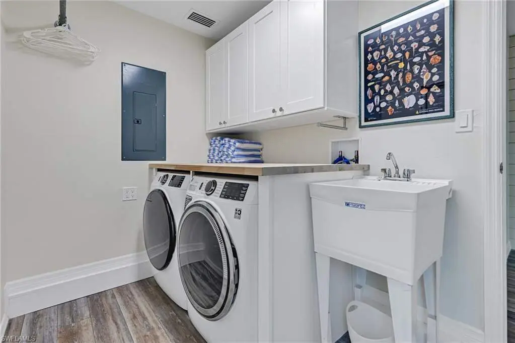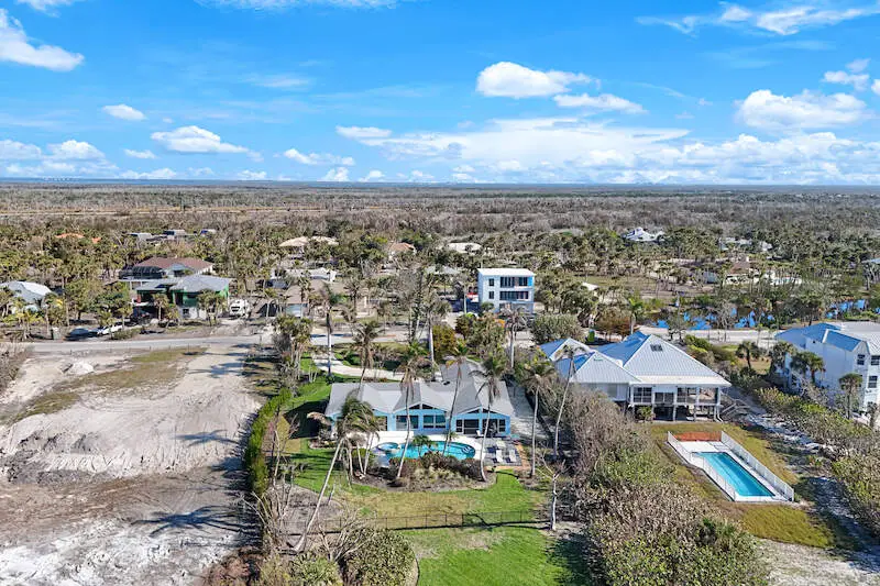 Gulf frontage. This coastal oasis with a mid-century modern feel boasts an acre of tranquil privacy in a garden-like setting with a meandering path to the water's edge to play in the warm sand or enjoy the gulf waters. The rear chateau like elevation is complimented by a large patio area providing room for outdoor dining/seating, a sparkling pool and spa perfect for a cooling swim, sunbathing poolside, or spending the evening in the spa soaking up the warmth and breathtaking sunset views. This home has been completely remodeled down to the studs and features a newer roof, impact glass windows and doors, pool scheduled to be resurfaced in Summer 2025 and much more. Ideal setting for entertaining, you will appreciate the inviting main gathering area with vaulted cypress tongue and groove ceiling, new flooring, three arches in the home, sliding doors from each room with western exposure and chic furnishings to compliment the ultimate Island retreat. This stately neighborhood of Chateau Sur Mer offers just 70 home sites, casual elegance and privacy. Exterior images are pre-Milton and landscaping is in the process of being nurtured or replaced. Great rental; future bookings to be honored.