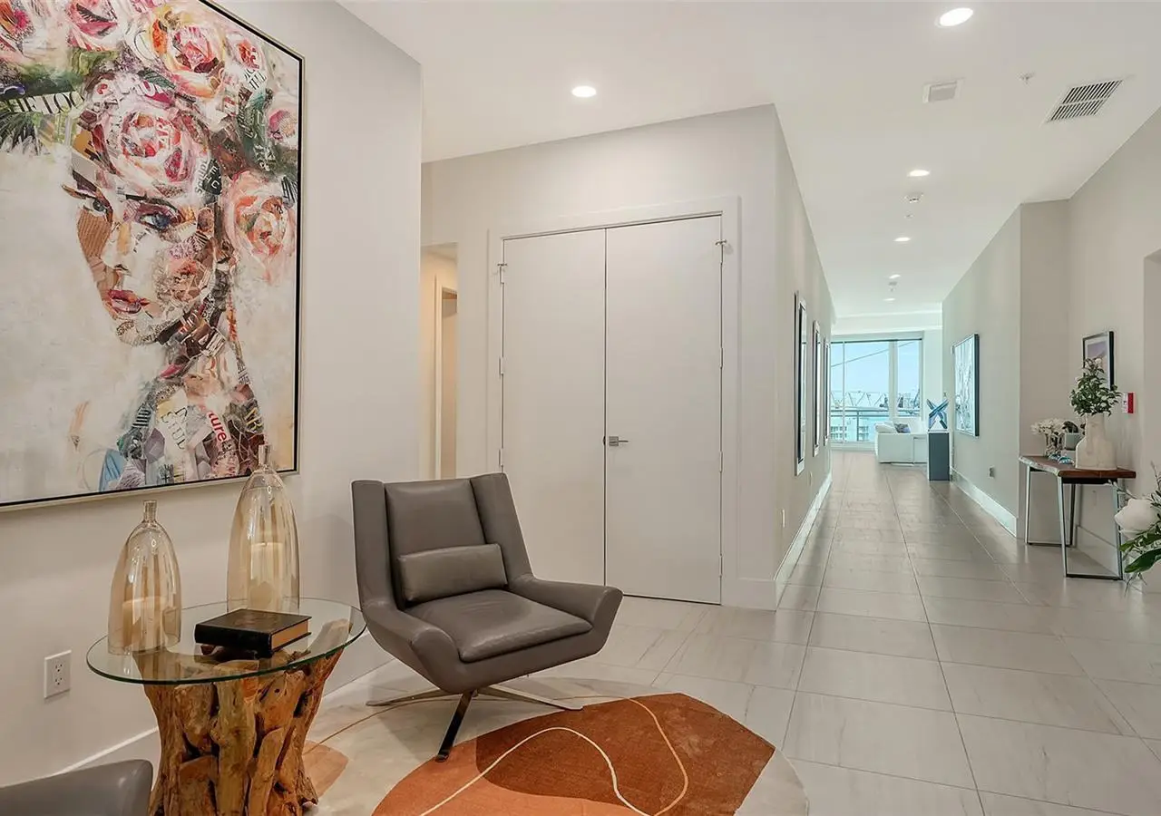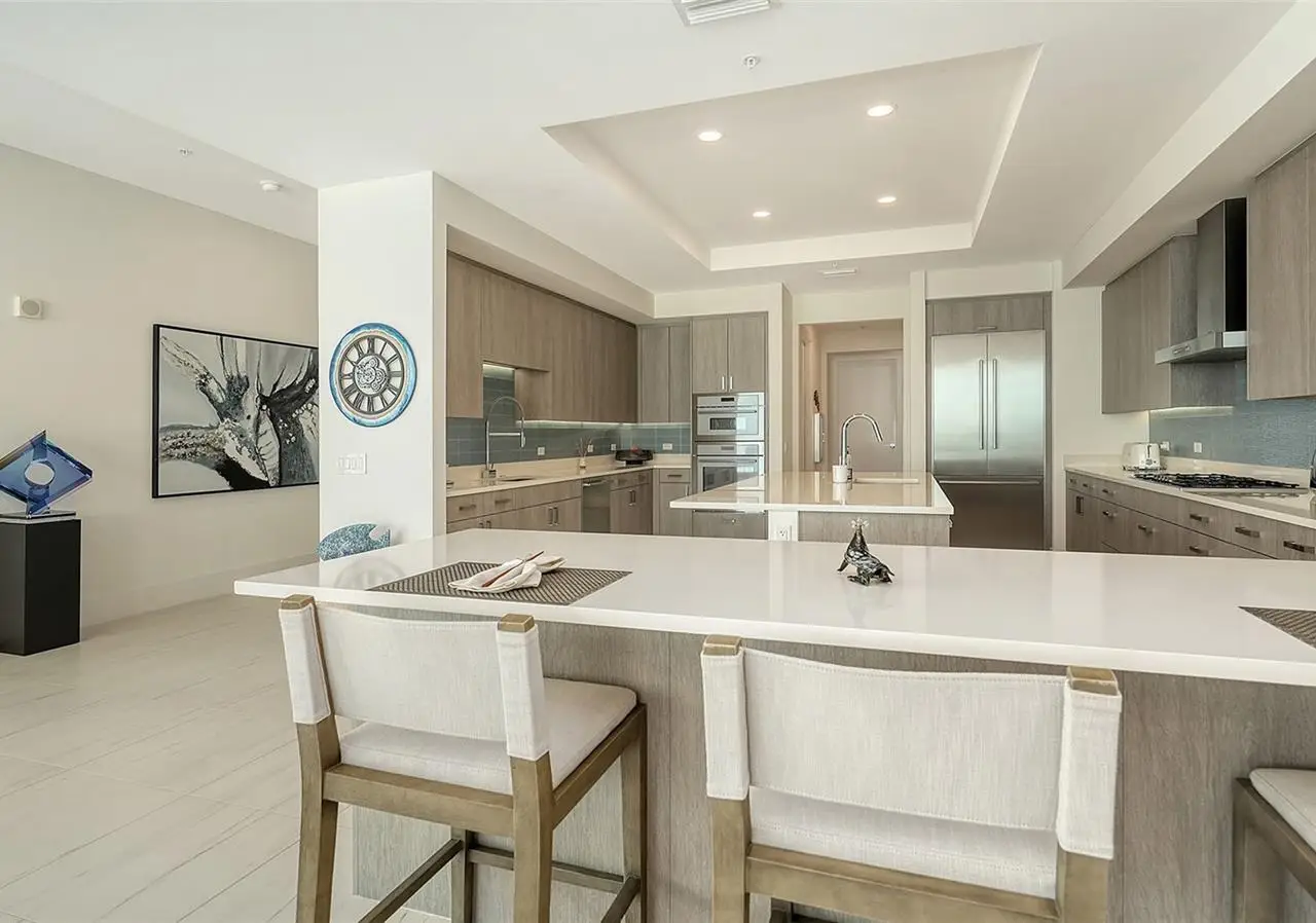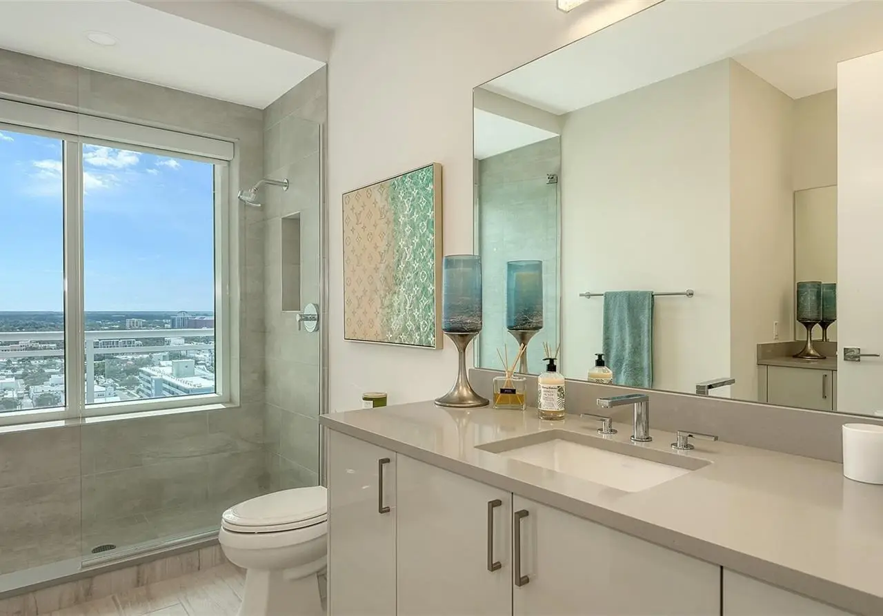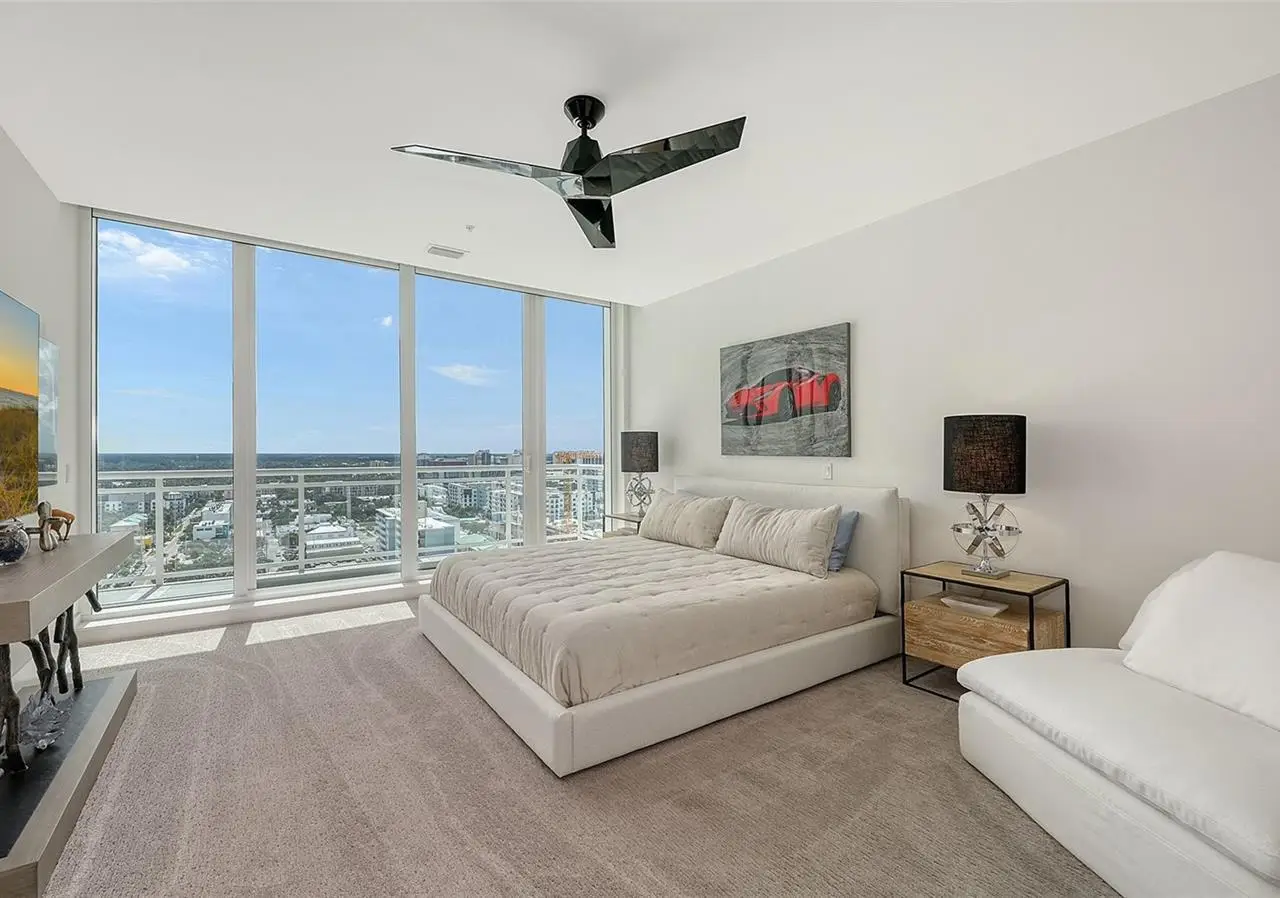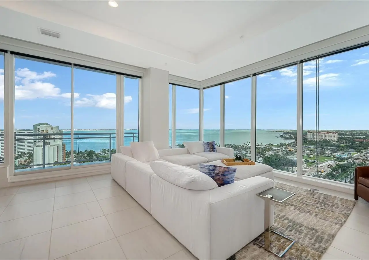 Welcome to the BLVD, where breathtaking views define the home experience! This architecturally stunning, modern condominium stands perfectly positioned in the Bayfront District of downtown Sarasota. Indulge in a luxurious residence soaring above Sarasota Bay, ideally located on the 17th floor, featuring expansive glass walls that offer breathtaking and unobstructed bay views to the north and west, and city views to the east. At this premier address, residents are among the elite who are privileged with an exclusive standard of living. This iconic building offers high-quality interior finishes and advanced coastal construction and design. From the moment you step through the entrance of the private access elevator, the tone is set for the entire space and lifestyle. The flow-through floorplan highlights magnificent bayfront and city views, with impact windows and sliding glass doors leading to several large terraces. Elegant tile flooring and glass railings create a seamless connection between the indoor and outdoor spaces, framing boundless vistas. The expansive great room boasts lofty ceilings, custom lighting, and large tile flooring - ideal for entertaining guests. A culinary showpiece, the kitchen features designer tile backsplash that complements the sleek cabinetry and designer lighting, adding sophistication throughout. An oversized island, complete with high-end quartz countertops and ample storage, anchors the space. For wine enthusiasts and culinary connoisseurs, this remarkable kitchen also features top-of-the-line Thermador appliances with a 6-burner gas cooktop, built-in wall oven, wine fridge, and two spacious pantries with custom shelving. The expansive primary bedroom is complete with two exquisite custom walk-in closets, with a spa-like bath boasting a soaking tub and an oversized glass shower. Two oversized bedroom suites feature private terrace access and luxurious spa-like baths. A powder room and spacious laundry room round out the interior. Quality and comfort are at the forefront, evident with a state-of-the art smart automation system with Lutron lighting, and motorized shades system. Additional highlights include three glass-railed terraces, custom lighting and 8' solid-core doors. BLVD hosts only forty-nine residences and sets itself apart with its unparalleled hotel-inspired amenities and full-time concierge. Residents will enjoy a social club room with a service bar, well-equipped fitness center, conference room, temperature-controlled wine room with private lockable showcases, indoor driving range, and a dog grooming room. The expansive outdoor terrace offers additional outdoor lounge seating and convenient pet facilities. For those seeking ultimate relaxation, the rooftop, home to the best rooftop pool area in Sarasota, features a zero-horizon pool, lounge seating, covered outdoor summer kitchen, and fire pit. 1702 embodies the essence of Sarasota's lifestyle, where luxury meets sophistication. Strolling on the waterfront, exploring the diverse cuisine, or attending the cultural events in downtown Sarasota makes the BLVD a destination as well as home. And COMING SOON-1000 NORTH Sarasota, an exclusive members-only club located on the bottom floor of the BLVD, and centered in the heart of the city's cultural corridor. This private retreat will offer elevated dining, handcrafted cocktails, personalized concierge services, and private wine storage, delivering a blend of luxury, comfort, and sophistication.