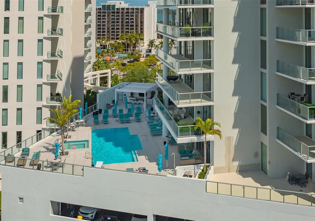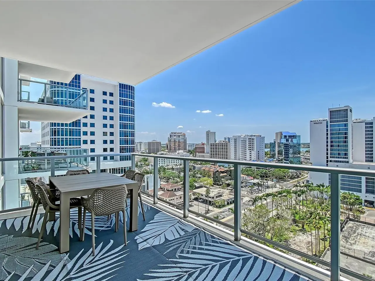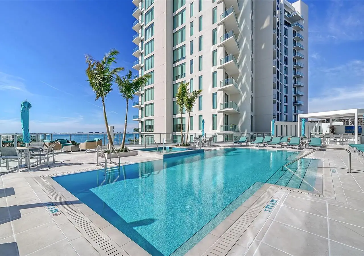 Prepare to be captivated by this absolutely stunning,12th-floor residence at Bayso, Sarasota’s most sought-after luxury tower at The Quay. With postcard worthy southern views of Sarasota Bay and the sparkling downtown skyline from every room, this extraordinary 2-bedroom plus den, 2.5-bath home offers nearly 1,600 square feet of refined sophistication and comfort. The moment you step inside, you’re greeted by a flood of natural light pouring through floor-to-ceiling glass, immediately drawing your eye to panoramic views that stretch endlessly across the bay and city. The elevated 20+ foot above sea level lobby sets the tone for the elegance that awaits above. Soaring 10-foot ceilings, porcelain tile flooring, and tastefully upgraded designer light fixtures throughout the home create a sleek and luxurious atmosphere. The spacious great room and dining area are the heart of the home; perfectly suited for entertaining, relaxing, or simply soaking in the view with your morning coffee or evening glass of wine. This is where everyday living transforms into something exceptional. Step outside to your oversized private terrace with glass railings and indulge in the beauty of Sarasota’s ever-changing skyline. The kitchen is a true showpiece, featuring European-inspired Italkraft cabinetry, glistening quartz countertops, a large center island with rollout drawers, premium Jenn-Air stainless steel appliances including an induction cooktop and double oven; making it ideal for both the everyday chef and the culinary enthusiast. The owner’s suite is a tranquil retreat, offering a spacious walk-in closet with custom built-ins and a spa-like bath complete with Grohe fixtures, double vanity with Robern recessed medicine cabinets, a separate water closet, and a glass-enclosed walk-in shower. The guest suite enjoys its own spectacular views, generous closet space, and a beautifully designed en-suite bath. A versatile den is outfitted with a custom wall unit with a queen-size Murphy bed, offering flexibility as a third bedroom, office, or private media space. A stylish powder room and an oversized utility room with full-size washer and dryer and abundant storage complete this perfectly designed residence. Bayso offers an unmatched array of resort-style amenities. Residents enjoy a 24/7 attended lobby, on-site management, and access-controlled security. The fifth floor is your personal oasis; featuring an elevated pool and spa deck over 60 feet above sea level, outdoor entertainment lounges, kitchen and grilling areas, the serene Splash Lounge, a state-of-the-art fitness center, movement studio, and a private dog park. There's even a formal club room with catering kitchen, co-working spaces, a boardroom for business meetings, secured Wi-Fi throughout all amenity spaces, and a mail room with package storage. The residence includes a premium assigned parking space in the private garage, climate-controlled storage, and there is also separate bicycle storage for the residents. All of this just steps from Sarasota’s thriving arts scene, award-winning dining, boutique shopping, and cultural venues; with the white sands of Lido Key, Longboat Key, and Siesta Key just minutes away. Whether you're seeking an elegant year-round home, a chic pied-à-terre, or a lock-and-leave retreat in one of Florida’s most desirable cities, this residence is your invitation to live the dream. Schedule your private tour today and experience the very best of luxury living at Bayso.