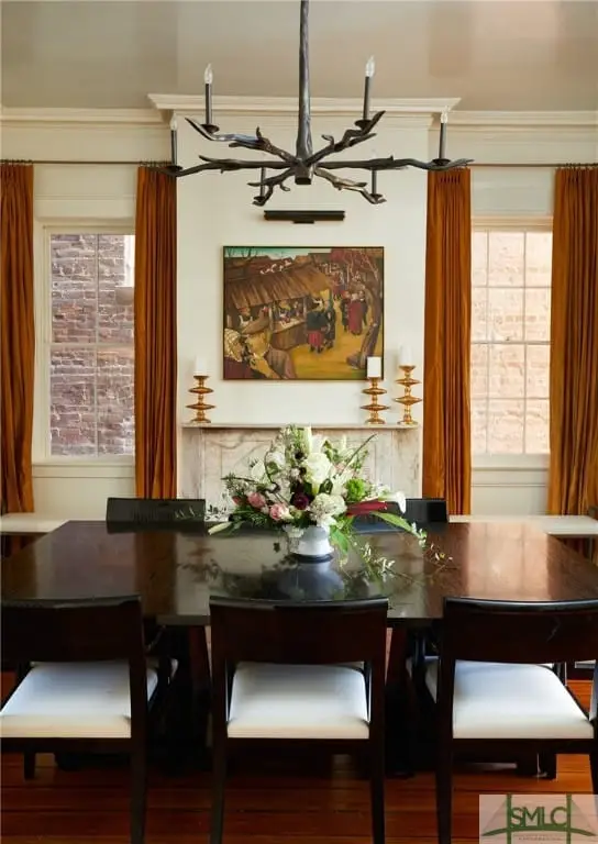 Enjoy unparalleled luxury and experience the pinnacle of downtown Savannah living at this exquisite freestanding c.1855 brick residence located in the heart of the Historic Landmark District on Monterey Square. Distinctive architectural design seamlessly blends period details with sophisticated modern elements. Couture-furnished interiors appointed with extraordinary natural materials and quality finishes are defined by beautifully proportioned light-filled spaces, soaring ceilings, exquisite plaster work, Old World craftsmanship, custom-lacquered finishes, hand-painted walls by renowned artist Bob Christian and custom lighting. The primary suite with private veranda stands apart as a sanctuary of style that occupies the entire second floor. A breathtaking chef's kitchen serves as a haven for home chefs and wine connoisseurs. This 5,500-plus square foot architectural masterpiece offers additional amenities, including stunning outdoor spaces, private elevator, garden-level apartment, two-car garage and much more.