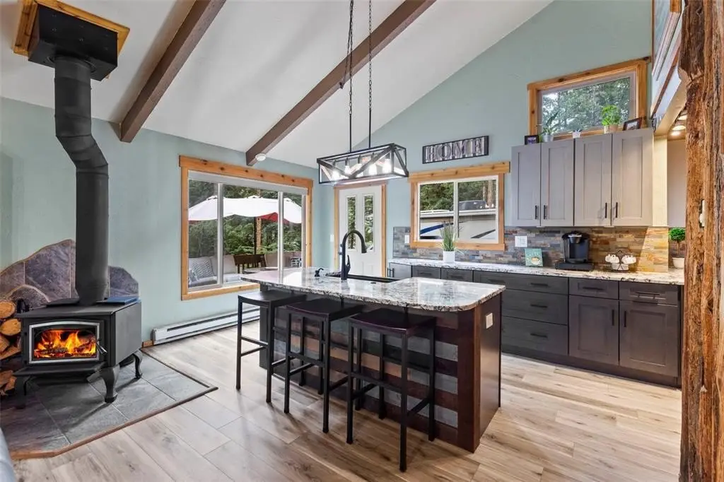 • Newly updated kitchen Huge wrap around deck overlooking river