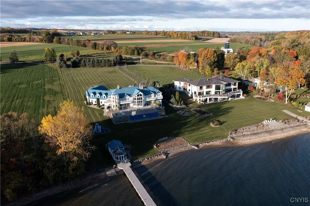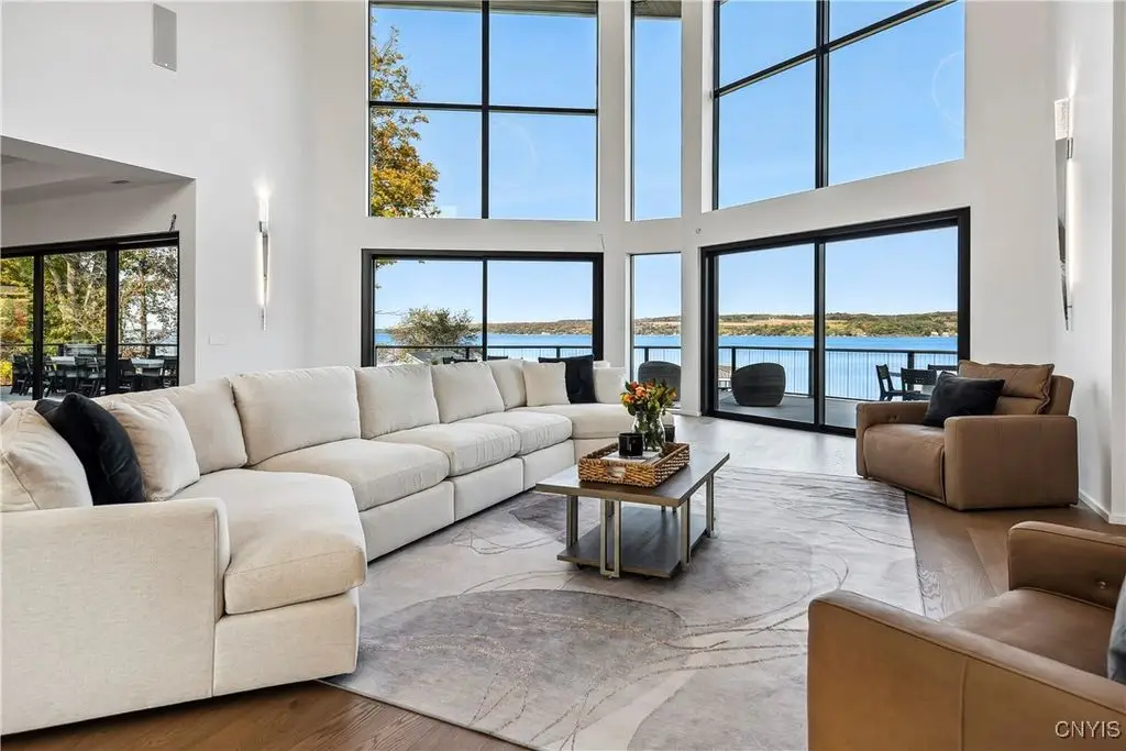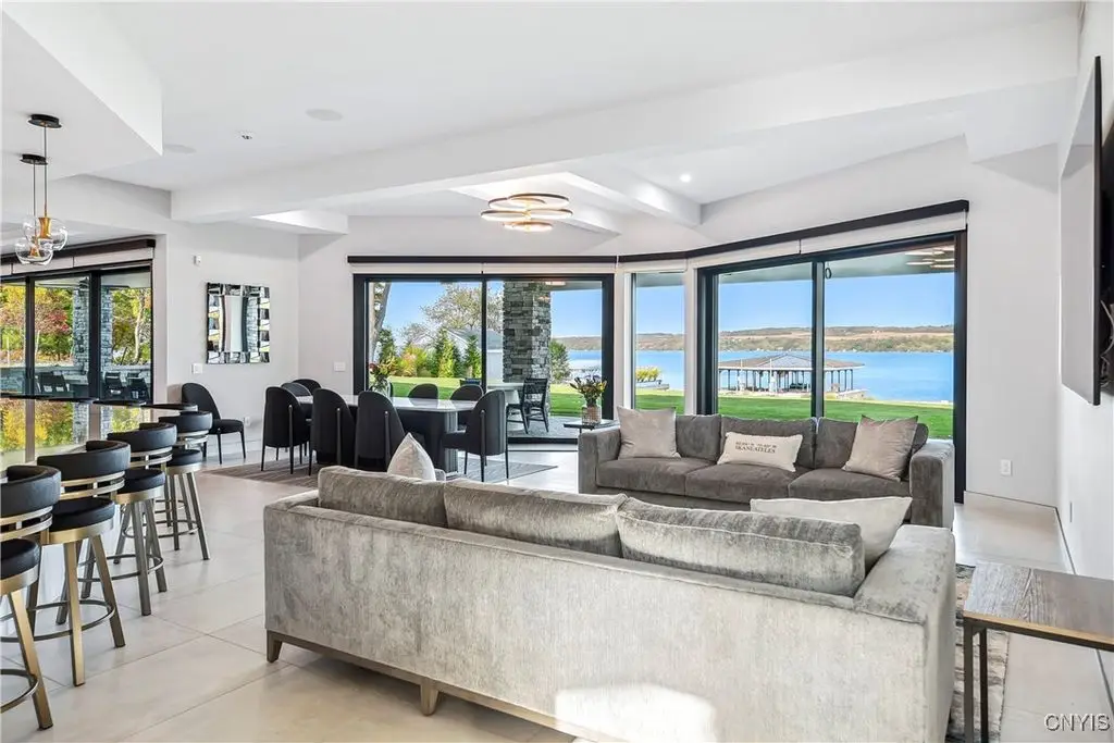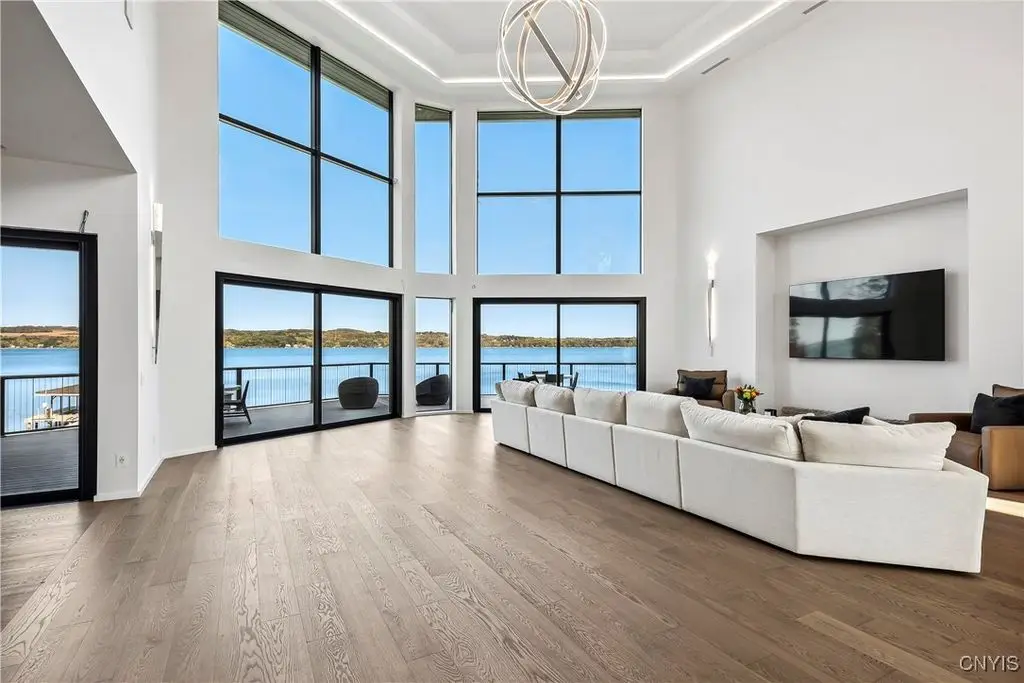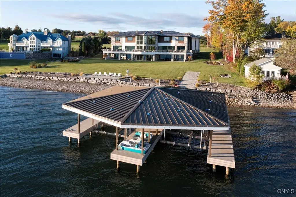 Wow, prepare to be amazed by this stunning custom-built contemporary home situated on 200 feet of pristine lakefront on Skaneateles Lake. With a fully developed waterfront perfect for all your lakeside and boating activities, this newly constructed "Mansion" offers luxury living at its finest. Featuring 9 bedrooms, 14 baths, 2 Chef's kitchens, a guest suite, and a full glass elevator accessing all levels of the home, no detail has been overlooked. State-of-the-art technology including Savant WIFI controlled custom blinds and lighting scenes, along with top-notch infrastructure, ensure convenience and comfort. Boasting over 12,000 square feet of living space with an adaptable floor plan, each bedroom comes complete with its own en-suite bath and custom California closets. The home exudes both space and privacy, providing a truly luxurious living experience. Located in the prestigious Skaneateles School District and just minutes from the charming Village of Skaneateles, this home offers an extensive list of impressive features and amenities. Don't miss the opportunity to make this incredible property your own.