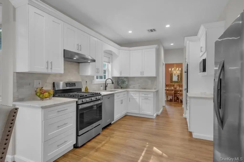 Welcome to 22 Whispering Woods Drive, located in the sought-after Smithtown School District! This beautiful home sits on a .35-acre property and boasts a true resort-style backyard. Step into the two-story entry foyer, where vaulted ceilings set the tone for this inviting home. The young, updated chef's kitchen is a true showstopper, offering plenty of counter space, a wine and coffee bar, and views of the stunning yard. Sliders off the kitchen lead to a paver patio, making summer barbecues easy and enjoyable. The yard is an entertainer's dream, featuring a sparkling inground pool with a new liner and heater, plus a relaxing hot tub. The first floor sitting room is the perfect place to unwind with a good book or can double as a home office. The thoughtful floor plan allows seamless entertaining between the living room, den, and kitchen, while the spacious dining room is ideal for hosting holiday gatherings. Upstairs, you'll find generously sized bedrooms, creating a private retreat for rest and relaxation. The full basement offers additional living space, perfect for a play area, home gym, or theater. Additional highlights include Updated roof and hot water system,150 Amp electric service, LED high hats throughout, Precast cesspool. This home blends style, function, and outdoor living for the ultimate lifestyle experience!