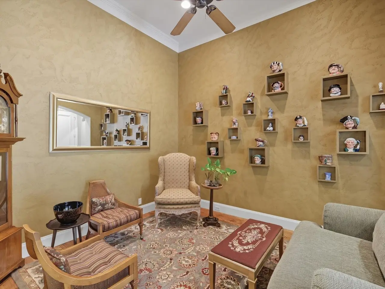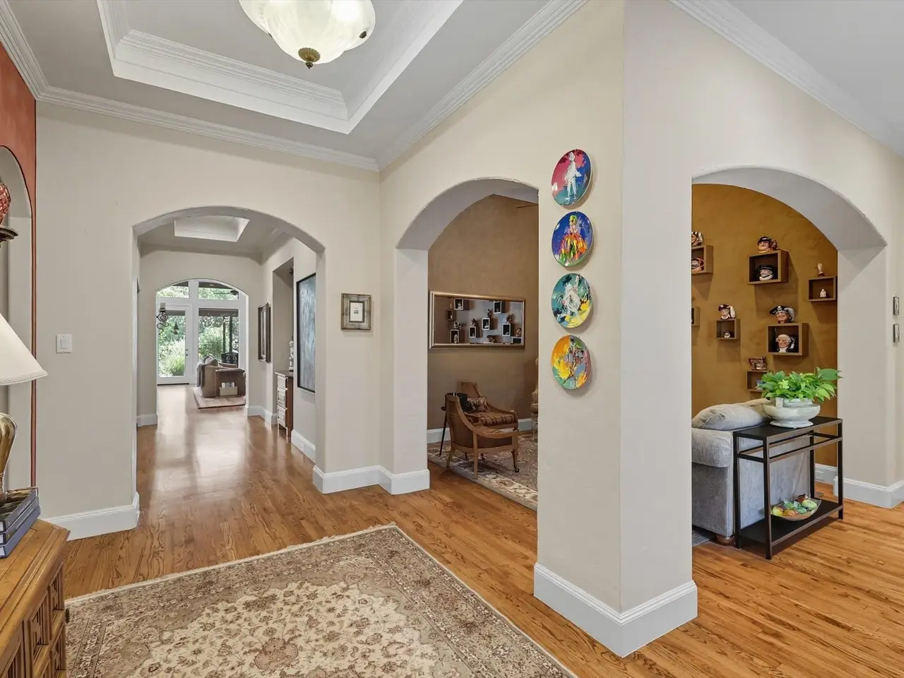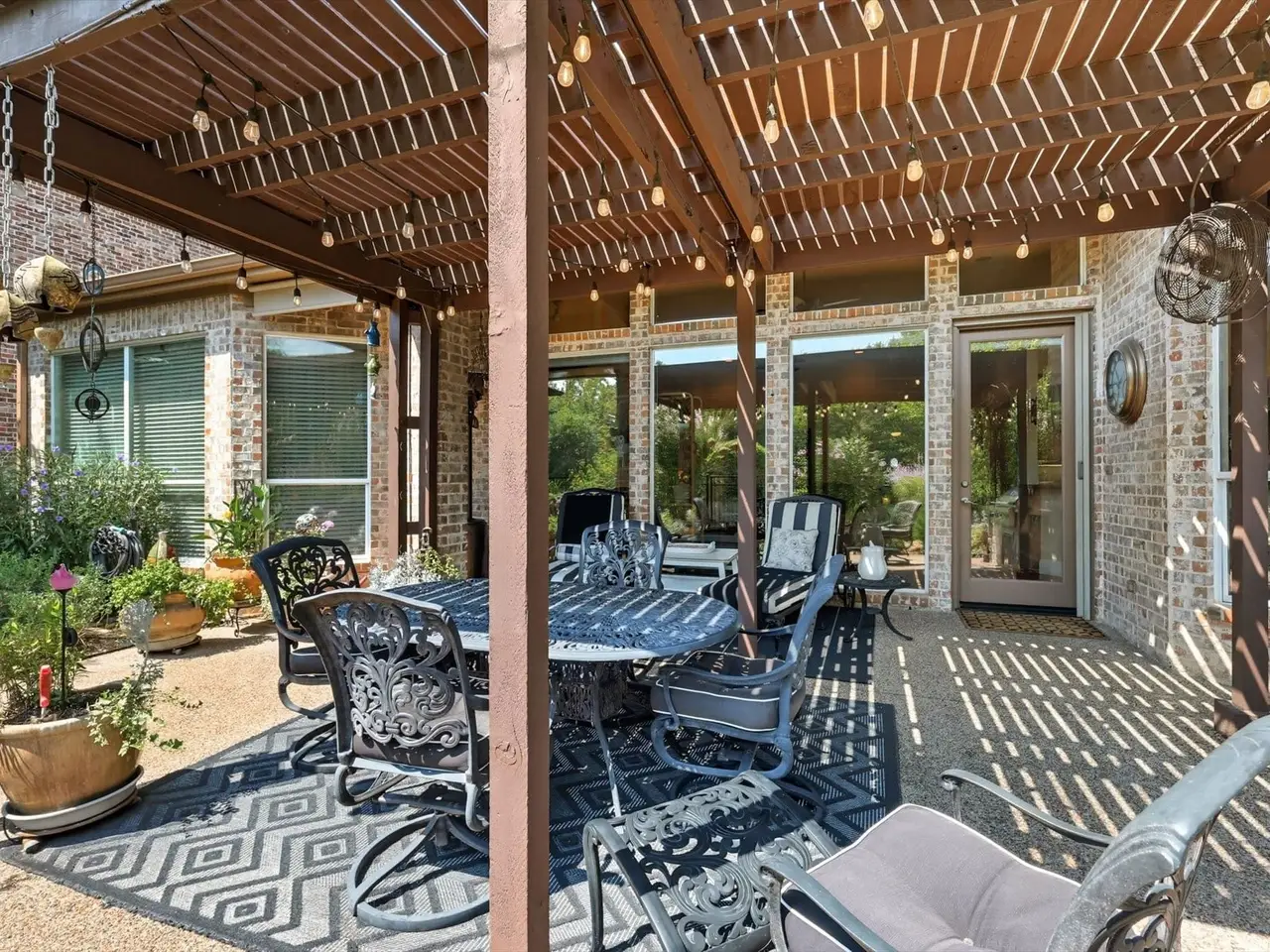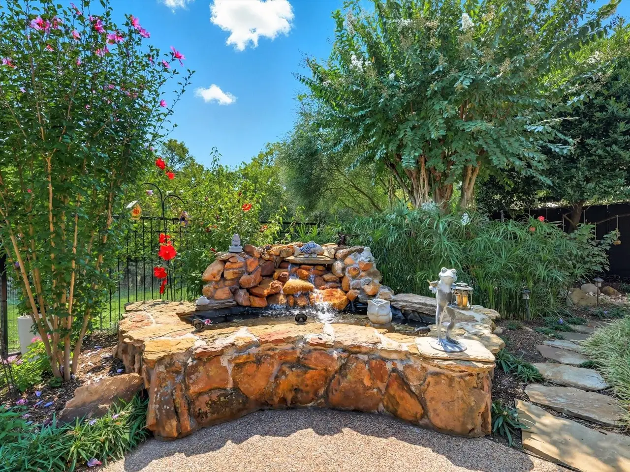 Immaculately maintained one-story home with fabulous curb appeal in the highly desirable Crescent Royale addition in Timarron. Hardwood floors throughout living areas, extra tall ceilings, and large living areas. Three bedrooms, three baths, two living areas and two dining areas. One bedroom currently being used as office. Lots of storage throughout. Spacious primary suite with huge bathroom, separate vanities, and large dual closets. Enjoy relaxing evenings in the stunning outdoor space with living area that includes summer kitchen with grill and burners, pergola, and soothing sounds of the rock waterfall and pond. Backyard features lush landscaping and easy maintenance and backs to green space for privacy. HOA maintains front yard. Roof replaced 8-25; water heaters replaced 2024, new fireplace 8-25.