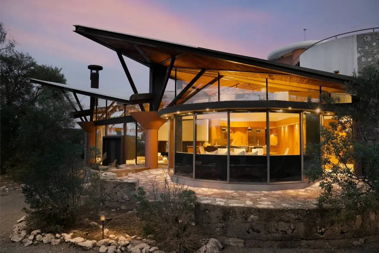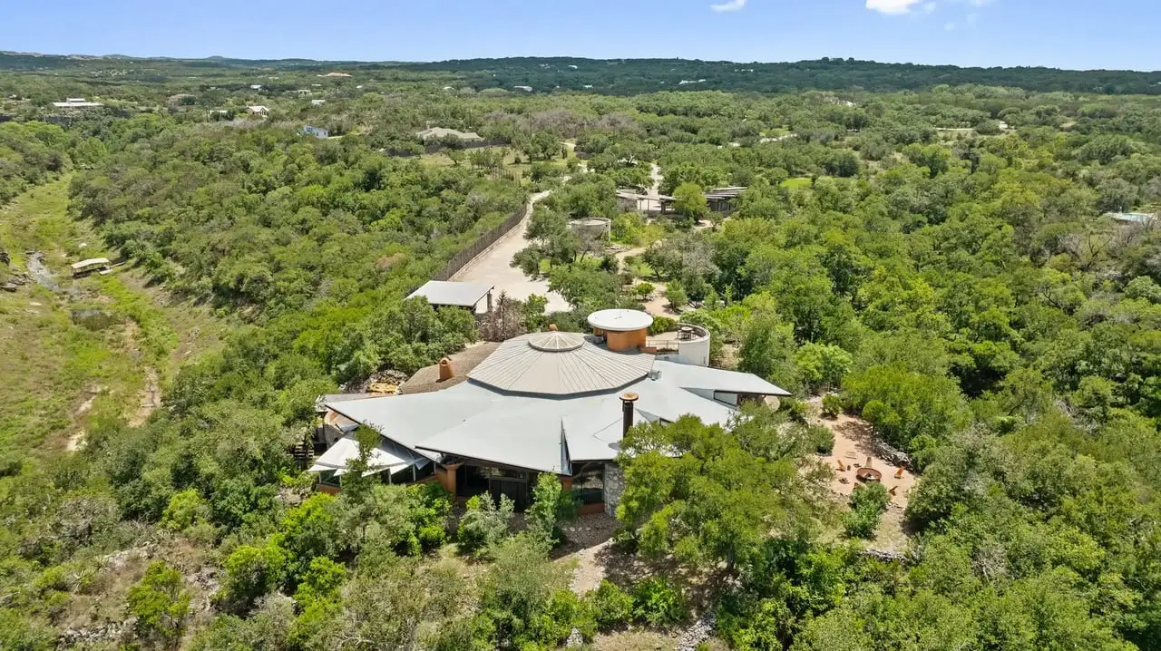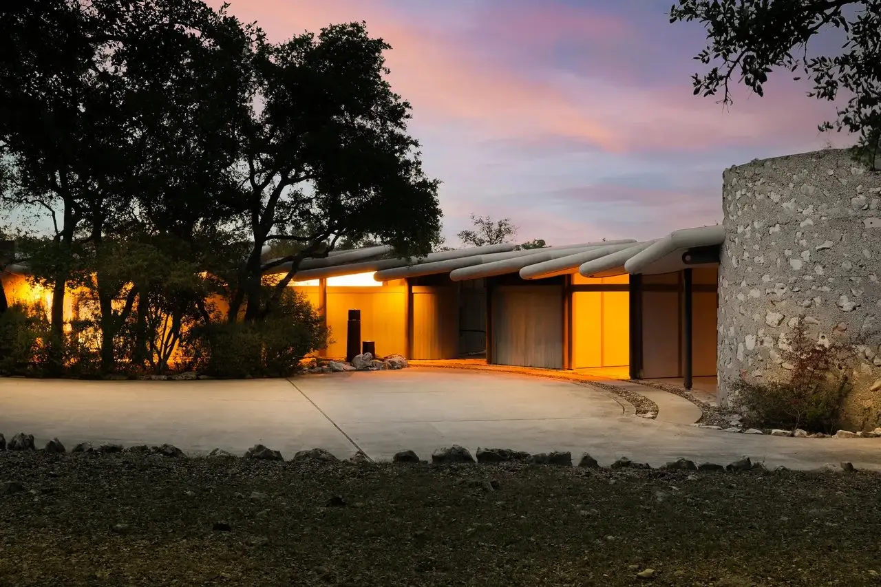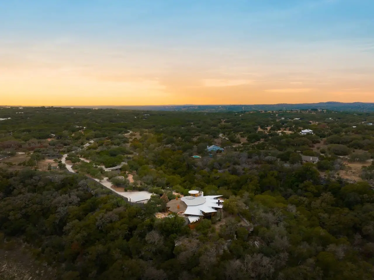 Architecturally Significant Compound in Spicewood | Once-in-a-Lifetime Retreat in Spicewood Once in a lifetime chance to own this culturally and architecturally significant home in the Hill Country, designed by John Covert Watson, an intern of Frank Lloyd Wright’s. Set on 30 stunning acres in Spicewood, The Retreat at Lick Creek Lodge is a one-of-a-kind compound offering the architecture lover the opportunity to be surrounded both by exquisite design and natural beauty. Defined by its hyperbolic parabola roof which resembles a splayed deck of cards, this home is striking inside and out. The roof creates a semi-circular motif that is repeated throughout the house, from the entry rotunda to the arching wall of glass that spans the living room and looks out to the tangle of nature enveloping the home. Interiors Celebrating Local Materials | Memorable Entertaining and Private Hideaways The interior is a celebration of the Texas Hill Country, making use of locally harvested cedar and nearby-quarried desert masonry contrasted with concrete, steel and glass. Cork floors plus rich oak and maple cabinetry add warmth and richness. An extraordinary entertaining space, the living room arches around a limestone fireplace and looks out over the rolling hills; it has hosted galas and concerts when not serving as a private retreat. The floorplan offers many unique hideaways, from a secret-door-accessed office to a serene meditation room. Roam 30 Acres with a Grotto Pool | Miles of Views with Resort Amenities The 30-acre property is set on a cliff over the Pedernales river and overlooks steep ravines and miles of green hills. Step down the hillside to the grotto pool, half-hidden in a rocky crevasse, where you can swim as if you were on a desert island. The ultra-private compound includes a large guest house and office at the front of the property; you will wend your way along gravel paths and native landscaping to reach the main house. Just 40 minutes from Austin, this property offers multiple uses, from a close-in family retreat to executive escape or small resort rental. Regardless, this property will continue to fascinate, inspire and restore its owners for years to come.