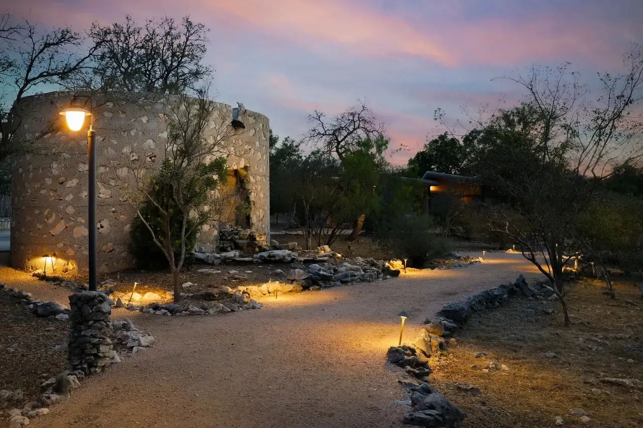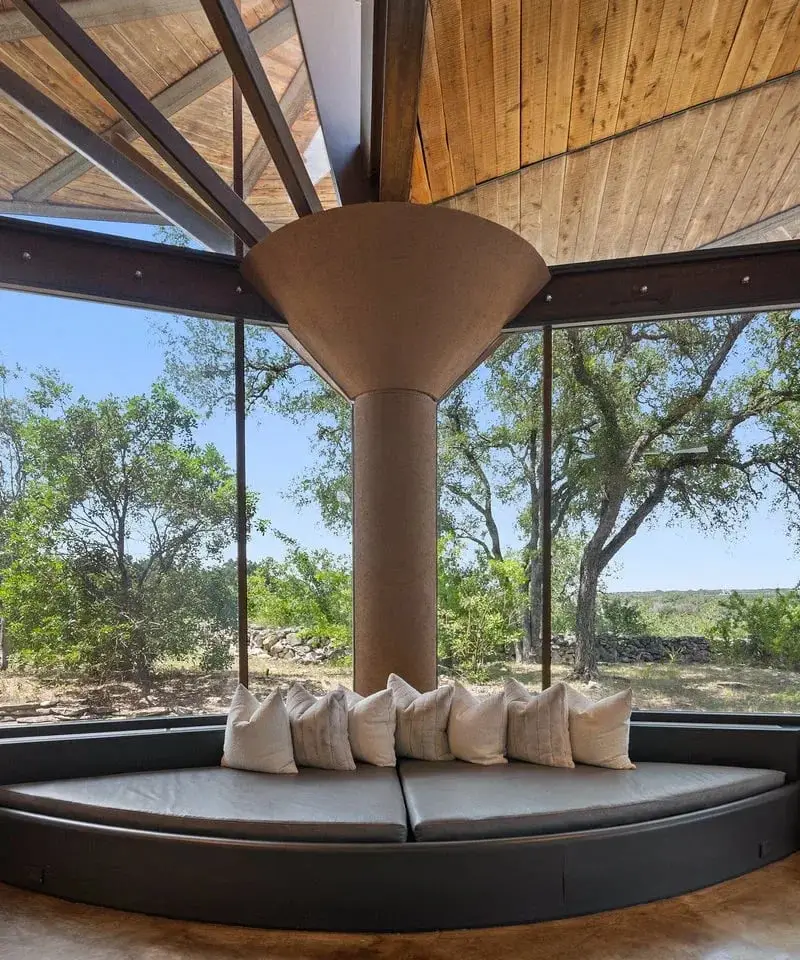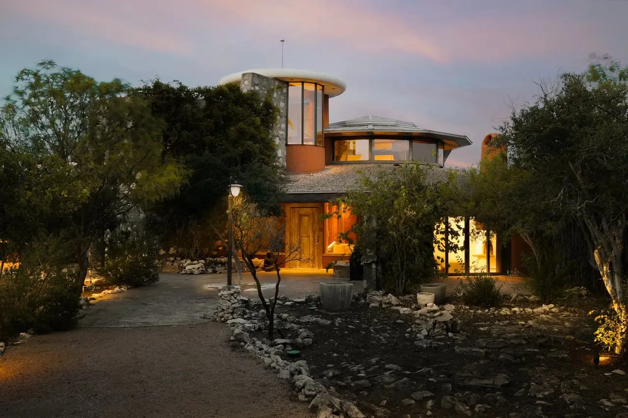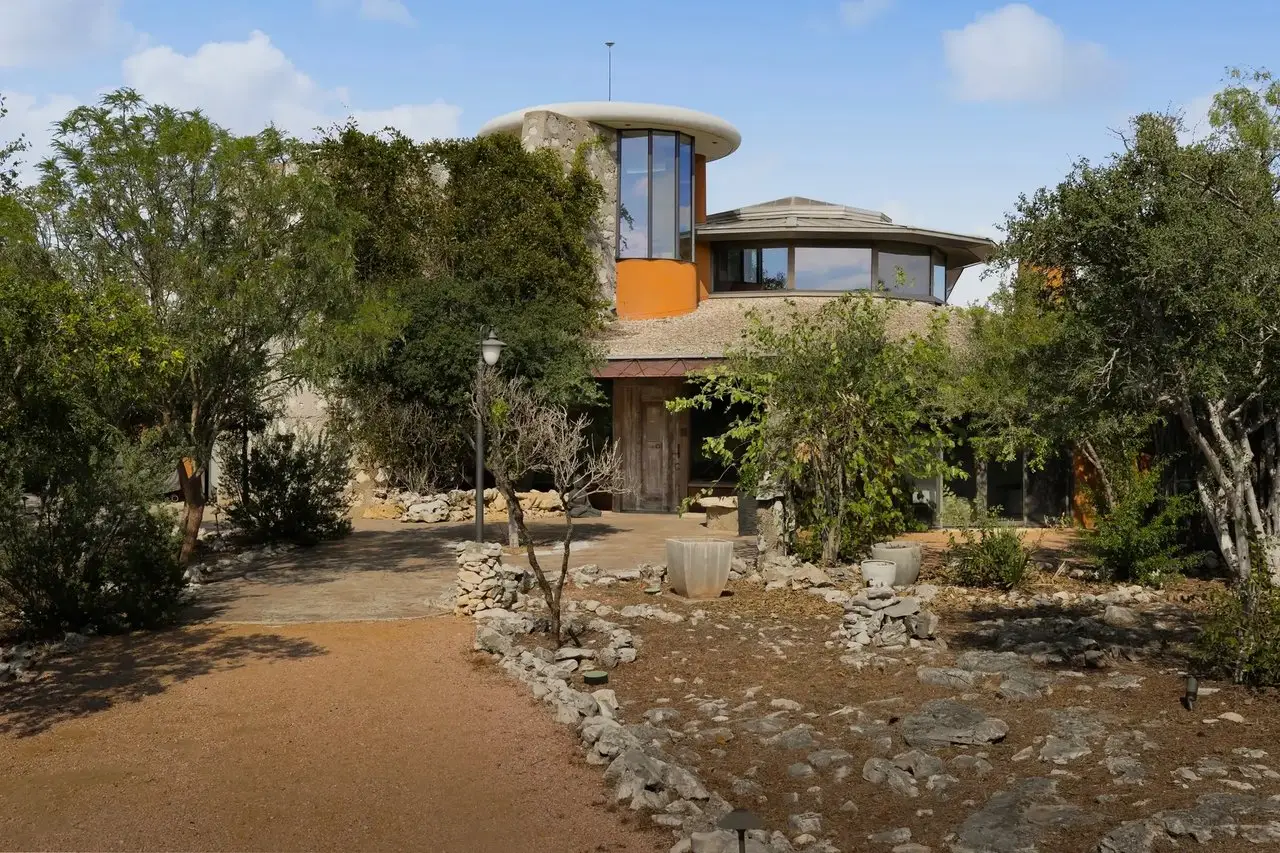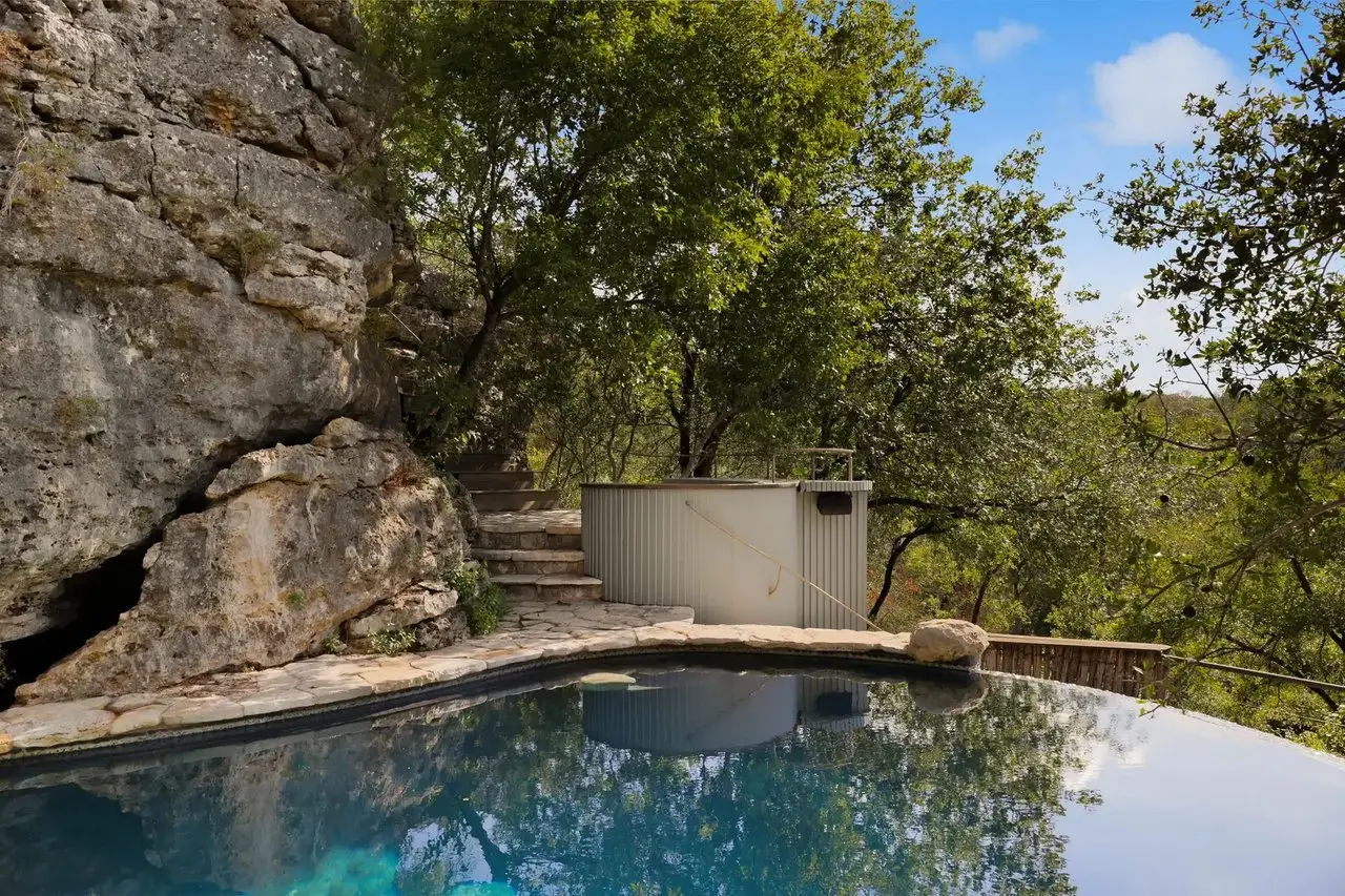 Architecturally Significant Compound in Spicewood | Once-in-a-Lifetime Retreat in Spicewood Once in a lifetime chance to own this culturally and architecturally significant home in the Hill Country, designed by John Covert Watson, an intern of Frank Lloyd Wright’s. Set on 30 stunning acres in Spicewood, The Retreat at Lick Creek Lodge is a one-of-a-kind compound offering the architecture lover the opportunity to be surrounded both by exquisite design and natural beauty. Defined by its hyperbolic parabola roof which resembles a splayed deck of cards, this home is striking inside and out. The roof creates a semi-circular motif that is repeated throughout the house, from the entry rotunda to the arching wall of glass that spans the living room and looks out to the tangle of nature enveloping the home. Interiors Celebrating Local Materials | Memorable Entertaining and Private Hideaways The interior is a celebration of the Texas Hill Country, making use of locally harvested cedar and nearby-quarried desert masonry contrasted with concrete, steel and glass. Cork floors plus rich oak and maple cabinetry add warmth and richness. An extraordinary entertaining space, the living room arches around a limestone fireplace and looks out over the rolling hills; it has hosted galas and concerts when not serving as a private retreat. The floorplan offers many unique hideaways, from a secret-door-accessed office to a serene meditation room. Roam 30 Acres with a Grotto Pool | Miles of Views with Resort Amenities The 30-acre property is set on a cliff over the Pedernales river and overlooks steep ravines and miles of green hills. Step down the hillside to the grotto pool, half-hidden in a rocky crevasse, where you can swim as if you were on a desert island. The ultra-private compound includes a large guest house and office at the front of the property; you will wend your way along gravel paths and native landscaping to reach the main house. Just 40 minutes from Austin, this property offers multiple uses, from a close-in family retreat to executive escape or small resort rental. Regardless, this property will continue to fascinate, inspire and restore its owners for years to come.