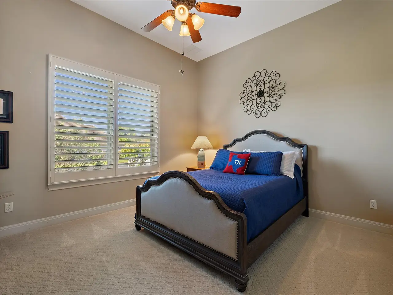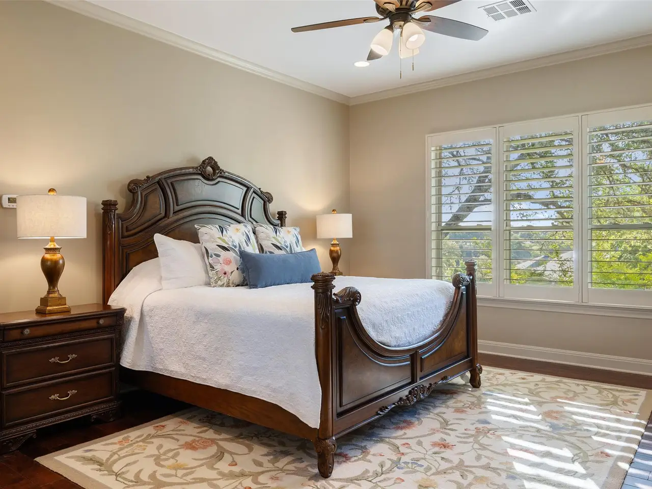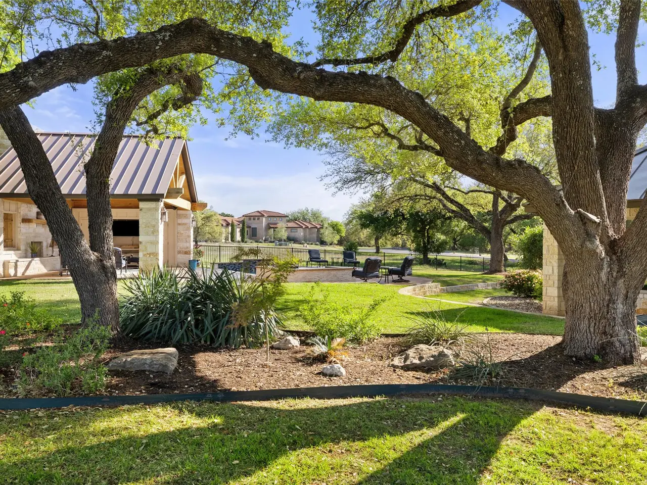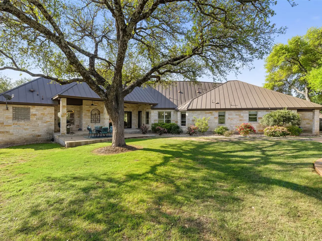 Located in the prestigious gated and guarded Barton Creek Lakeside community, this single-story custom home offers a seamless blend of Hill Country charm and modern comfort. Situated on a large 0.68-acre corner lot, the property is surrounded by mature oak trees and features a wide paver driveway and spacious covered patios perfect for outdoor living. The open-concept living and kitchen area is highlighted by a large center island, granite countertops, and wood shutters throughout. With an in-law floor plan and wide entryways, the home is designed for accessibility and ease of living. One of the bedrooms, located privately at the rear of the home, is ideal as a guest suite, office, or hobby space and includes its own bathroom & outdoor patio. Additional features include a 3-car attached garage, plantation shutters, a laundry room with utility sink, and beautiful wood and brick flooring. The expansive covered back patio and fenced yard provide a tranquil setting to enjoy the peaceful Hill Country surroundings. Barton Creek Lakeside offers access to a private country club with an 18-hole Arnold Palmer-designed golf course, fitness center, tennis courts, Olympic-sized pool, and Lake Travis access. Just a short drive to Spicewood and the surrounding Hill Country, this home combines quality construction, generous space, and resort-style amenities in a quiet, upscale community.