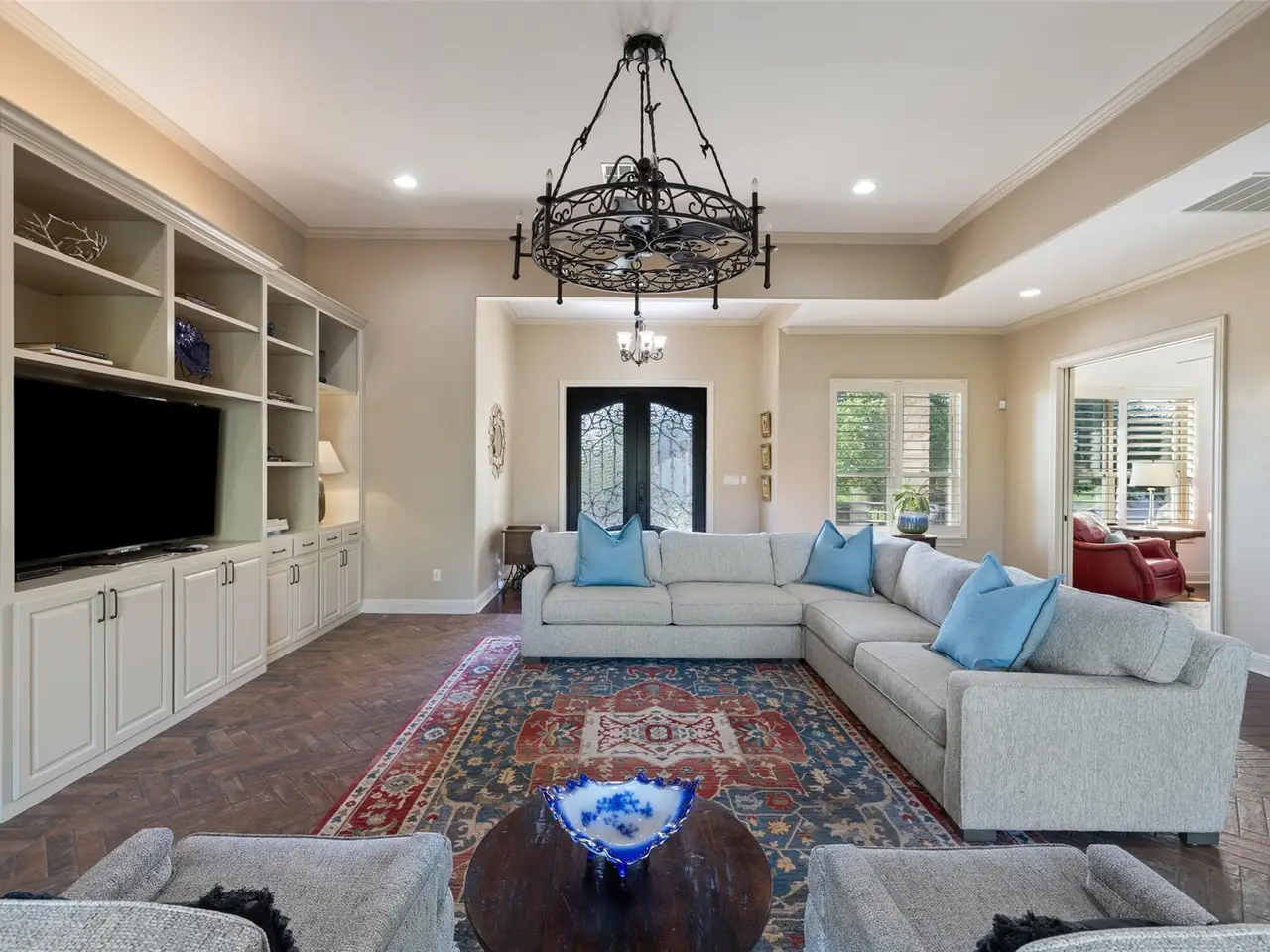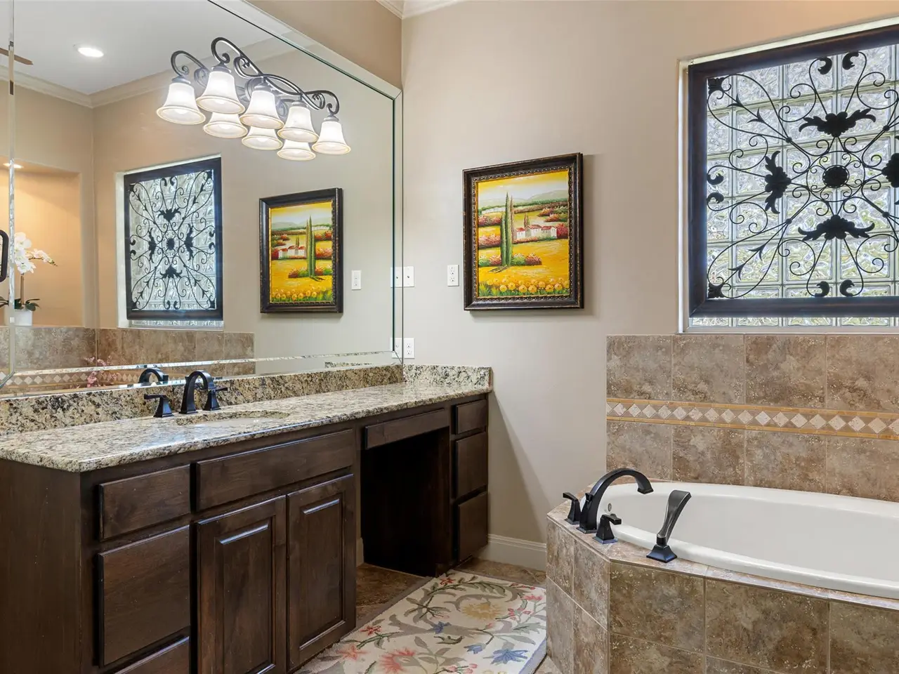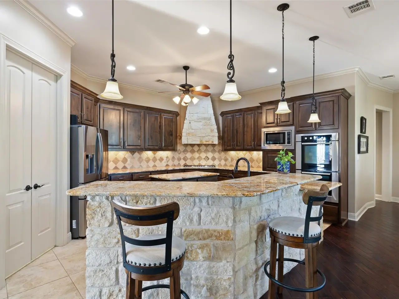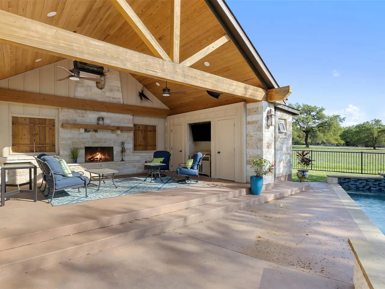 Located in the prestigious gated and guarded Barton Creek Lakeside community, this single-story custom home offers a seamless blend of Hill Country charm and modern comfort. Situated on a large 0.68-acre corner lot, the property is surrounded by mature oak trees and features a wide paver driveway and spacious covered patios perfect for outdoor living. The open-concept living and kitchen area is highlighted by a large center island, granite countertops, and wood shutters throughout. With an in-law floor plan and wide entryways, the home is designed for accessibility and ease of living. One of the bedrooms, located privately at the rear of the home, is ideal as a guest suite, office, or hobby space and includes its own bathroom & outdoor patio. Additional features include a 3-car attached garage, plantation shutters, a laundry room with utility sink, and beautiful wood and brick flooring. The expansive covered back patio and fenced yard provide a tranquil setting to enjoy the peaceful Hill Country surroundings. Barton Creek Lakeside offers access to a private country club with an 18-hole Arnold Palmer-designed golf course, fitness center, tennis courts, Olympic-sized pool, and Lake Travis access. Just a short drive to Spicewood and the surrounding Hill Country, this home combines quality construction, generous space, and resort-style amenities in a quiet, upscale community.