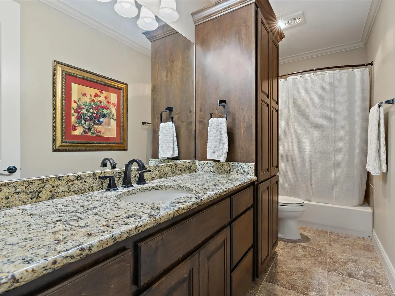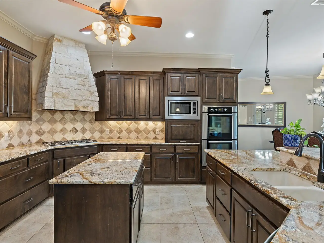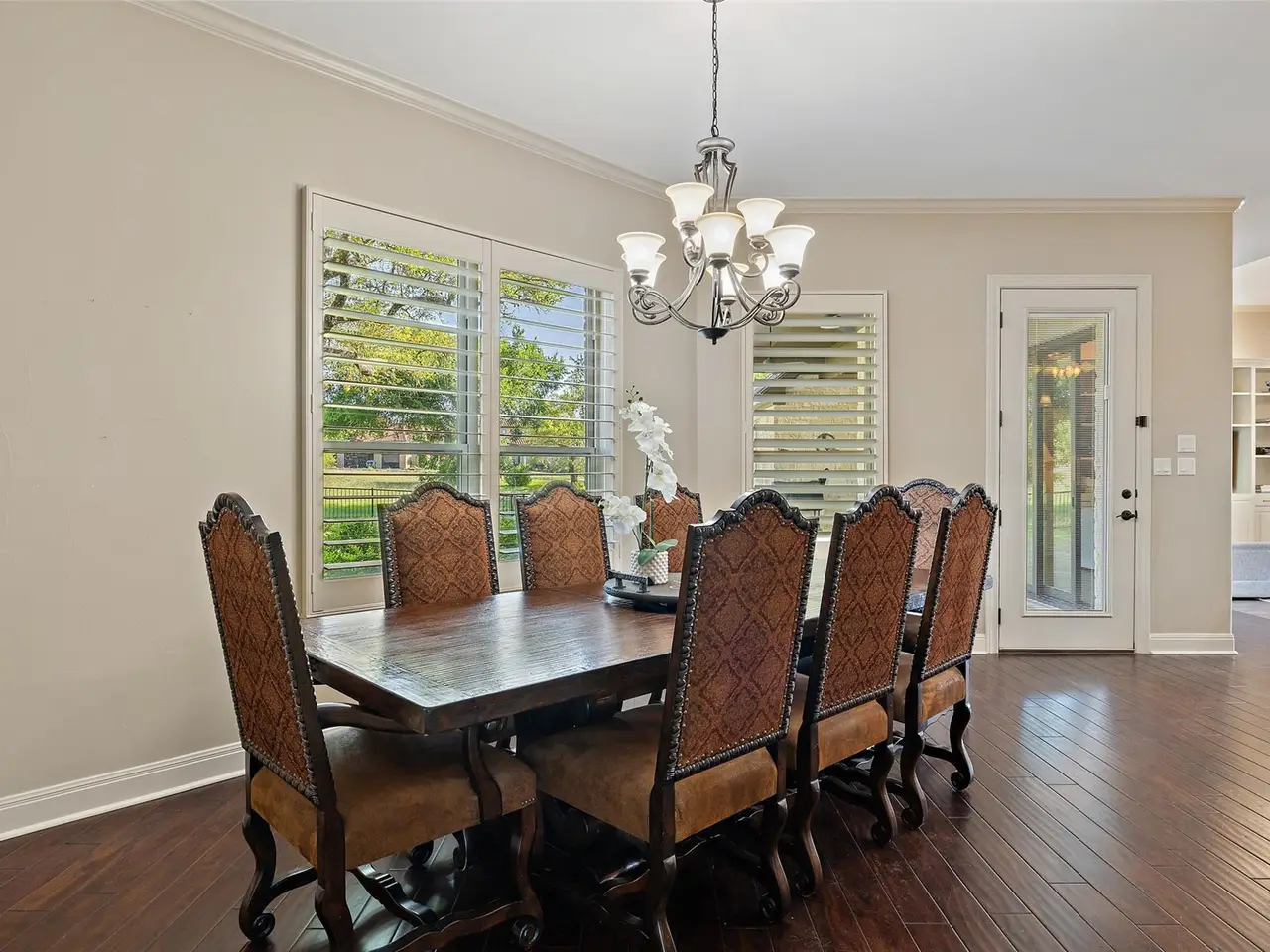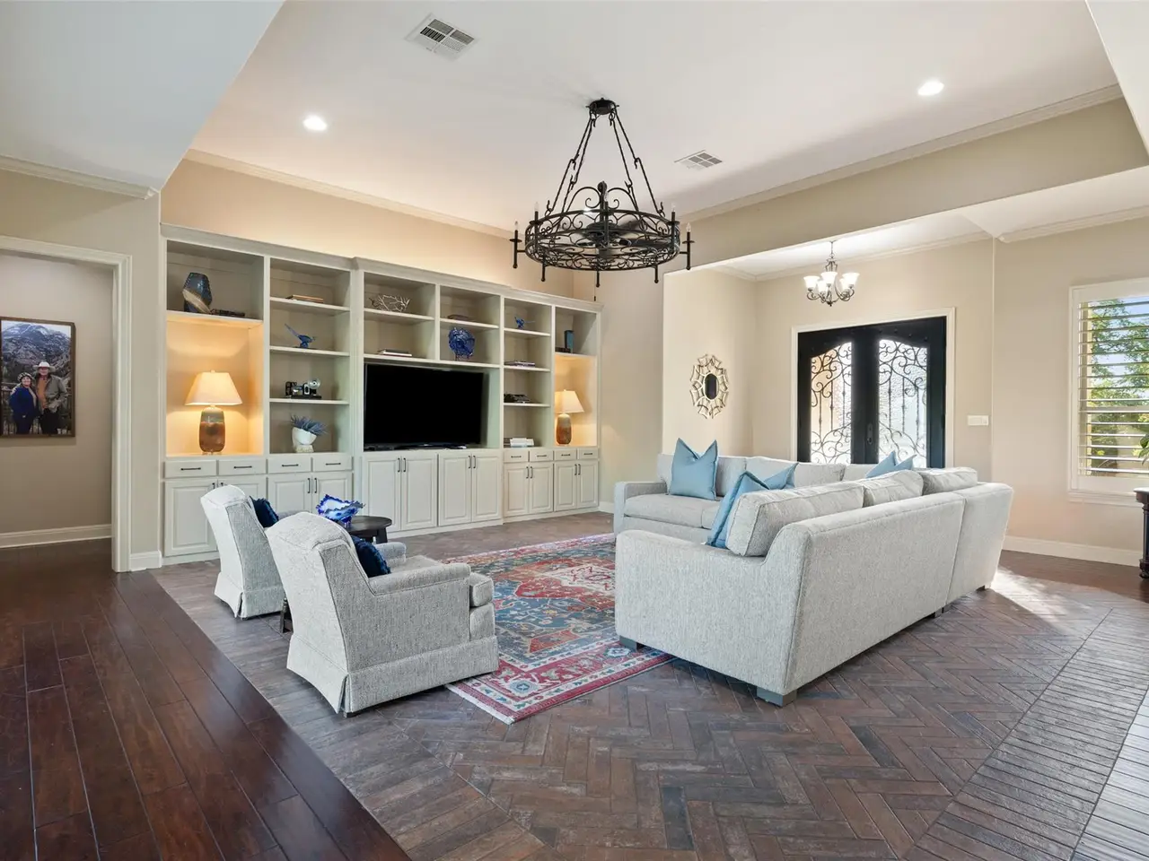 Located in the prestigious gated and guarded Barton Creek Lakeside community, this single-story custom home offers a seamless blend of Hill Country charm and modern comfort. Situated on a large 0.68-acre corner lot, the property is surrounded by mature oak trees and features a wide paver driveway and spacious covered patios perfect for outdoor living. The open-concept living and kitchen area is highlighted by a large center island, granite countertops, and wood shutters throughout. With an in-law floor plan and wide entryways, the home is designed for accessibility and ease of living. One of the bedrooms, located privately at the rear of the home, is ideal as a guest suite, office, or hobby space and includes its own bathroom & outdoor patio. Additional features include a 3-car attached garage, plantation shutters, a laundry room with utility sink, and beautiful wood and brick flooring. The expansive covered back patio and fenced yard provide a tranquil setting to enjoy the peaceful Hill Country surroundings. Barton Creek Lakeside offers access to a private country club with an 18-hole Arnold Palmer-designed golf course, fitness center, tennis courts, Olympic-sized pool, and Lake Travis access. Just a short drive to Spicewood and the surrounding Hill Country, this home combines quality construction, generous space, and resort-style amenities in a quiet, upscale community.