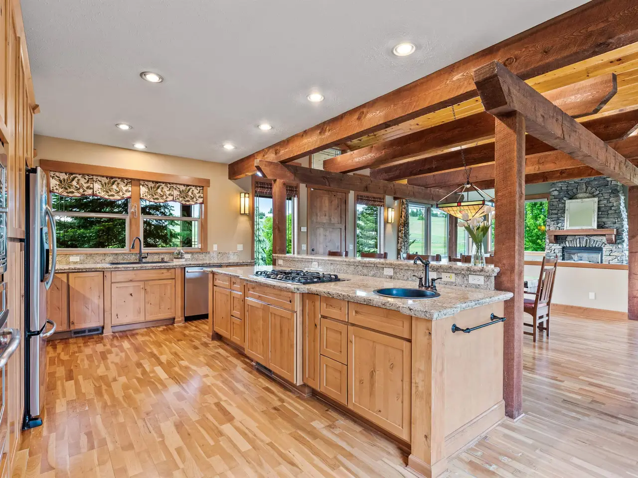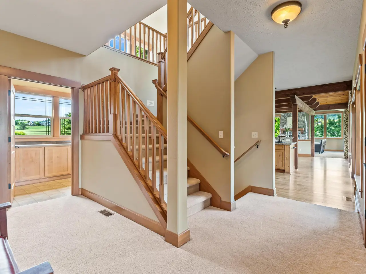 This stunning modern craftsman home, set on 10 acres, offers a unique blend of craftsmanship and contemporary design, creating a stylish yet functional living space while preserving the charm of the original style. An abundance of windows throughout showcases beautiful pastoral views, complemented by professional landscaping, fresh exterior paint, & breathtaking sunsets. The cozy atmosphere is enhanced by a striking stone fireplace, hardwood floors, exposed beams, and natural wood trim. The living, dining, and kitchen areas flow together seamlessly. The culinary kitchen boasts high-end stainless steel appliances, stone counters, two sinks, and a gas range. Main floor living includes a primary suite with doors leading to a patio, and an expansive laundry room offers ample storage. Upstairs, a versatile loft serves as an extra bedroom or reading nook, while the daylight lower level features two additional bedrooms, rec room, bar area and more storage. This remarkable home is a must-see!!