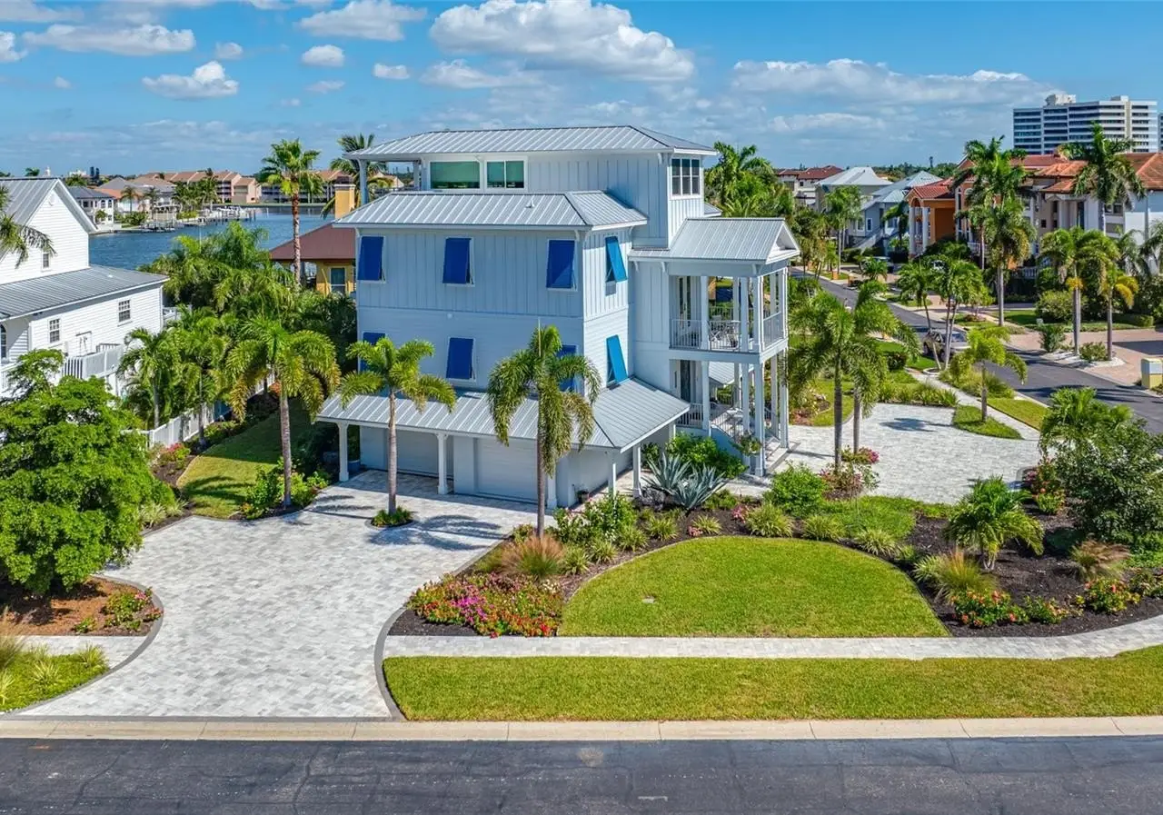 Welcome to this exceptional elevated Key West style 4-bedroom, plus rooftop bonus room, 4-bathroom, 4 car garage custom-built residence with breathtaking views of Boca Ciega Bay, in the prestigious gated Pasadena Yacht & Country Club. The home was completed December 30th 2021 to the highest coastal construction standards and thoughtfully designed to capture the panoramic and coastal views, while offering luxurious living across four levels, which are all serviced by a residential elevator. The grand staircase leads to the main entry with double front doors, setting the tone for the elegance and craftsmanship found throughout. On the first living level, you'll find three spacious bedrooms, including one with its own ensuite, a shared bathroom, a family room or study, and a laundry room. The 2nd living level features a large master suite with ensuite, an open-concept great room with surround sound, dining area, chef’s kitchen with pantry, and a guest bath. Crowning the home is a versatile Cupola on the 3rd level, perfect as an office, guest room, or entertainment area to soak in coastal views, spectacular sunsets, and holiday firework displays. This top-floor retreat is cooled by a dedicated mini-split AC unit. All floors have large balconies. The epoxy-coated garage level accommodates 4 cars plus a golf cart, includes a workshop area, hanging storage shelves, and is pre-wired for EV charging (3 vehicles). This home is packed with high-end features, including but not limited to: York high efficiency, low decibel cooling and heating pump, Lorex security cameras system, all house generator 22kw Generac (propane), 4 level residential elevator, all custom build wood cabinetry with Quartz countertops, automatic rainbird irrigation system via inground well, smart appliances, 250 gl inground propane tank and so much more. The home sustained NO flood damage during the 2024 hurricanes, underscoring its superior construction and resilience. Located within the serene, park-like Pasadena Yacht & Country Club, residents enjoy exclusive access to a world-class golf course, junior Olympic-sized pool, poolside bar/cafe, clubhouse restaurant, fitness center, tennis & pickleball courts, and private marina with boat slips (membership required). The charming coastal town of Gulfport is just a 15-minute walk away, offering boutique shopping, dining, and a popular weekly market. The home also enjoys convenient access to I-275, connecting you quickly to Tampa or Sarasota airports, Fort De Soto National Park, and the pristine beaches of St. Pete, Madeira, and Clearwater. This is more than a home, it's a lifestyle of coastal luxury, comfort, and community, perfect for families, retirees, and anyone seeking the best of Florida living.