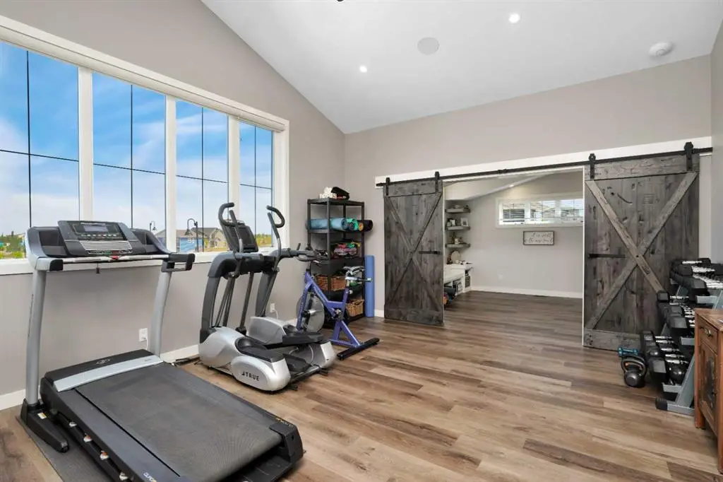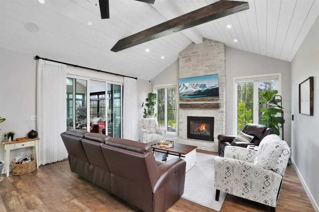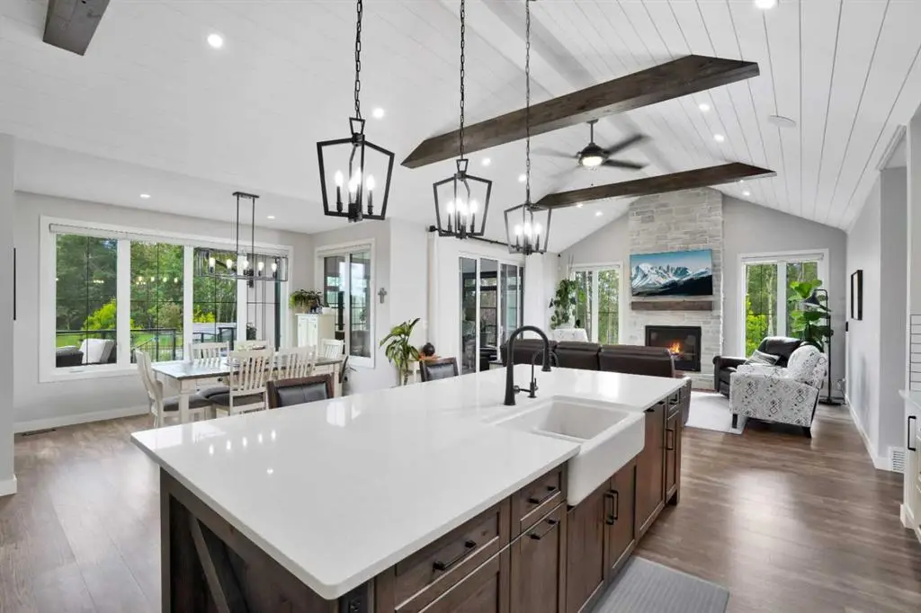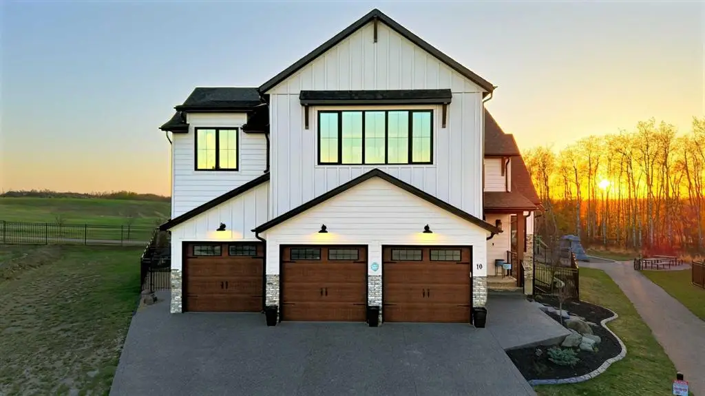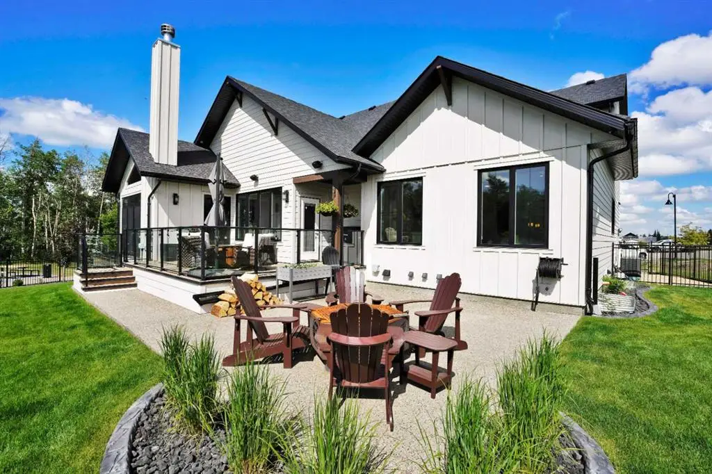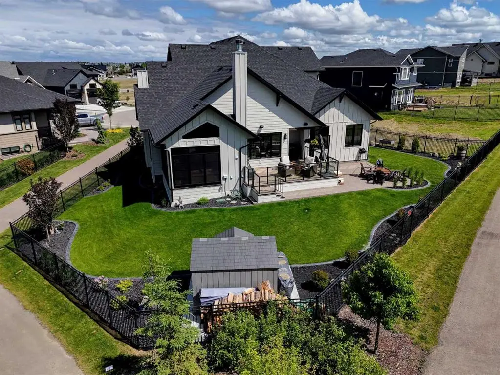 This extraordinary home in Sixty West redefines luxury living with a level of craftsmanship, space, and comfort rarely seen in Central Alberta. With over 3,400 square feet of above-grade living space, it offers a grand yet grounded experience. Soaring ceilings and expansive windows flood the main floor with natural light, framing views of surrounding parkland and walking trails. The expansive layout connects a thoughtfully curated dream kitchen to a warm, welcoming living area. The kitchen is both functional and stunning, with a massive island, premium appliances, and a hidden coffee bar and prep space, perfect for entertaining or everyday ease. Solid wood accents and barn doors add texture and charm throughout, including a quiet main-floor office. Seamlessly integrated into this space is a discreet feature door that opens to the crown jewel: a spacious, private primary retreat that feels more like a luxury spa than a bedroom. The enclosed sunroom with a wood-burning fireplace offers year-round comfort perfect for last-minute get-togethers or quiet mornings with a coffee and a good book. Upstairs, there’s plenty of space to stretch out for yoga, weight training or even host golf nights on your private golf simulator. A wet bar and full bathroom complete the upper floor. The lower level is designed for connection and fun, with a full-sized bar, spacious media room, games areas, and two large bedrooms with private ensuites, perfect for visitors or teenagers. Outside, a fully landscaped, manicured yard with underground sprinklers and multiple decks maximizes outdoor living. The heated three-car garage features a secure dog run and an indoor wash station. Built to an exceptional standard and thoughtfully designed for effortless living, this home offers beauty, comfort, and opportunity in one of Sylvan Lake’s most coveted neighborhoods. This one-of-a-kind home is on a level of its own.
