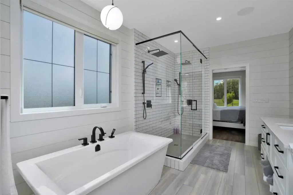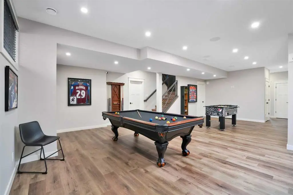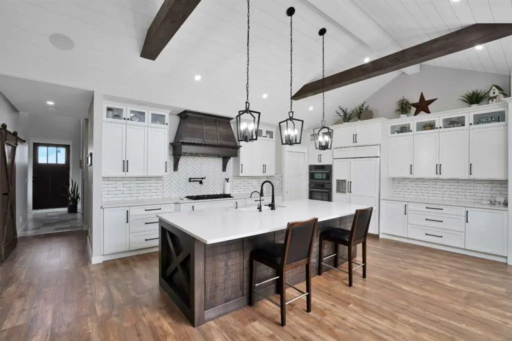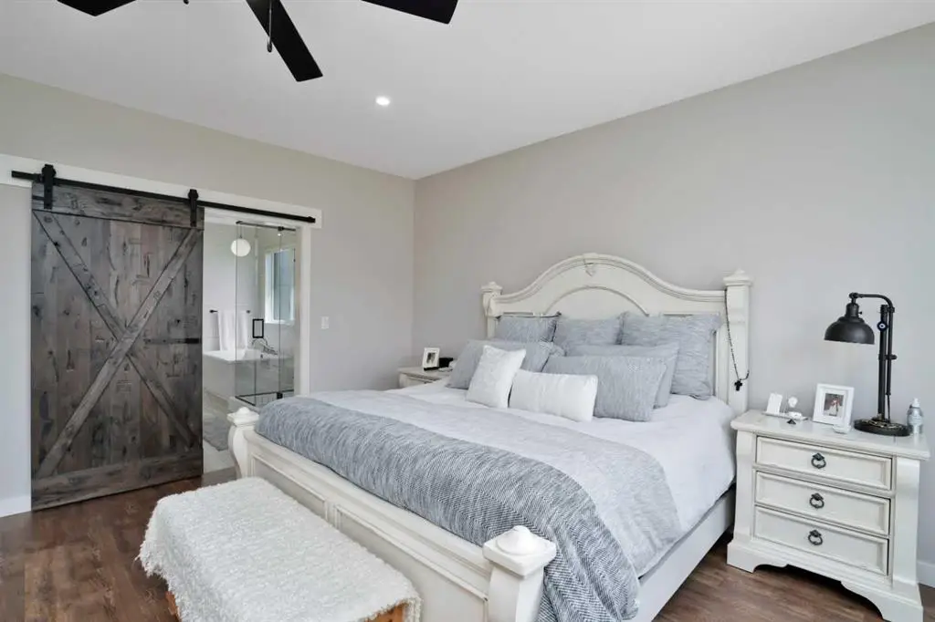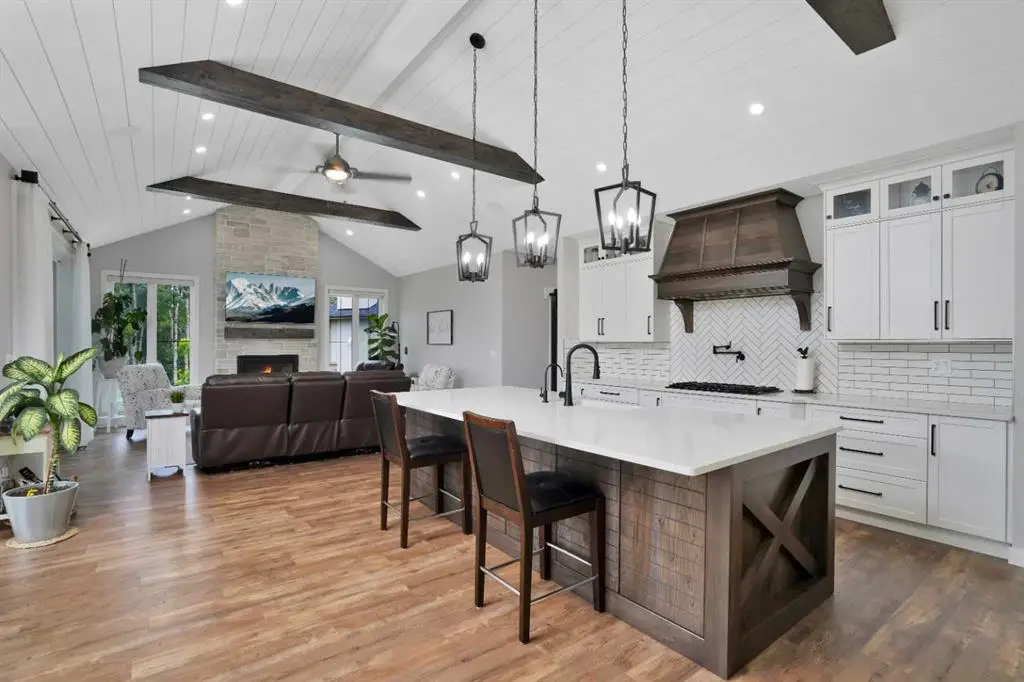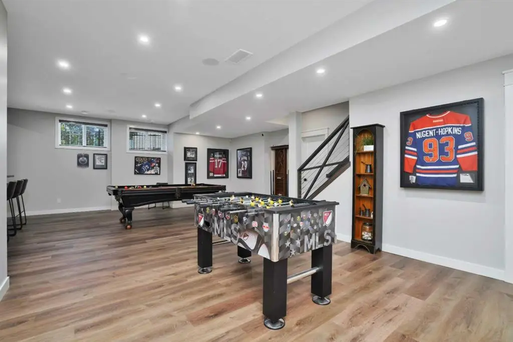 This extraordinary home in Sixty West redefines luxury living with a level of craftsmanship, space, and comfort rarely seen in Central Alberta. With over 3,400 square feet of above-grade living space, it offers a grand yet grounded experience. Soaring ceilings and expansive windows flood the main floor with natural light, framing views of surrounding parkland and walking trails. The expansive layout connects a thoughtfully curated dream kitchen to a warm, welcoming living area. The kitchen is both functional and stunning, with a massive island, premium appliances, and a hidden coffee bar and prep space, perfect for entertaining or everyday ease. Solid wood accents and barn doors add texture and charm throughout, including a quiet main-floor office. Seamlessly integrated into this space is a discreet feature door that opens to the crown jewel: a spacious, private primary retreat that feels more like a luxury spa than a bedroom. The enclosed sunroom with a wood-burning fireplace offers year-round comfort perfect for last-minute get-togethers or quiet mornings with a coffee and a good book. Upstairs, there’s plenty of space to stretch out for yoga, weight training or even host golf nights on your private golf simulator. A wet bar and full bathroom complete the upper floor. The lower level is designed for connection and fun, with a full-sized bar, spacious media room, games areas, and two large bedrooms with private ensuites, perfect for visitors or teenagers. Outside, a fully landscaped, manicured yard with underground sprinklers and multiple decks maximizes outdoor living. The heated three-car garage features a secure dog run and an indoor wash station. Built to an exceptional standard and thoughtfully designed for effortless living, this home offers beauty, comfort, and opportunity in one of Sylvan Lake’s most coveted neighborhoods. This one-of-a-kind home is on a level of its own.