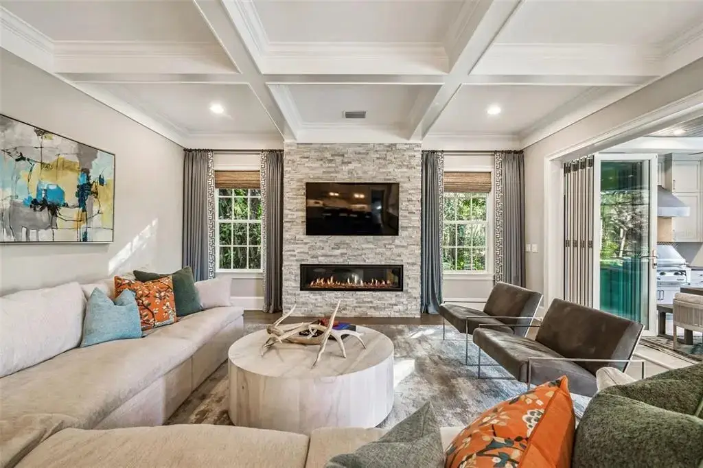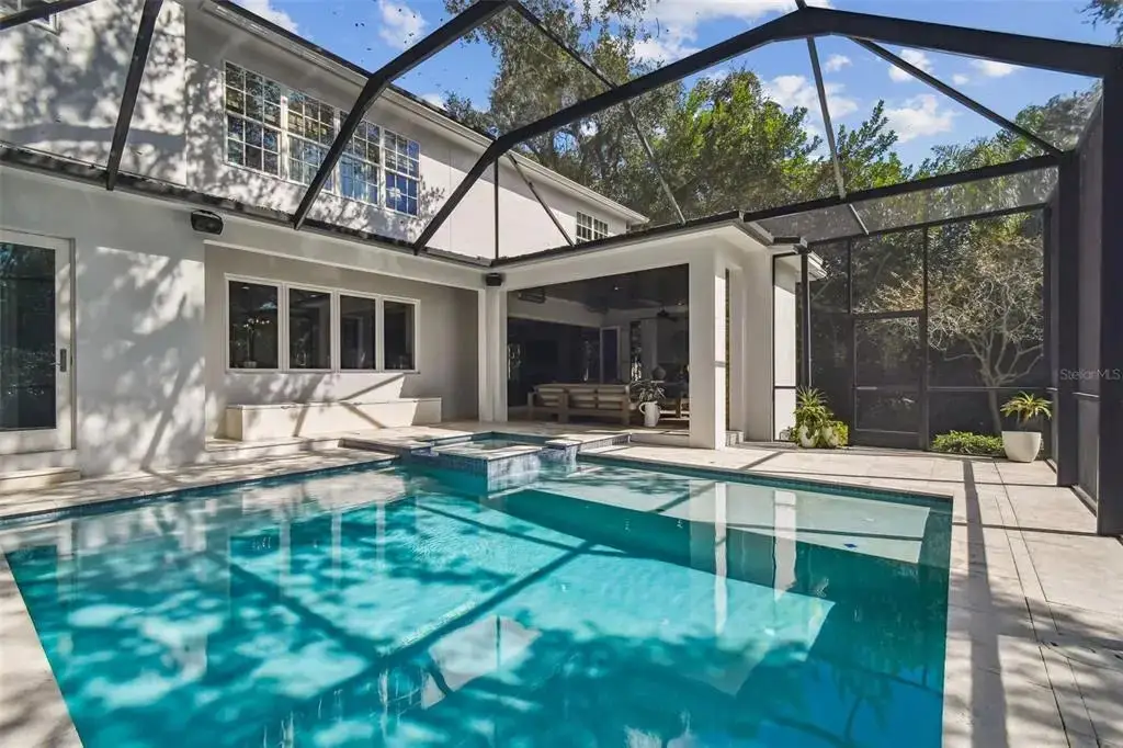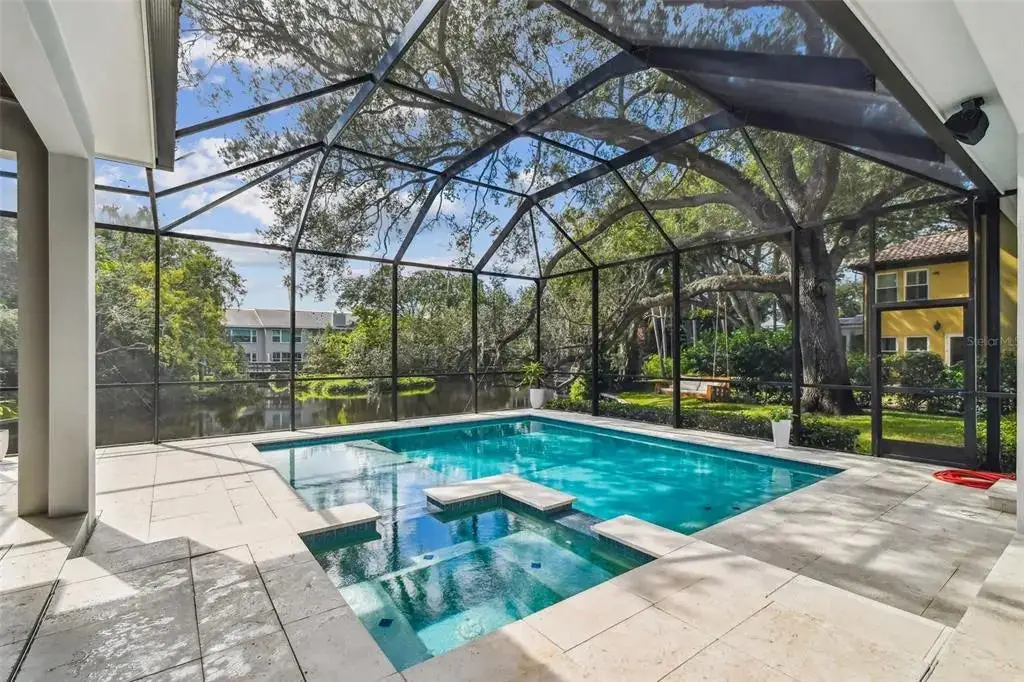 Welcome to this stunning, sophisticated and impeccably maintained South Tampa home, custom-built by Bayfair. Set on almost half an acre, this exquisite, one-of-a-kind property offers a rare, tranquil retreat with its Audubon-like pond setting replete with natural beauty. Step inside, and you'll be struck by the elegance of this home’s artfully-designed, light-filled spaces, starting with a spacious foyer, library/study to the left and a formal dining room to the right with ample space for entertaining. The open living/kitchen floor plan boasts a warm, inviting atmosphere and is brimming with both functional and aesthetic details. Highlights include an all-glass, fully-retractable Nano-wall that seamlessly expands interior living space into the exterior screened-in lanai; coffered ceilings; stone wall accents and gas fireplaces in both interior and exterior living spaces; climate-controlled 500+ bottle wine cellar, wet bar with ice maker and much, much more. The eat-in kitchen is has all the upgrades including top-of-the-line Thermador appliances, custom wood cabinetry and beautiful marble counters – plus incredible light and views from the large windows overlooking the pool and pond and a large walk-in pantry. Downstairs also boasts a spacious office/playroom with even more gorgeous views of the pond and mud-room area; two half-baths (one of which comes with a full size washer & drier) and hidden media closet to access your smart-home Control4 powered A/V and security systems. Choose either elevator or a beautiful wooden stairway to discover the 2nd floor, on which you'll find the master suite, complete with automated black-out curtains, a luxurious garden tub, large walk-in shower, dual sink vanities, and 2 oversized walk-in custom closets. Three additional en-suite bedrooms provide plenty of space for family or guests. With an additional full-size laundry room + plentiful storage closets (and storage room off master suite) – this home truly ‘has it all’. Step outside, and discover a true oasis from the screened-in, back patio / pool area – spacious enough for grilling and entertaining or simply perfect for a peaceful evening while overlooking the magnificent pond. Whether you cool off in the pool or spa during summers, or cozy up to the fire and built-in heaters during winter – you’ll be able to enjoy your exterior space and views year-round. This luxurious South Tampa gem simply has it all - a perfect blend of elegance, comfort, and convenience. Additional upgrades include a full-house powered natural gas home generator, custom blinds and window treatments, beautiful textured wall coverings, and so much more. Book your private tour today and experience it for yourself!