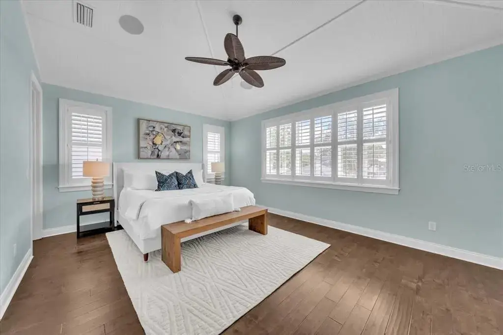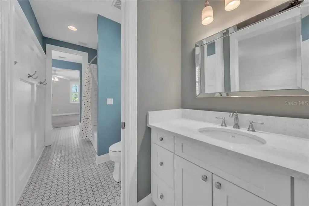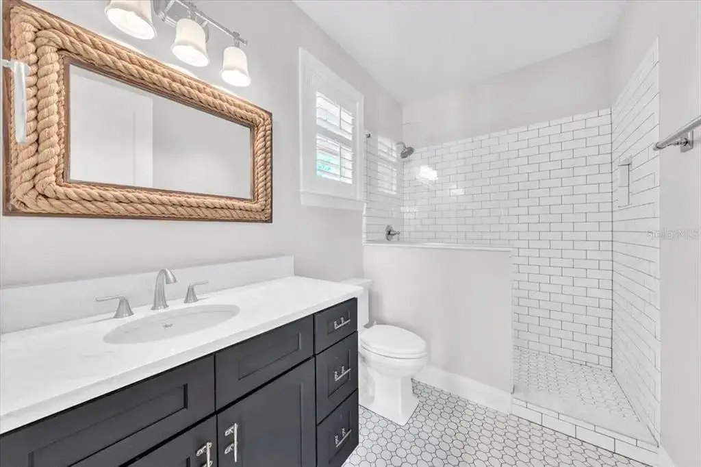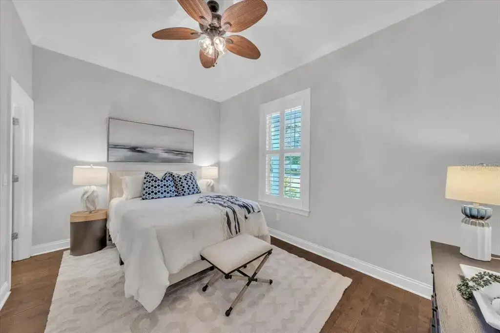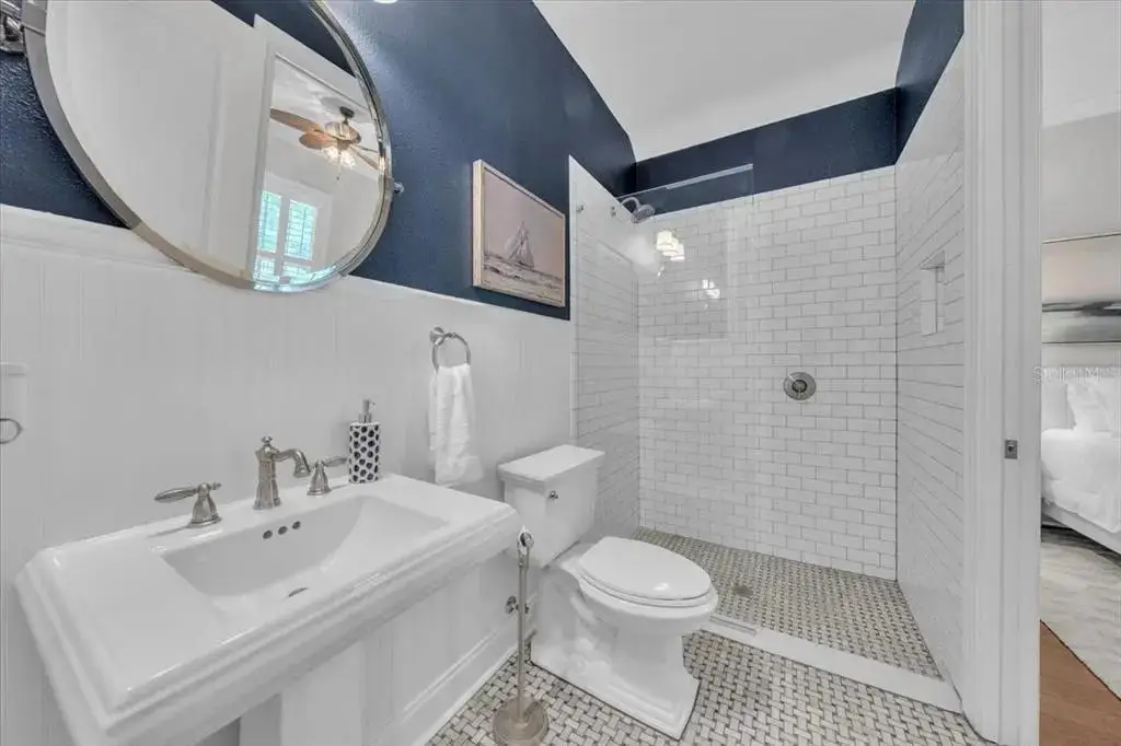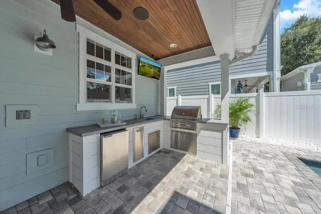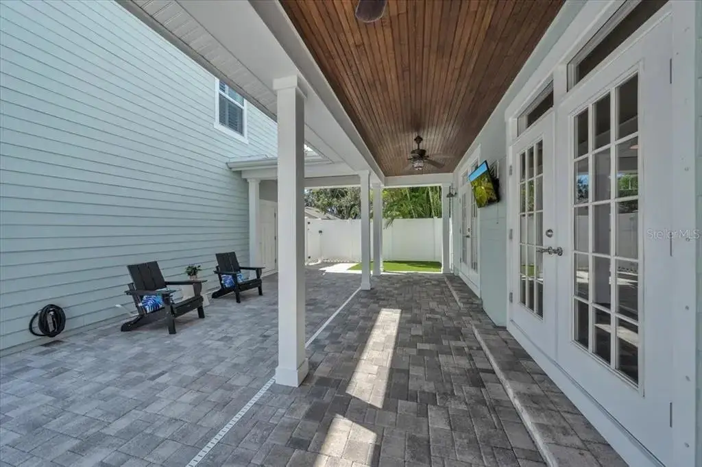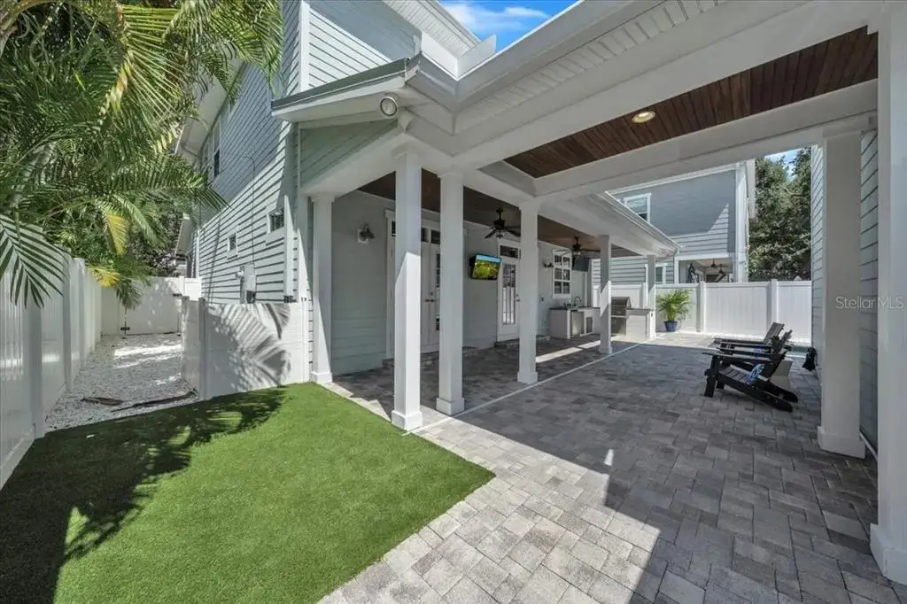 Under contract-accepting backup offers. This timeless Key West Craftsman, built in 2016, sits proudly on a corner lot in the heart of Palma Ceia. With 3,004 sq ft of living space, this home offers an open-concept design, high ceilings, and a detached garage topped by a private guest suite complete with full bath and kitchenette. You'll enjoy peace of mind knowing that this residence sits in flood zone X with no impact from last year's hurricanes. The first floor features a welcoming font porch with Bevolo gas lanterns wood-detailed ceiling, and swing, a flexible office or formal dining room, and a guest suite with private bath and walk-in closet. The spacious living area centers around a gas fireplace with custom built-ins and flows seamlessly into the chef's kitchen, boasting Quartz countertops, 6-burner Wolf gas range, large prep island, wine fridge, and butler's pantry. Upstairs, the Owner's Retreat includes vaulted beadboard ceilings, dual walk-in closets, and a spa-like bath with double vanities and a walk-in shower. Two additional bedrooms share a Jack & Jill bath. The outdoor living area is designed for entertaining, complete with a 10x25 saltwater pool, outdoor kitchen and full pool bath. Additional features include hardwood floors, marble tile in baths, plantation shutters, surround sound with outdoor speakers, camera system, and custom closets. Located in one of South Tampa's most desirable neighborhoods, this home offers a rare combination of craftsmanship, modern upgrades, and indoor-outdoor living.