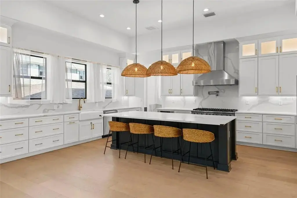 Built in 2022, this stunning 5-bedroom, 5.5-bath, 4,451 sq. ft. pool home offers modern luxury just steps from Davis Islands Village and minutes from Downtown Tampa. Elevated 12 inches above FEMA base flood elevation, the home remained high and dry with no water intrusion during both Hurricane Helene and Hurricane Milton—providing rare peace of mind. Designed with an open floor plan, the home features 12’ ceilings, wide-plank French oak flooring, and large impact-rated windows throughout. The gourmet kitchen includes Viking appliances, quartz countertops, walk-in pantry, and custom cabinetry. The great room showcases a linear gas fireplace and a climate-controlled wine room. A first-floor guest suite with private bath and dry bar offers ideal flexibility for use as a home office or in-law suite. Upstairs, the spacious primary suite includes two custom walk-in closets and a luxurious bath with a vessel tub and oversized shower. Three additional en-suite bedrooms and a bonus room complete the second floor. Enjoy year-round outdoor living with a covered lanai, built-in summer kitchen, and a resort-style pool with sun shelf and spillover spa. Additional highlights include a 2-car garage, tankless water heaters, upstairs storage room, and custom closet systems throughout.