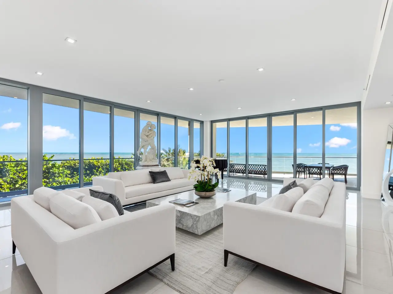 Exceptional opportunity to own this luxurious designer residence at the prestigious SeaGlass Condominium on Jupiter Island offering sweeping, uninterrupted ocean views. Completed in 2022 as the first new condominium development on Jupiter Island in over 20 years, SeaGlass offers just 21 exclusive residences, promising unparalleled luxury, remarkable vistas, and exceptional privacy. Set amidst the pristine beauty of the ocean, Intracoastal Waterway, and lush protected landscapes, Residence 302 is a masterpiece of modern design. Entering through your private foyer, you are welcomed by an expansive open floor plan with lavish marble flooring and floor-to-ceiling glass, providing panoramic views from the ocean to the Intracoastal. SEE MORE REMARKS... This residence includes three bedrooms, four and a half bathrooms, and a den, with each bedroom featuring an ensuite bath, walk-in closets, and stunning views. Additional features include three large terraces, a summer kitchen, imported Italian solid core wood interior doors and casings, 10-foot ceilings, recessed down lighting, and imported Snaidero cabinetry with integrated task lighting. The kitchen boasts a professional-grade stainless steel ventilation hood by Snaidero, top-tier appliances, a cabinet-paneled freezer column, a full-height Miele wine column with glass and cabinet panel front, and two Miele dishwashers. The master suite offers direct terrace access, dual walk-in closets, separate bathrooms with steam showers and frameless glass enclosures, imported marble, Italian wall-mounted vanities, and designer mirrors and lighting. The SeaGlass building offers an impressive range of amenities, including a gated entrance, a 24/7 attended lobby designed by Champalimaud Design, an emergency generator, a heated oceanfront infinity-edge pool, a sandy beach with chaise lounges, two gated stairways to the beach, a beachside summer kitchen, an outdoor viewing terrace, a heated spa, a full-time property manager, a fitness center, a yoga meditation lawn, a club room with a catering kitchen and game area, an outdoor social terrace with BBQs and a fire pit, a dog walk area and bathing station, a package room with keypad access, and a dedicated bike storage area. This one-of-a-kind property offers the rare chance to embrace the ultimate in coastal luxury living.