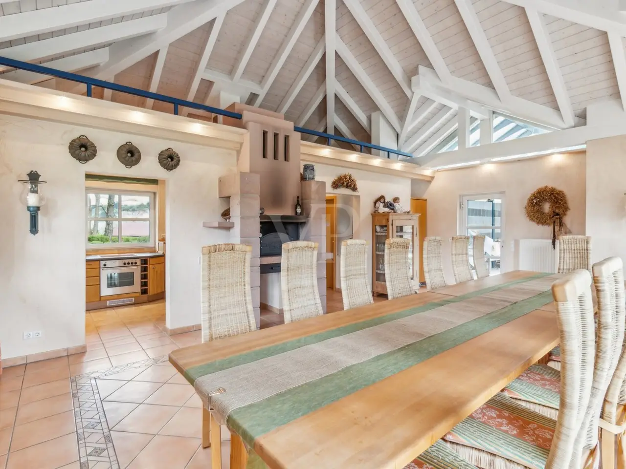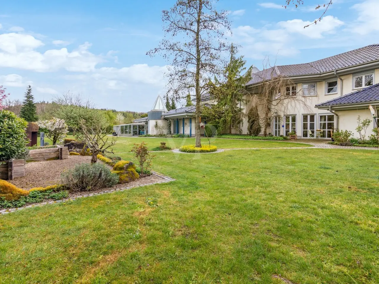 VON POLL IMMOBILIEN Zweibrücken presents this exclusive villa property that leaves nothing to be desired. The slightly elevated position not only gives you a magnificent view, but also the desired degree of privacy. The almost 10,000 m² plot of land, the beautifully landscaped garden with herb beds, greenhouse and private pond, the extremely generous amount of space, the high-quality furnishings with custom-made fittings and the private spa and wellness area are just some of the highlights that make this offer unique. The stylish property was built in 1997 and impresses with its well thought-out and versatile floor plan. The elegant combination of high-quality materials, such as the granite and wooden floors, has created a particularly pleasant living atmosphere despite the spacious rooms. The living space of more than 600 m² offers a wide range of possibilities for individual design. Spread over three levels, the spacious windows provide plenty of light and an impressive view of the greenery. The elegant living area is connected to a high-quality kitchen with its own cold storage room and large pantry and offers direct access to one of the numerous terraces. The transition from the dining room to the living area is seamless and forms the heart of the house with a fireplace room, a further dining/tea area and the classic living room. When the weather is nice, the open gallery area with its glass roof can be connected almost seamlessly with the outdoor area thanks to large sliding doors. The covered terrace leads you to a 50 m² outbuilding which is equipped with a kitchen and a large pizza oven - the ideal place for larger parties. Another outbuilding in the western part of the property is currently used as an office. Both are equipped with sanitary installations, making it conceivable to convert them into a separate apartment for an au pair or family. The bedrooms are located one level higher. The master bedroom has a dressing room, an en-suite bathroom and a further tower room. There is also a bathroom for the two children's bedrooms. The floor can be reached via two staircases. This makes it possible to separate the parents' and children's or guest areas if required. The wellness area with a large swimming pool, whirlpool, sauna, steam bath and a fitness room with glass windows overlooking the garden is certainly a very special highlight. Thanks to the short distances, the sports and relaxation program can be easily integrated into the daily routine. A generous number of parking spaces, both open and closed, and additional cellar rooms round off the offer. We will be happy to answer your initial questions in advance by telephone on 0 63 32 - 90 57 477 or in our store at Homburger Straße 40 in Zweibrücken or send you the detailed exposé by e-mail.