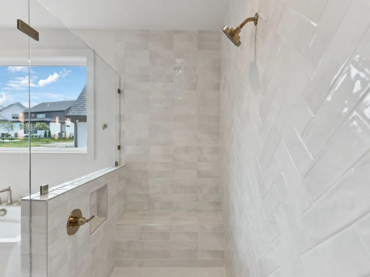 Floor-to-ceiling tiled shower in one of three full bathrooms
