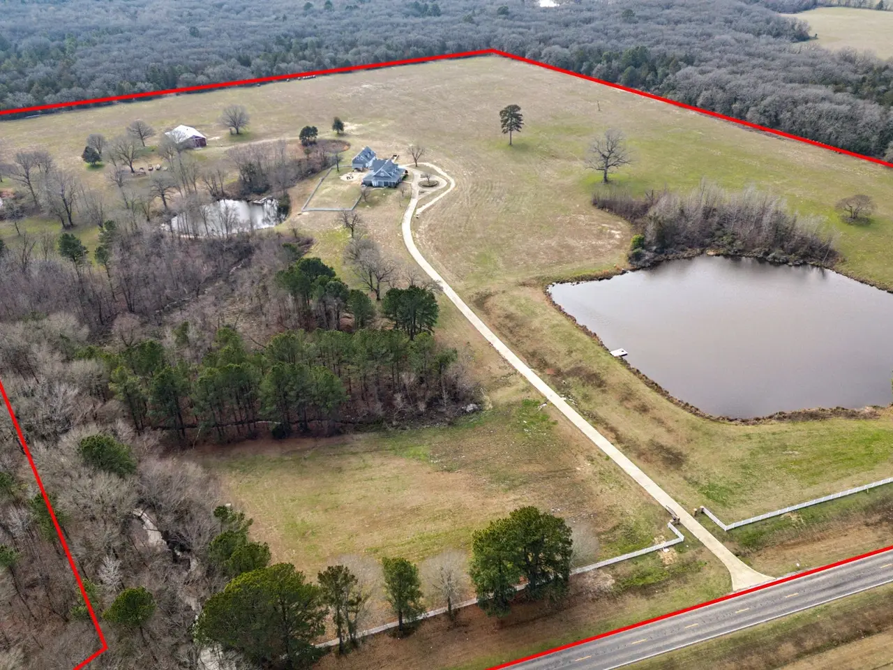 Welcome to Happy Trails Ranch in Quitman, Texas. A luxurious 50 acre estate that has breathtaking views of nature and East Texas wildlife. 3 private stocked ponds with live water and rolling sandy loam terrain. Towering oak and pine trees line the property making it very secluded and private. Impeccably built and extensively renovated with high end designer finishes, this property has all the bells and whistles. Multiple living areas, high ceilings, screened in porch and so much more. Gourmet Subzero and Wolf kitchen with ample storage and open to living areas is perfect for getting together with family and friends. Marble countertops, custom cabinetry, and high end luxury finishes. Flowing floor plan and open living areas with a stunning primary suite and a guest bedroom on the first floor. Additional 4 car garage built in 2019 has a 543 sqft guest suite. 3500 sqft insulated barn built in 2019. Ag exempt. This property has it all! Call listing agent Melissa Oates for video links. Seller financing available!