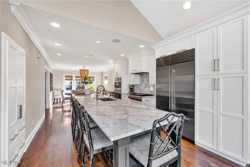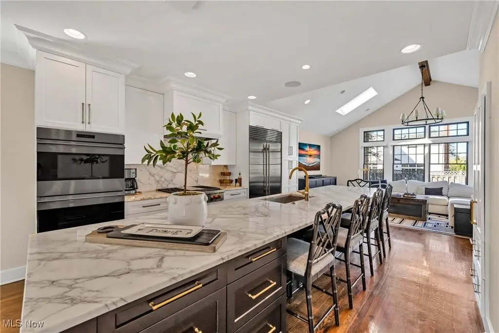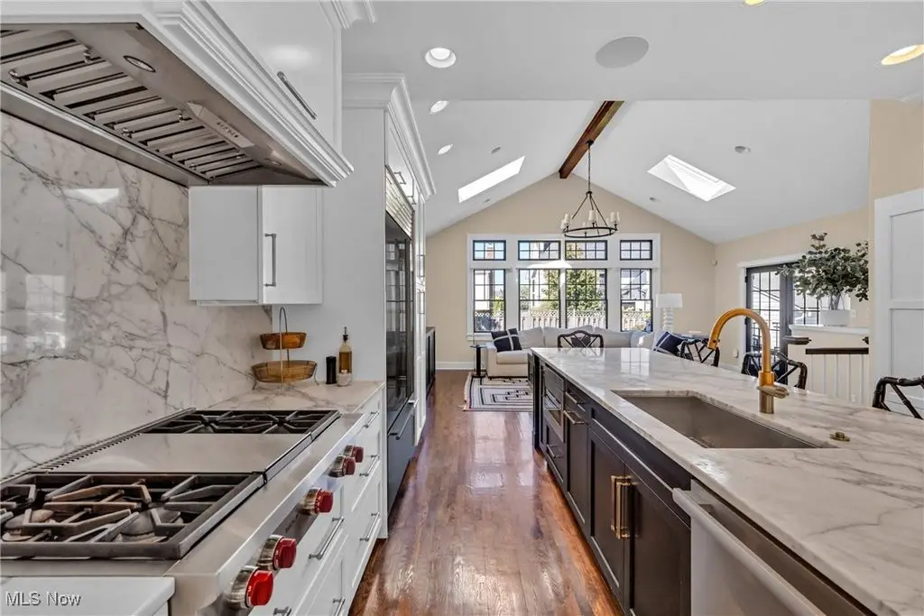 Welcome to this stunning 4 bed, 3.5 bath Colonial in the heart of Beachcliff, just steps from the lake. Completely transformed over the past several years, this home offers a perfect blend of style, function, and quality craftsmanship. Every inch reflects thoughtful design and attention to detail. Step inside to a warm and inviting living room centered around a beautiful fireplace, ideal for relaxing or entertaining and a nearby office or sunroom. The fabulous kitchen is a true showstopper, with an oversized island that opens seamlessly to the vaulted family room and dining area, creating an effortless flow for gatherings. The main level also features a convenient office space and a redesigned half bath, both as practical as they are stylish. Throughout the home, you'll find refinished hardwood floors, plantation shutters, new millwork, and a Sonos sound system for a cohesive, elevated living experience. Upstairs, the luxurious primary suite was expanded and a spa-like bath with a stunning walk-in shower and dual vanities was added, as well as a walk-in closet. 2 additional bedrooms are serviced by the renovated hall bath. A full bath was added on the third floor, creating the perfect guest or teen suite. The lower level has been transformed into a spacious recreation room, ideal for movie nights or gamedays, or gaming. Outside, enjoy the Trex deck overlooking a professionally landscaped yard, the perfect setting for outdoor living. Additional upgrades include the addition of A/C with two units for year-round comfort and countless upgrades that make this home truly move-in ready.