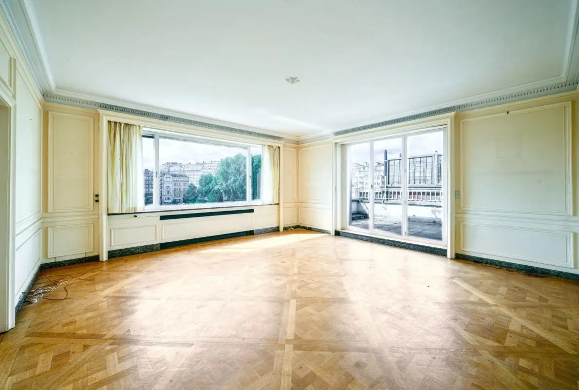 In one of the most elegant buildings in Ixelles, on the edge of the Jardin du Roy, on the 7th floor with a large terrace of +/- 50 m², superb apartment of +/- 275 m² enjoying extraordinary views and a perfect south-facing orientation. Beautiful reception rooms, fitted kitchen, 3 bedrooms, 2 bathrooms. Cellar, wine cellar. Garage. EPC F