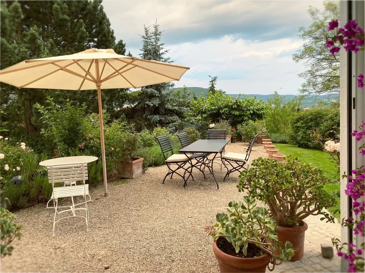 • Landscaped garden with pond and "apple tree parasol"