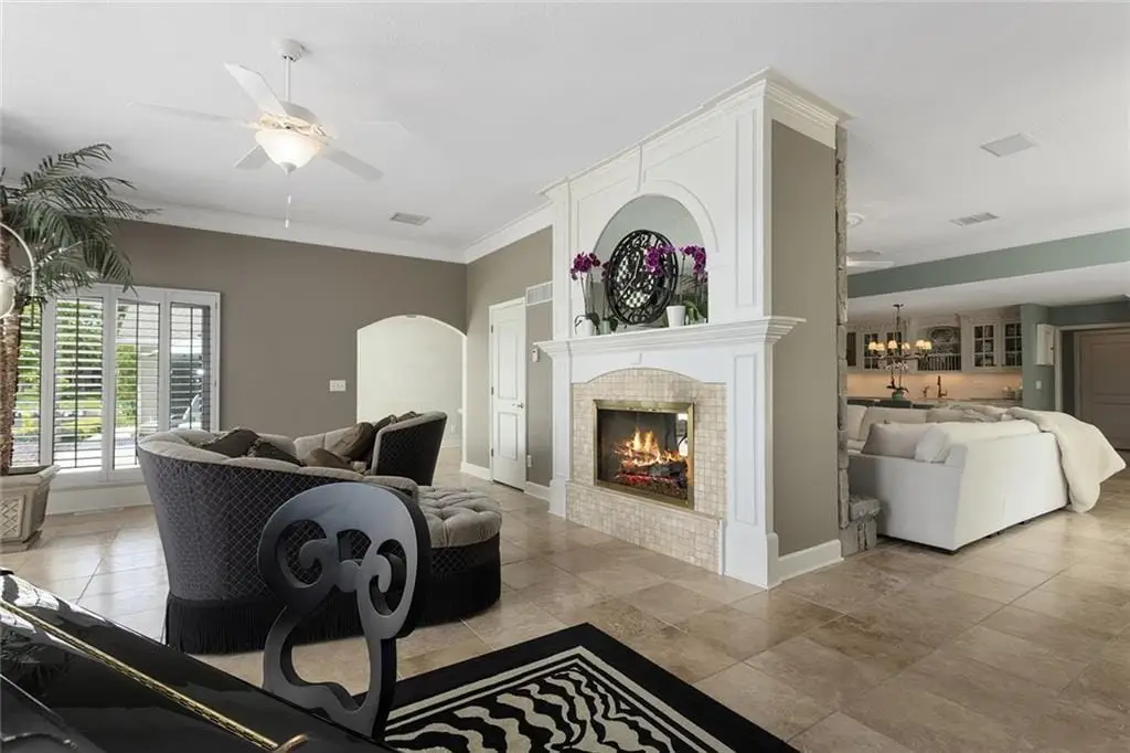 Tucked away on one of the most coveted lakefront lots in the Northland, this one-of-a-kind, custom-built home was thoughtfully designed by an interior designer to take full advantage of its breathtaking views. Nearly every room in this meticulously maintained residence has water views. Step into the grand foyer where soaring columns and faux marble accents set an elegant tone. From there, a second entry welcomes you with a barrel-vaulted, hand-painted ceiling and sweeping lake views that draw you further into the heart of the home. The French country-inspired kitchen is a dream for any entertainer or home chef, featuring a hand-selected marble island, custom cabinetry, a cozy stone fireplace, built-in entertainment center and desk, and an all-glass breakfast room with arched windows overlooking the lush, landscaped yard with multiple water features. The hearth room flows into a spacious living room with a see-through fireplace, a wall of glass framed with plantation shutters. The primary suite is a peaceful retreat with patio access, high ceilings, custom built-ins, upgraded carpet, and plantation shutters. The ensuite bath offers a spa-like experience with a dome ceiling over the soaking tub, walk-in shower, and dual vanities. A second bedroom also has direct patio access and features elegant travertine floors. Recently added second living quarters include a full gourmet kitchen, living area with built-ins, breakfast nook, second master suite with luxurious bath, large walk-in closet, and even a second laundry room, perfect for guests, in-laws, an adult child, or anyone looking for privacy and independence. The space also features its own private entrance. Additional highlights include a spacious three-car garage with high-end epoxy floors, a private dock with a pontoon boat included, full irrigation system, expansive patio and deck spanning the length of the home, and professional landscaping throughout. This is more than just a home - it's a lifestyle.