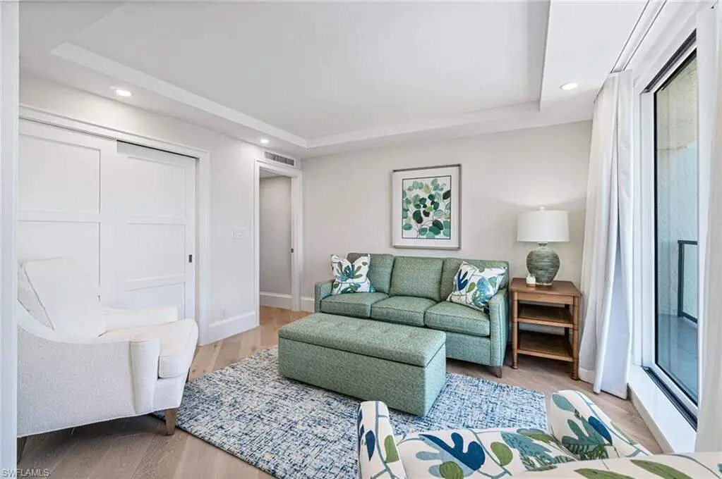 Experience the ultimate in modern coastal living in fully redesigned 3 bedroom, 3 full bath residence at The Meridian Club, one of Park Shore's most prestigious beachfront addresses. Perched on the 15th floor, this turnkey designer condo offers sweeping views of both Venetian Bay and the Gulf of Mexico - a true Naples retreat for discerning buyers relocating from "up North". The chef-inspired kitchen is a showpiece, featuring a Thermador appliance package with induction cooktop, built-in drawer microwave, and all stainless steel appliances. Elegant white cabinetry, quartz countertops, a white and gray herringbone backsplash, and high-end fixtures create a clean, coastal aesthetic. A breakfast bar for two adds casual dining space, while the complimenting wet bar with navy cabinetry, glass display, and patterned tile backsplash makes entertaining effortless. Designed by Diane Torrisi Designs and Kevin Steffanni Design Group, the home features wide-plank wood flooring, stepped ceilings, frosted glass and solid doors, and an open, light-filled layout leading to an expansive wraparound balcony with updated glass railings and a glass-enclosed seating area perfect for sunset views. The primary suite is a sanctuary with three custom closets, mirrored doors, and a spa-style bath with multiple shower heads. Two en-suite guest bedrooms offer refined comfort and privacy. High end designer furnishings, electric shades, custom draperies, and mounted TVs complete this elevated retreat. The Meridian Club sits on 3.5 acres of beachfront with only four units per floor. Enjoy a 24-hour doorman, resort-style pool and spa overlooking the Gulf, tennis and pickleball, outdoor grill area, and direct access to Naples' white-sand beach. Located minutes from Venetian Village's fine dining and boutique shopping, this home embodies effortless beachfront sophistication. Turnkey. Renovated. Ready for your Naples lifestyle.