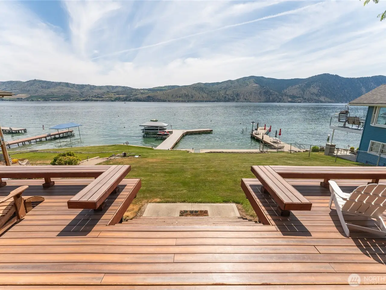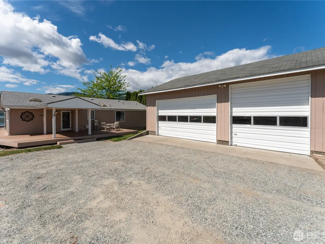 Welcome to 34 Leisure Lane! This rare .9-acre property boasts 56 feet of low bank waterfront with a concrete bulkhead and stairs to a sandy beach. Enjoy a resurfaced shared dock and a stunning, newer lake-facing deck off a charming three bed, two bath, 1,300 square foot home. Two lots (front and back) offer exceptional flexibility and space, including a three-bay shop, four RV hookups, and tons of parking. Mostly flat with a gentle slope - perfect for outdoor living and future development/building. Prime location with easy, level access off a paved road. On sewer, with LCRD domestic water and irrigation. One of the nicest stretches of real estate on Lake Chelan & amongst some incredible new homes and remodels. House plans by Complete Design can be included!