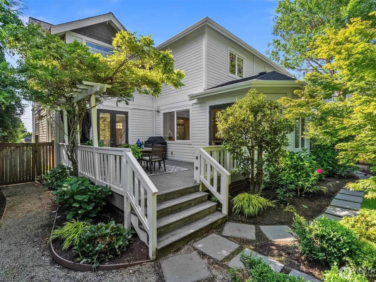 This timeless East of Market home offers 4 bedrooms, 4 baths, and blends refined design with thoughtful updates. The open floor plan features a remodeled kitchen with quartz and porcelain surfaces, high-end appliances, and classic finishes. Expansive windows and updated lighting create a bright, elegant feel. All bedrooms are located upstairs, including a private ensuite. The lower level includes a spacious bonus room - ideal for a media room, gym, and a potential 5th bedroom. Set on a quiet street with a beautifully landscaped private backyard and an upper deck showcasing lake, city, and mountain views. Includes an EV charger and attached garage. Just minutes to Google, Peter Kirk Elementary, Marina Park, and downtown Kirkland.