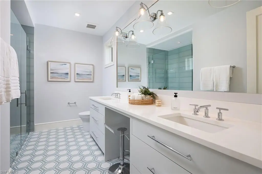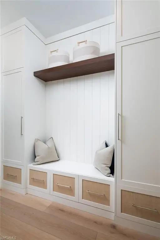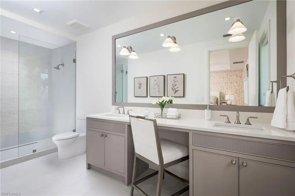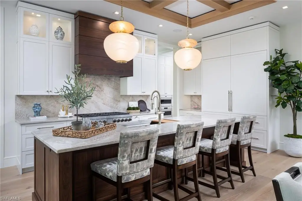 Showcasing light and breezy seaside-inspired aesthetics complemented by warm natural wood tones, this newly constructed masterpiece by Wilbrett Construction Company is a testament to exceptional craftsmanship. Designed with sophistication by Kukk Architecture and finished with the exquisite touches of Freestyle Interiors, this home spans approximately 6585 square feet of meticulously planned living space, adorned with luxury features at every turn. Step into a grand great room where intricate ceiling details add a touch of artistry and seamlessly flow into the chef's kitchen complete with custom cabinetry and a well-appointed butler's pantry. Adjacent to this central space, a wet bar and temperature controlled wine cellar perfectly complement a spacious study, offering a refined retreat with custom cabinetry that harmonizes functionality and elegance. The main-floor primary suite offers tranquil water views and a spa-inspired bath featuring a freestanding soaking tub and a walk-in shower. Upstairs, four generously sized ensuite bedrooms encircle a central living area, which includes a wet bar and access to an extended balcony that captures spectacular wide water vistas. Outdoor living is a dream come true with a resort-style infinity-edge pool, soothing spa, and sun shelf, surrounded by a covered loggia outfitted with remote controlled screens and shutters. A stone-clad fireplace creates a cozy ambiance, while the outdoor kitchen makes hosting gatherings effortless and enjoyable. Ideally situated on the waters of Egret Channel, with its prime location at the intersection of Heron Cove and Gull Cove, the property takes full advantage of sweeping water views. Boating enthusiasts will appreciate the deep-and wide water frontage, ideal for navigable access. This serene setting is also just moments from Naples' pristine white sandy beaches and the shops and restaurants of Third Street south. This thoughtfully designed residence embodies the quintessential Florida lifestyle, offering a rare blend of elegance, comfort, and functionality.